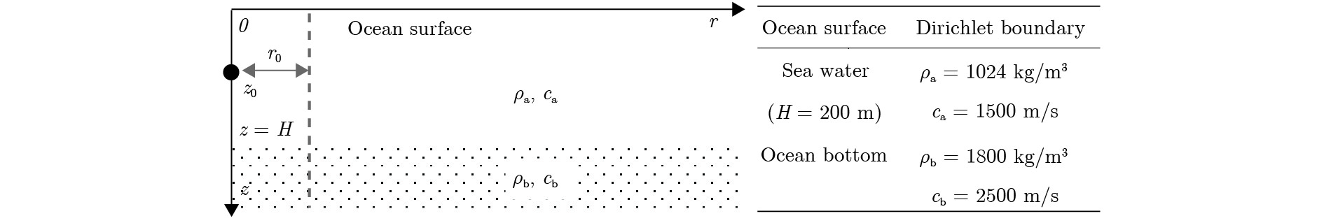 It can be a difficult problem to precisely predict the acoustic field radiated from a finite elastic structure in shallow water channel because of its strong coupling with up-down boundaries and the fluid medium, whose acoustic field cannot be calculated directly by existing methods, such as Ray theory, normal mode theory and other different methods, which are adaptable to sound fields from idealized point sources in waveguide. So, there is no reliable research method of predicting the acoustic radiation of elastic structure in shallow water at present. Based on the finite element method (FEM) coupled with the parabolic equation (PE), the theoretical model for structure acoustic radiation in shallow water at low frequency is established in this paper. This model mainly consists of three sections. First, obtaining the near-field vibro-acoustic characteristics of the elastic structure in shallow water by the multi-physics coupling model established by FEM, whose FEM model includes the up-down boundaries and the completely absorbent sound boundaries in the horizontal direction. Second, getting the acoustic information in the depth, which is set as the acoustic input condition i.e. starting field for the PE. Third, the acoustic information in the far-field quickly calculated by the PE and the finite difference method (FDM). The accuracy, efficiency and fast convergence of FEM-PE method are validated by numerical simulation and theoretical analysis through using a monopole source and structural source in the Pekeris waveguide, respectively. The vibro-acoustic characteristics of elastic cylinder influenced by upper and lower fluid boundaries of the Pekeris waveguide are calculated and analyzed. The cylindrical shell material is steel, and it is 1 m in radius and 10 m in length. The shallow water channel is a Pekeris waveguide with 30 m in depth, at the upper boundary, i.e., the free surface, the lower boundary is the semi-infinite liquid boundary. The analyzed frequencies range from 50 Hz to 200 Hz. The study shows that when the cylindrical shell approaches to the sea surface or bottom, the coupled frequency is higher or lower respectively than that of the shell immersed in the free field. When the diving depth reaches a certain distance range, the coupled frequency tends to be the same as that in free field. The acoustic field radiated from an elastic shell in Pekeris waveguide is similar to that from a point source at low frequency, but there exists a significant difference in high frequency between them, so the structural source can be equivalent to a point source conditionally. The sound radiation attenuation of the structure happens in sequence according to the near-field acoustic shadow zone, the spherical wave attenuation zone, the region between spherical wave and the cylindrical wave attenuation zone, and the cylindrical wave attenuation zone.