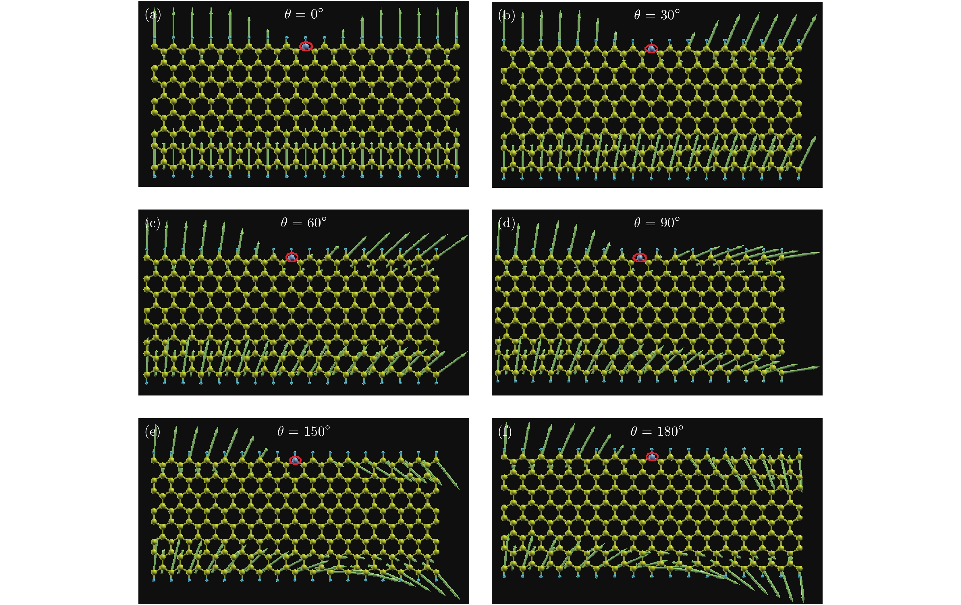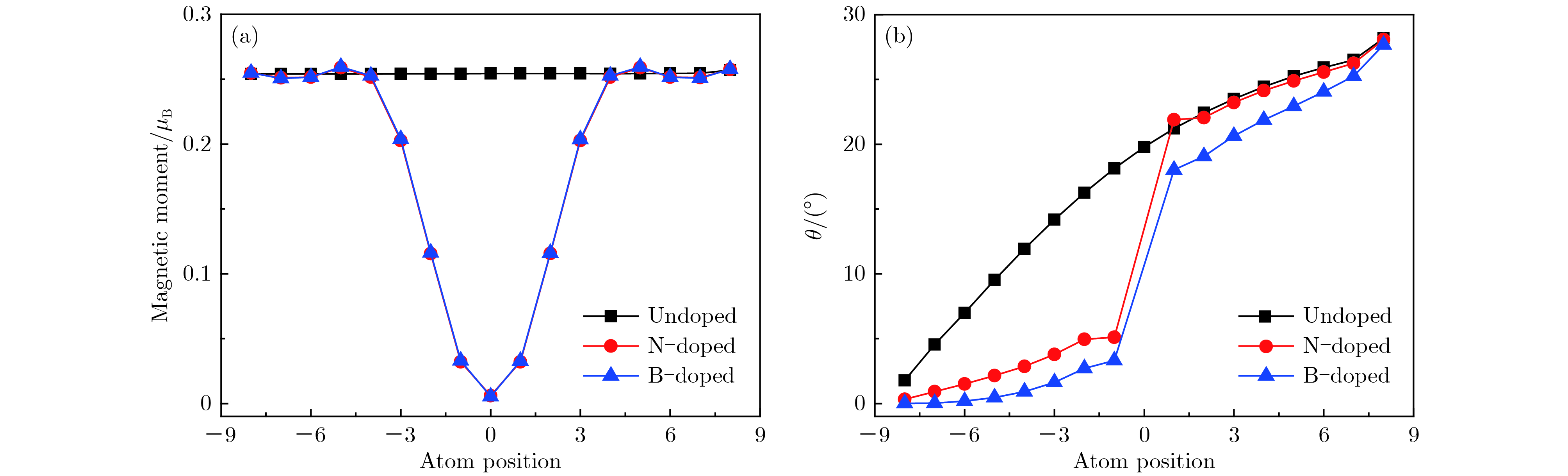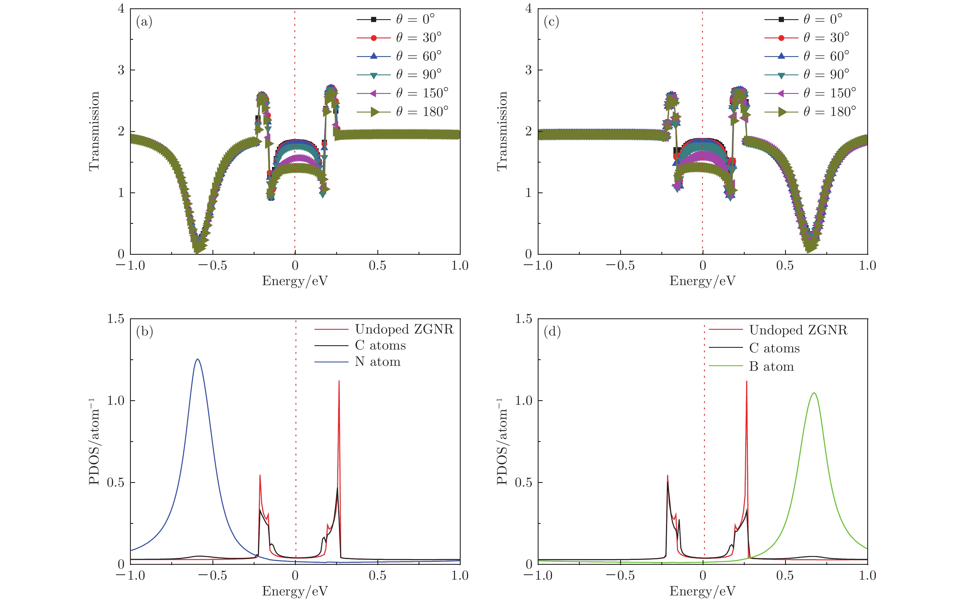 E= +0.65 eV for B-doped ZGNR. The consistency between the position of dip in transmission and the position of peak in DOS indicates that the transmission dip mentioned above is attributed to strong backscattering from the dopant-induced bound state. Our theoretical results are expected to be useful for understanding the noncollinear magnetism and spin scattering in the doped ZGNR-based devices. Also, our work provides a considerable insight into the design of ZGNR-based nanoelectronic devices, such as the transistor based on spin transfer torque effect.