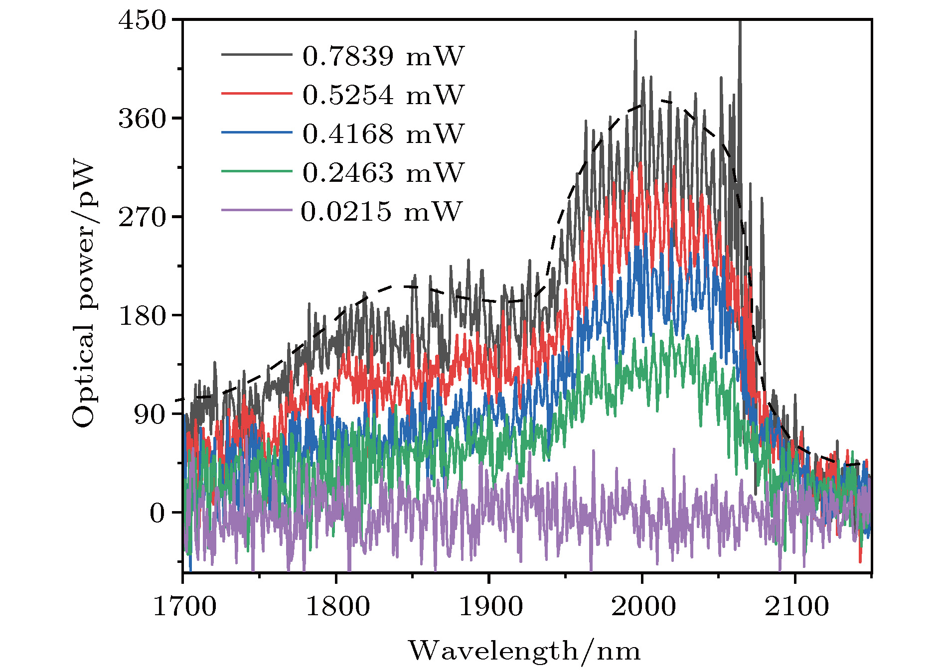 band can be noted in the transmission spectra of the coupling system. When the pump power increases beyond a threshold of 0.848 mW, a lasing peak at 2080.54 nm can be obtained from the coupling system. Experimental results presented in this work show that this 2S2G chalcogenide glass is a promising base material for fabricating various active optical/photonic devices in the middle-wavelength and long-wavelength infrared spectra.