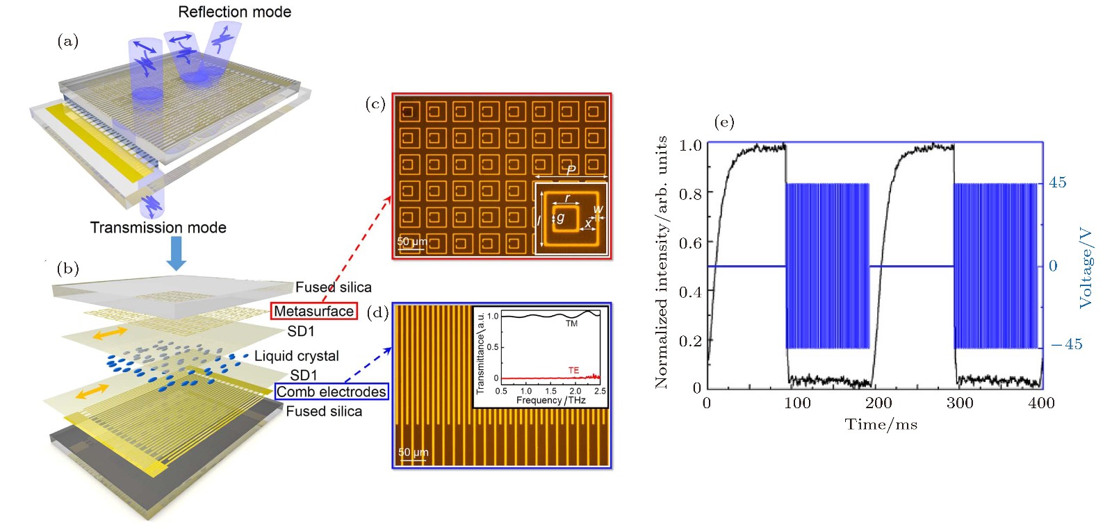 Liquid crystal (LC) is an excellent tunable functional material which can be controlled by the external stimulus such as electric field, magnetic field and temperature. Terahertz (THz) radiation in a frequency range of 0.1−10.0 THz, has enormous advantages such as a low photon energy, sensitivity to crystal lattice vibration, magnetic spins, hydrogen bonds, intermolecular interaction, and water, and high transparency to non-conducting materials. The THz technology, therefore, has great potential in a diverse range of applications from spectroscopy, security screening to biomedical technology and high-speed wireless communication. But the development of high-performance LC based tunable THz functional devices is still in its infancy stage. The dispersion of LC refractive index induces a comparatively low birefringence in the THz regime. The lack of transparent electrodes makes the electric tuning of LCs difficult to achieve. To achieve certain modulations requires a very thick THz layer, leading to several disadvantages such as high operating voltage, slow response and poor pre-alignment. In this paper, we first present the research progress of large birefringence LCs in THz range. A room-temperature nematic LC NJU-LDn-4 with an average birefringence greater than 0.3 in a frequency range from 0.5 to 2.5 THz is shown in detail. This kind of LC can remarkably reduce the required cell gap, thus reducing the operating voltage and response time. Then we summarize varieties of conventional THz devices based on LC. Many electrodes are used for THz range. Graphene which can be used as a perfect transparent electrode material in THz band is proposed. Not only tunable transmissive but also reflective THz waveplates are introduced. The thickness of the LC layer of the reflective one can be reduced to ~10% of that needed for the same phase shift at a given frequency in a transmissive waveplate. The same tunability as that in the transmissive type just needs half the thickness. We also introduce that LC can generate THz vortex beam based on a photopatterned large birefringence LC. In the area of LC based versatile THz metamaterial devices, the adjacent units of a metasurface layer, such as a fishnet or grating, are usually connected to each other which may cause low-quality ( Q) factor and polarization sensitivity, which is undesirable. We emphasize a graphene-assisted high-efficiency tunable THz metamaterial absorber. Few-layer porous graphene is integrated onto the surface of a metasurface layer to provide a uniform static electric field to efficiently control the LC, thereby enabling flexible metamaterial designs. The THz far-field and near-field with large modulation and fast response are realized. A magnetically and electrically polarization-tunable terahertz emitter that integrates a ferromagnetic heterostructure and the large-birefringence liquid crystals is also demonstrated to be able to generate broadband THz radiation and control the polarization of THz waves perfectly as well as LC based THz reflectarray. Last but not least, a temperature-supersensitive cholesteric LC used for THz detection is shown. It can not only measure the beam profiles but also detect the power values of THz waves generated from a nonlinear crystal pumped by a table-top laser. Quantitative visualization based on not only the thermochromic but also the thermal diffusion effect, can be used conveniently and effectively at room temperature. In this review, we summarize the latest progress of liquid crystal materials and components in THz and discuss the possible prospects of the combination of liquid crystal technology and THz technology. We envision that LCs will play a unique role in THz sources, THz functional devices and THz detectors.