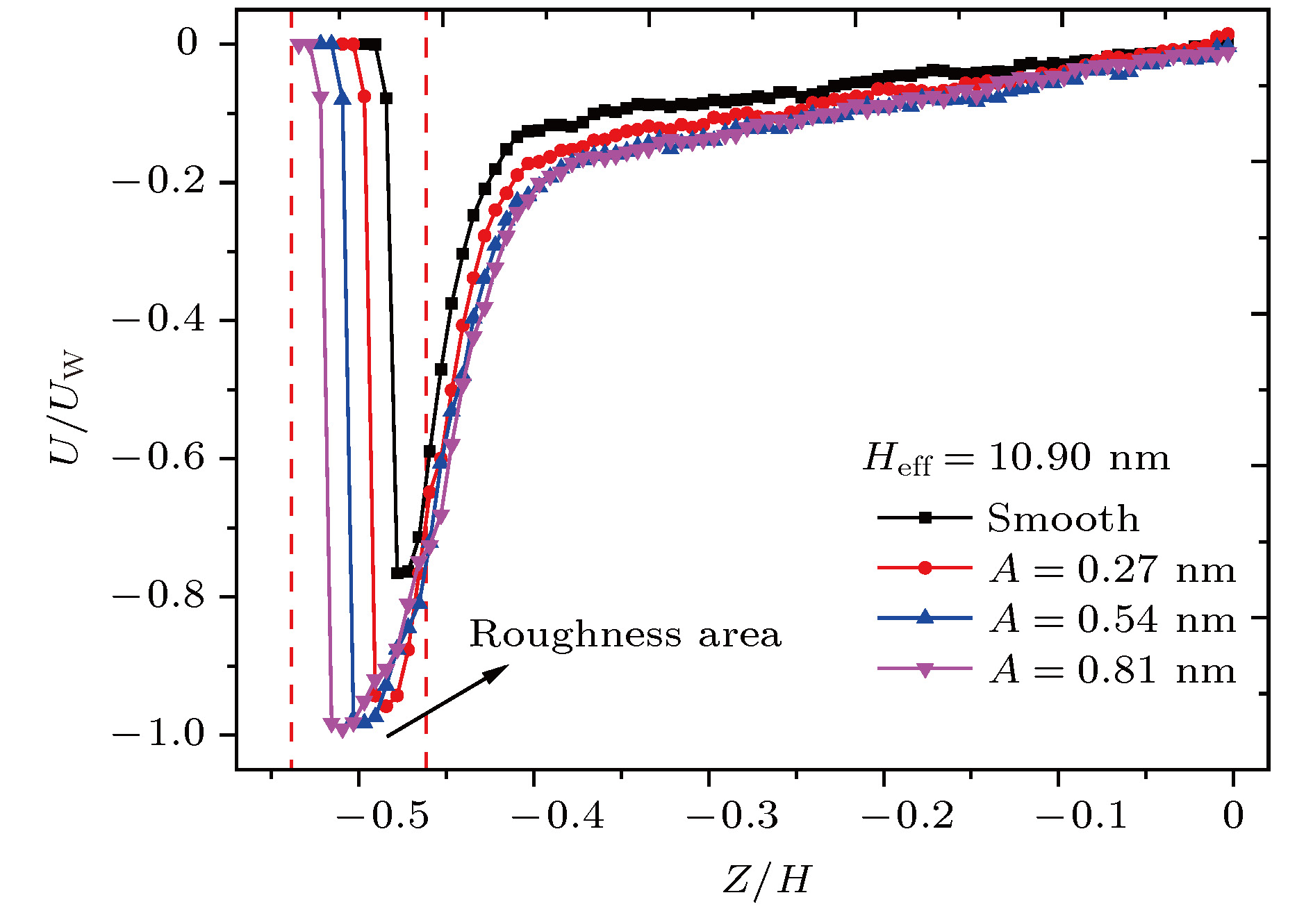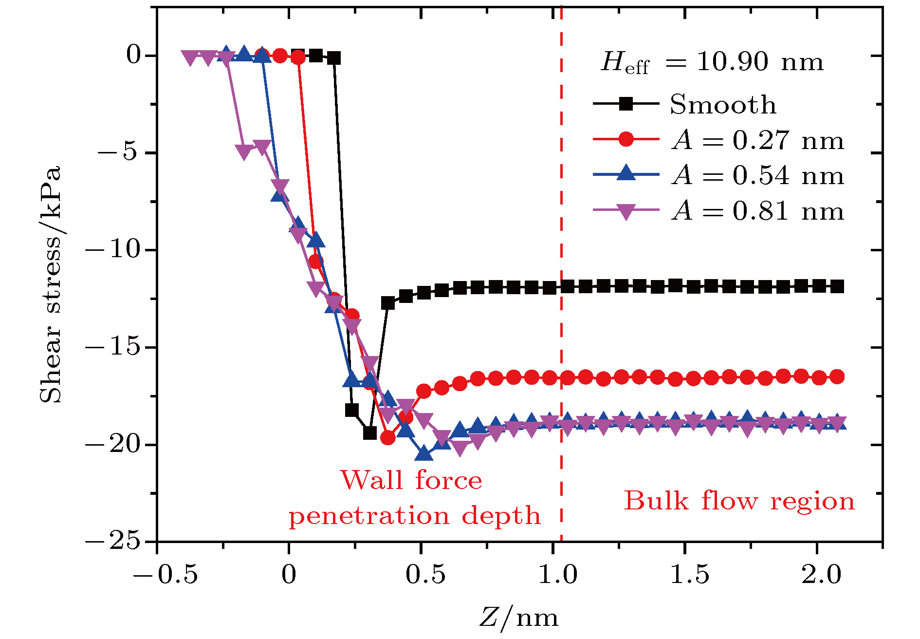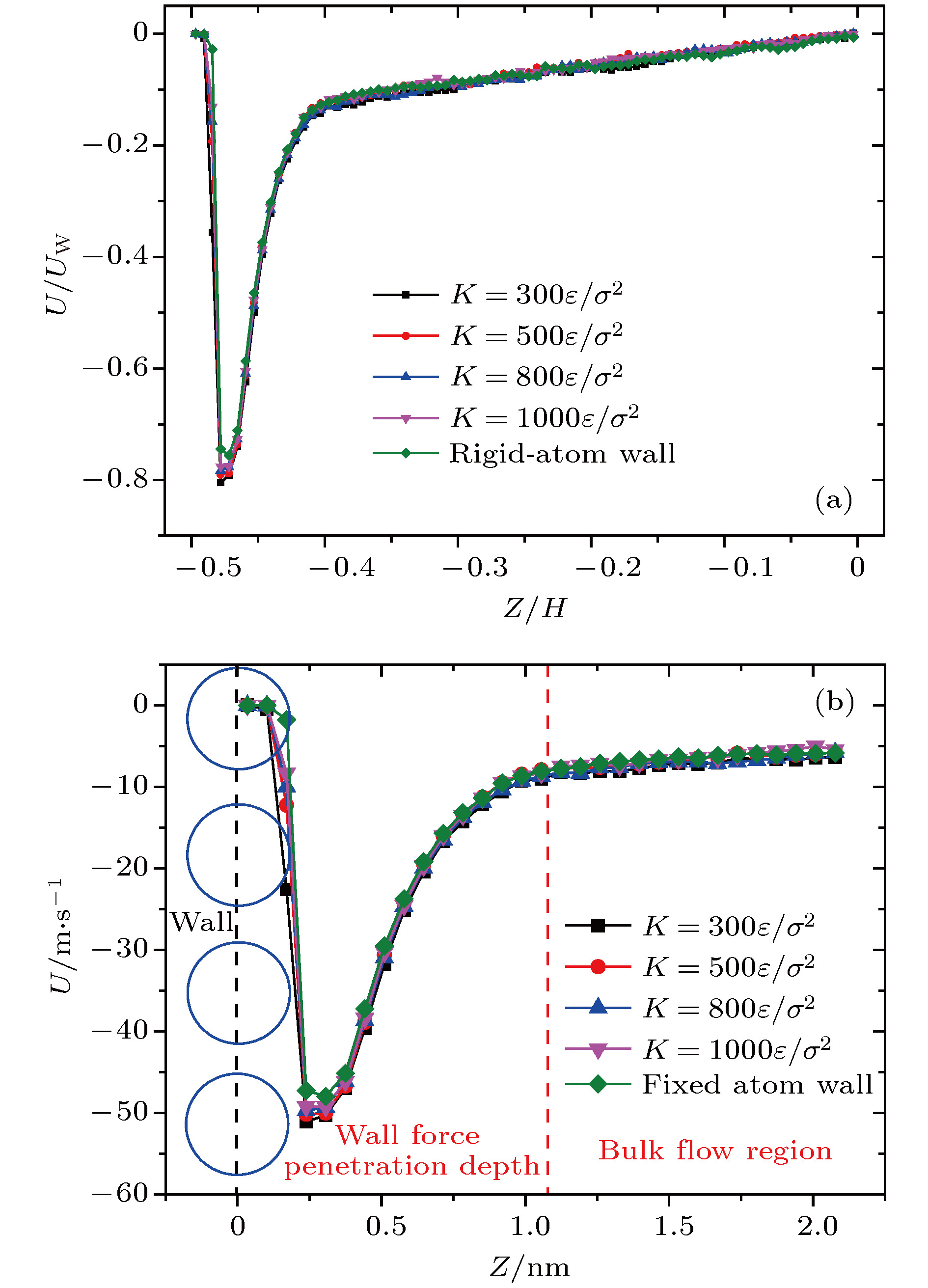 kto model the surface stiffness. The results indicate that the surface stiffness has little effect on the physical quantity distribution of the bulk flow region, but a certain influence on that of the near wall region. Increasing the value of the stiffness changes the velocity peak of the gas in the near-wall region and the tangential momentum adaptation coefficient (TMAC) towards lower values, thus demoting the momentum adaptability of the gas molecules to the surface. The wall roughness is simulated by a typical pyramidal model. It is found that the influence of wall roughness on the flow is very obvious, whether it is in the bulk flow region or in the near wall region. For the former case, the increase of roughness leads gas velocity and shear stress to increase, with density and normal stress remaining constant. The linear distribution of physical quantities is also affected to some extent. While for the latter case, as the roughness increases, the velocity of the fluid increases rapidly and approaches to the wall velocity. The peak of density increases, and the adsorption of gas molecules at the surface is obvious. The TMAC approaches to 1, suggesting that the gas and the surface achieve a complete momentum adaptation. Besides, the influence of system temperature on the gas flow in the nanochannel is also studied. The system temperature is controlled by the Nose-Hoover thermostat, making the flow field maintained at the target temperature through the damping coefficient. The results show that the effect of temperature is global in the whole flow region. The increase of temperature causes the flow velocity of the whole flow field to decrease, while the normal stress and shear stress to increase. A higher temperature leads to more frequent collisions between gas molecules, thus increasing the effective viscosity of the gas. At the same time, the degree of gas molecule adsorption in the near-wall region is reduced, contributing to a smaller TMAC value, and consequently a weaker gas-surface interaction.