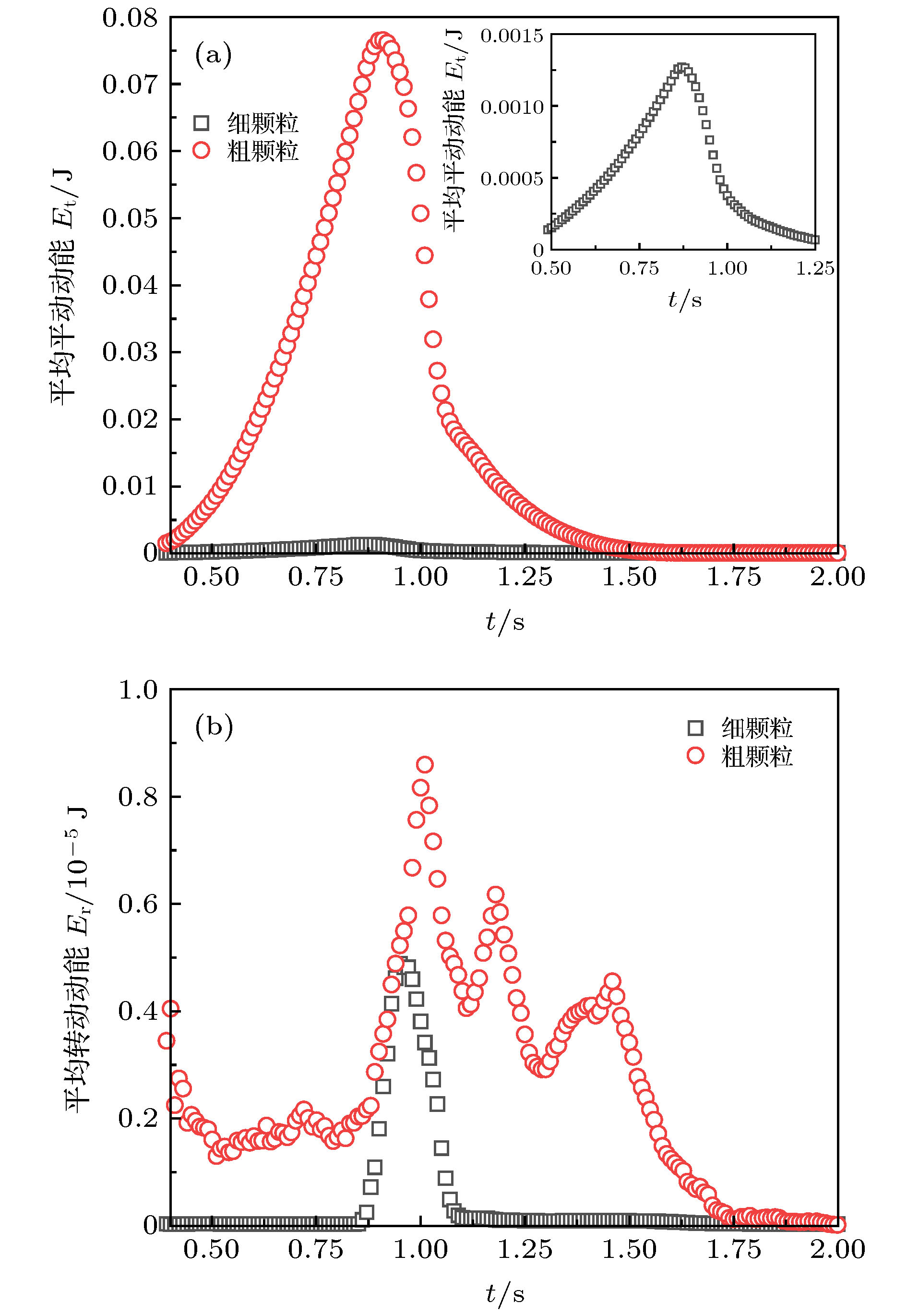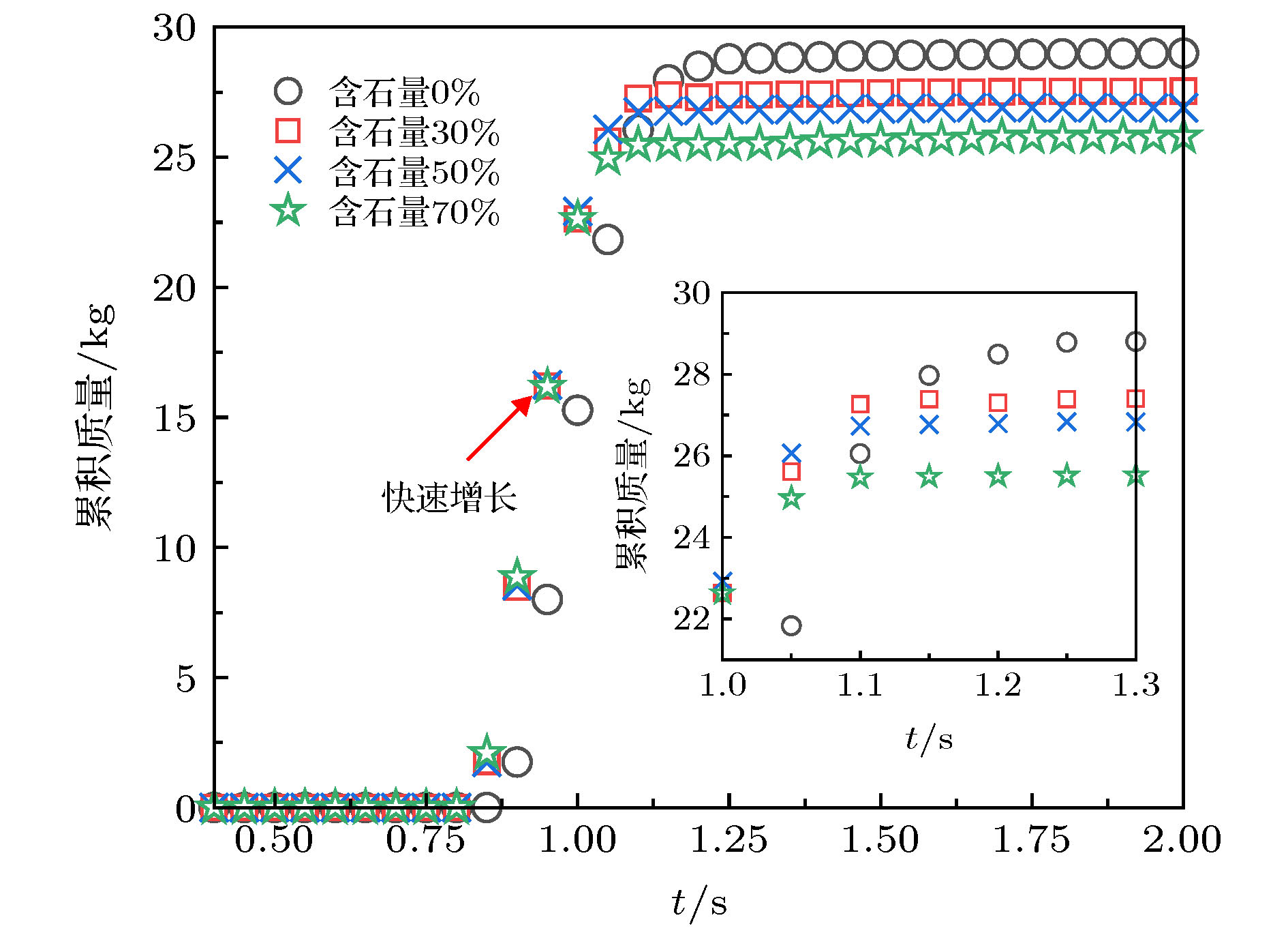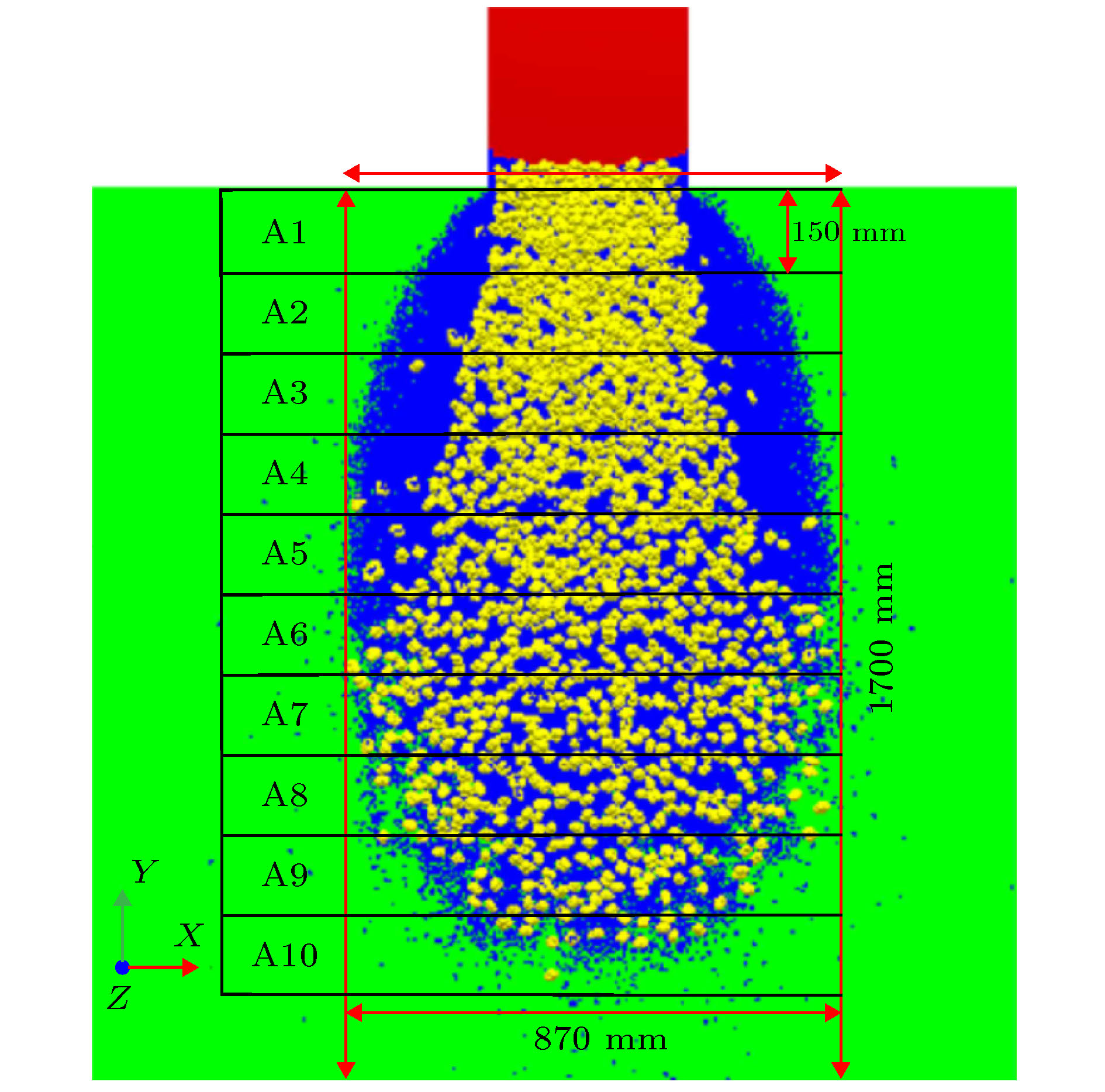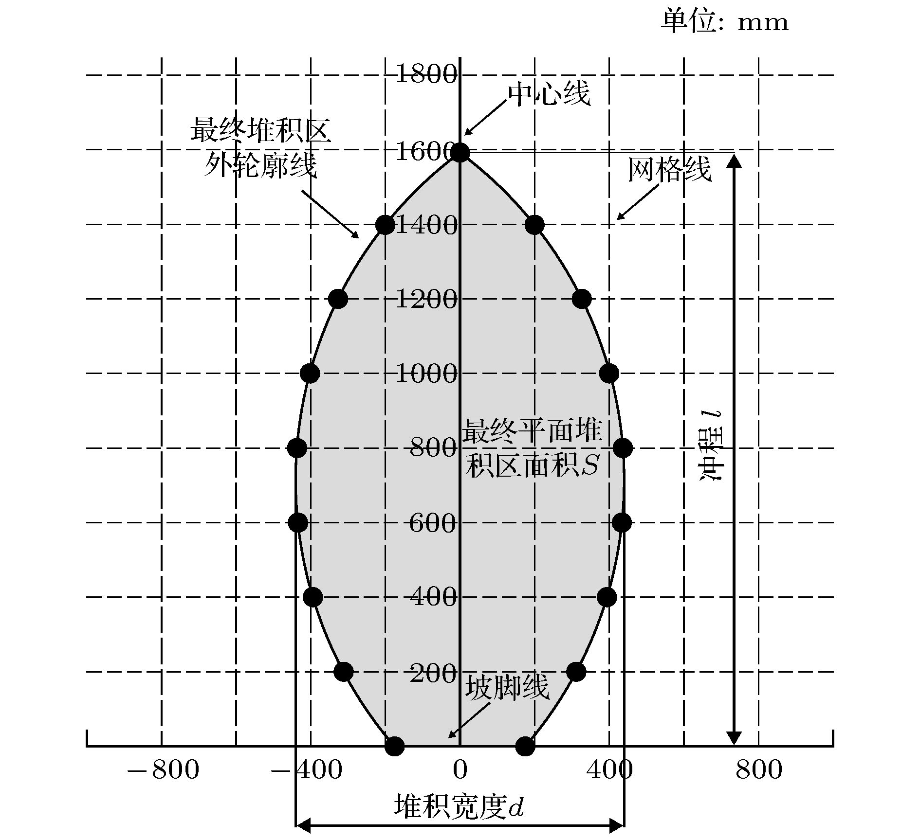 参数 符号 单位 数值 参数 符号 单位 数值 细颗粒基础球粒径 d mm 4.00 静摩擦系数 μps — 0.44 粗颗粒基础球粒径 d mm 14.00 滚动摩擦系数 μpr — 0.05 颗粒密度 ρ kg/m3 2100.00 堆积体质量 M kg 30.00 剪切模量 E MPa 1000.00 时间步长 dt s 6.26616 × 10–5 泊松比 v — 0.26 滑槽尺寸 L×W×H mm 1800 × 350 × 300 恢复系数 e — 0.40 底板尺寸 L×W×H mm 3000 × 2000 × 10 摩擦系数 μpp — 0.42 料箱尺寸 l×w×h mm 400 × 350 × 200 计算条件 +X方向γ/(°) -X方向γ/(°) 均值γ/(°) 30° 0% 13.58 13.46 13.52 30° 30% 12.94 13.13 13.40 30° 50% 12.48 13.32 12.90 30° 70% 12.03 11.27 11.65 45° 0% 8.25 8.21 8.23 45° 30% 6.85 7.31 7.08 45° 50% 7.28 6.92 7.10 45° 70% 7.78 7.24 7.51 65° 0% 4.17 4.28 2.23 65° 30% 4.25 4.59 2.42 65° 50% 4.26 4.89 2.58 65° 70% 4.96 4.74 2.85 参量 细颗粒 粗颗粒 细颗粒与粗颗粒 平均平动动能Et/10–4J 2.41 169.28 — 平均转动动能Er/10–7J 4.66 26.03 — 平均法向力Fn/10–6N 19.04 155.37 31.77 平均切向力Ft/10–3N 6.84 55.37 11.36 平均法向重叠量/ 10–2mm 4.01 10.13 4.77 平均切向重叠量/ 10–2mm 1.05 2.87 1.27 模拟变量 模拟结果 冲程 堆积宽度 最大厚度 堆积面积 累积质量 静堆积角 含石量 ↗↘ ↗↘ ↘↗ ↗↘ ↘(较小) ↘(较小)或↗(较小) 坡度 ↗↗ ↗ ↘ ↗↗ ↗↗ ↘↘ 注: 1. 表中所考虑的均是模拟变量数值增大对模拟结果的影响; 其中, 含石量σ(%)的取值分别为0, 30, 50, 70; 坡度θ(°)的取值分别为30, 45, 65. 2. “↗”表示模拟结果持续增大, “↘”表示模拟结果持续减小; “↗ ↘”表示模拟结果先增大后持续减小, “↘ ↗”表示模拟结果先减小后持续增大, “↗ ↗”表示模拟结果增大明显, “↘ ↘”表示模拟结果减小明显, “↘(较小)”表示模拟结果小幅度减小, “↗(较小)”表示模拟结果小幅度增大. -
