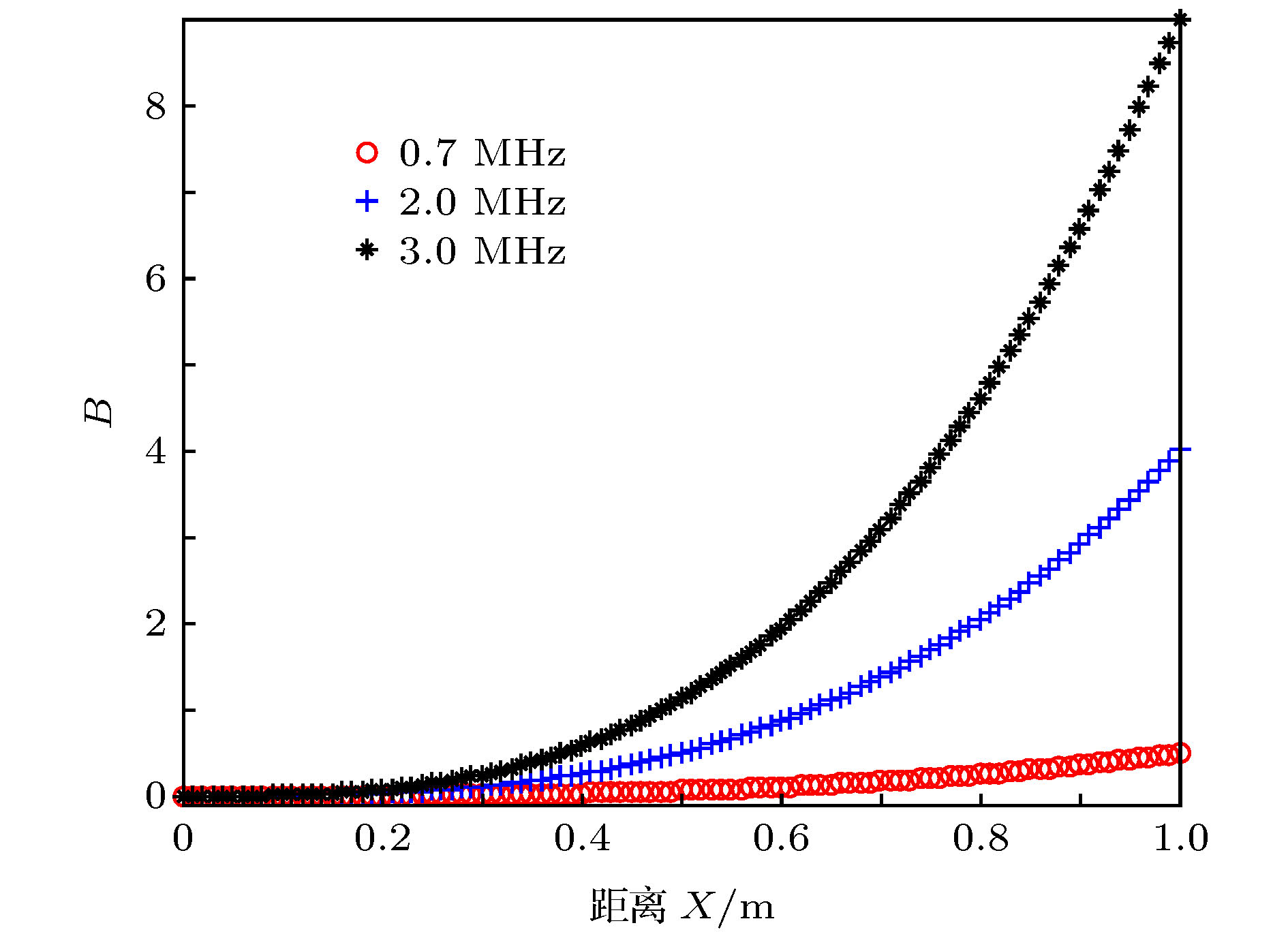 $\omega b \ll {\rho _0}c_0^2$ 时, 基波的衰减系数与驱动频率的平方及耗散系数的乘积成正比; 二次谐波的衰减规律更加复杂, 与频率的更高次幂相关. 对声衰减系数及声压的分布进行数值计算发现, 声压的分布还与初始的声压幅值及频率有关, 初始的声压与频率越高衰减得越快. 另外, 当声压高于液体的空化阈值时, 液体中就会出现大量的空化泡, 文中模拟了单个空化泡的运动, 发现随着声压的增大空化泡的振动越剧烈、空化泡所受的黏滞力变大, 随着声波作用时间的增大黏滞力的幅值迅速增大并与驱动声压值同阶, 因而空化泡的非线性径向运动引起的声衰减不容忽视. 结果表明, 驱动声压越高在空化区域附近引起的声衰减越快、输出的声压越低.-