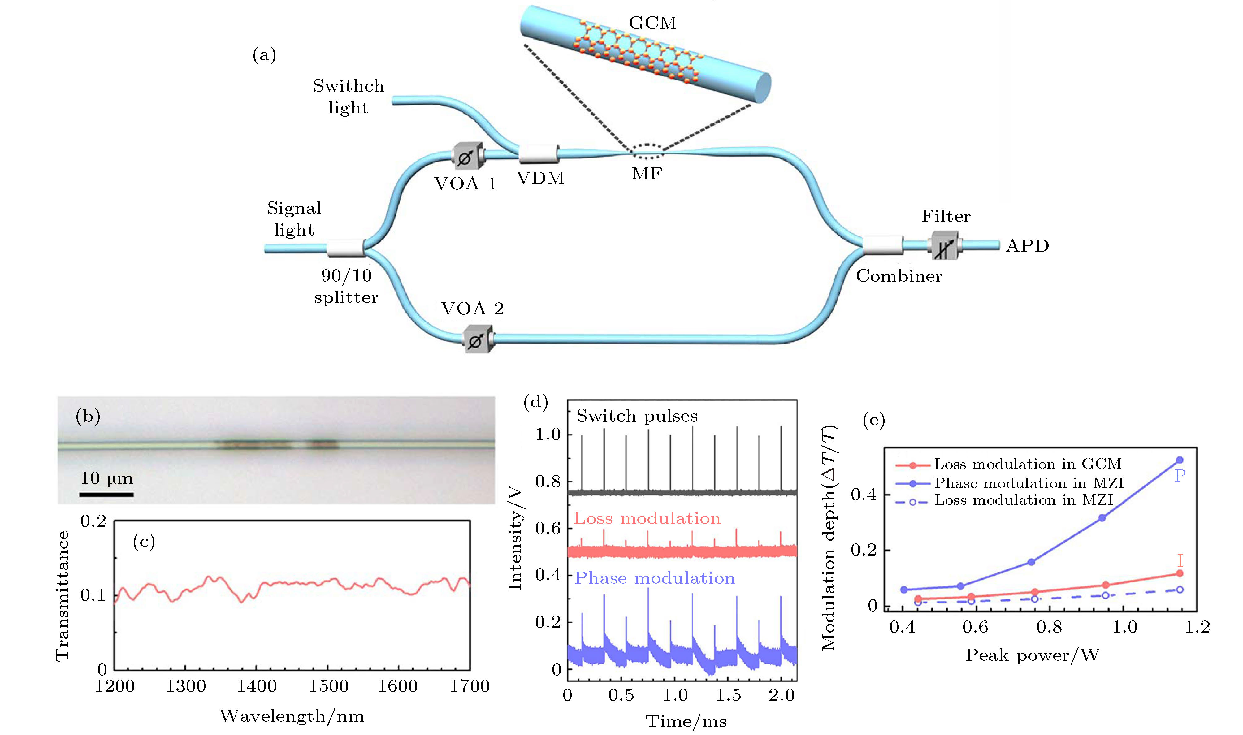 近年通信技术的飞跃, 对光学设备的紧凑性、响应速度、工作带宽和控制效率提出新的挑战. 石墨烯的发现, 使得二维材料飞速发展, 不断涌现出一系列新材料, 如MXene、黑磷、过渡金属硫化物等. 这些新型二维材料有着出色的非线性光学效应、强光-物质交互作用、超宽的工作带宽. 利用其热光效应、非线性效应并结合光学结构, 能够满足光通信中超快速的需求. 紧凑、超快、超宽将会是未来二维材料全光器件的标签. 本文重点综述基于二维材料的热光效应与非线性效应的全光器件, 介绍光纤型的马赫-曾德尔干涉仪结构、迈克耳孙干涉仪结构、偏振干涉结构以及微环结构, 最后阐述并回顾最新的进展, 分析全光器件面临的挑战和机遇, 提出全光领域的前景与发展趋势.The leap in communication technology in recent years has brought new challenges to the compactness, modulation speed, working bandwidth and control efficiency of modulation equipment. The discovery of graphene has led the two-dimensional materials to develop rapidly, and a series of new materials have continuously emerged, such as MXene, black phosphorus, transition metal sulfides, etc. These new two-dimensional materials have excellent nonlinear optical effects, strong light-matter interaction, and ultra-wide working bandwidth. Using their thermo-optic effect, nonlinear effect and the combination with optical structure, the needs of ultra-fast modulation in optical communication can be met. Compact, ultra-fast, and ultra-wide will become the tags for all-optical modulation of two-dimensional materials in the future. This article focuses on all-optical devices based on thermo-optical effects and non-linear effects of two-dimensional materials, and introduces fiber-type Mach-Zehnder interferometer structures, Michelson interferometer structures, polarization interferometer structures, and micro-ring structures. In this paper, the development status of all-optical devices is discussed from the perspectives of response time, loss, driving energy, extinction ratio, and modulation depth. Finally, we review the latest developments, analyze the challenges and opportunities faced by all-optical devices, and propose that all-optical devices should be developed in the direction of ring resonators and finding better new two-dimensional materials. We believe that all-optical devices will maintain high-speed development, acting as a cornerstone to promote the progress of all-optical systems.