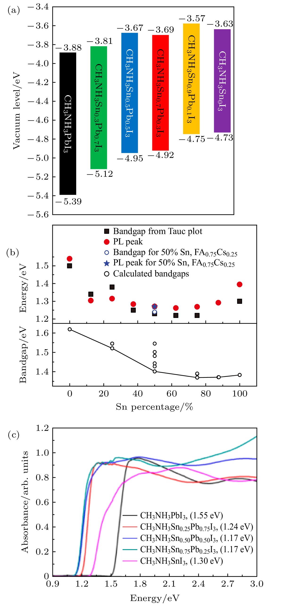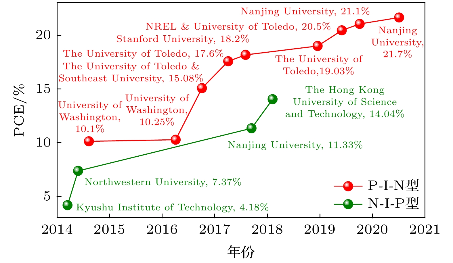 Year Perovskite Device structure Eg/eV VOC/V JSC/(mA·cm–2) FF/% PCE/(%) Ref. 2016 MA0.5FA0.5Pb0.75Sn0.25I3 ITO/PEDOT:PSS/PVK/PCBM/Bis-C60/Ag 1.33 0.78 23.03 79 14.19 [49] 2016 (FASnI3)0.6(MAPbI3)0.4 ITO/PEDOT:PSS/PVK/C60/BCP/Ag 1.25 0.795 26.86 70.6 15.08 [26] 2017 MA0.5FA0.5Pb0.5Sn0.5I3 ITO/PEDOT:PSS/PVK/PCBM/Bis-C60/Ag 1.2 0.78 25.69 70 14.01 [38] 2017 MAPb0.5Sn0.5I3 ITO/PEDOT:PSS/PVK-DF-C60/ICBA/Bis-C60/Ag 1.22 0.87 26.1 69 15.61 [72] 2018 (t-BUA)2(FA0.85Cs0.15)n–1Pb0.6Sn0.4)nI3n+1 ITO/PEDOT:PSS/2 D-PVK/PCBM/BCP/Ag 1.24 0.70 24.2 63 10.6 [43] 2018 FA0.6MA0.4Sn0.6Pb0.4I3 ITO/PFI-(PEDOT:PSS)/PVK/PCBM/BCP/Ag 1.22 0.784 27.22 74.36 15.85 [81] 2018 (FAPbI3)0.7(CsSnI3)0.3 ITO/PEDOT:PSS/PVK/C60/BCP/Al 1.3 0.74 25.89 81.4 15.6 [36] 2018 (FASnI3)0.6(MAPbI3)0.34(MAPbBr3)0.06 ITO/PEDOT:PSS/PVK/C60/BCP/Ag 1.272 0.888 28.72 74.6 19.03 [53] 2018 (FASnI3)0.6(MAPbI3)0.4 ITO/PEDOT:PSS/PVK/C60/BCP/Ag 1.25 0.841 29.0 74.4 18.1 [30] 2018 FAPb0.7Sn0.3I3 ITO/PEDOT:PSS/PVK/PEAI/PC61BM/BCP/Ag 1.34 0.78 26.46 79 16.26 [54] 2018 FAPb0.75Sn0.25I3 ITO/NiOX/PVK/PC60BM/BCP/Ag 1.36 0.81 28.23 75.4 17.25 [27] 2018 (FASnI3)0.6(MAPbI3)0.4 ITO/PEDOT:PSS/PBDBT:ITIC/PVK/C60/BCP/Ag 1.25 0.86 27.92 75.1 18.03 [82] 2019 FA0.8MA0.2Sn0.5Pb0.5I3 ITO/PEDOT:PSS/PVK/PCBM/BCP/Ag 1.27 0.81 30 75 18.2 [61] 2019 (FAPb0.6Sn0.4I3)0.85(MAPb0.6Sn0.4Br3)0.15 ITO/PEDOT:PSS/PVK/PCBM/BisC60/Ag 1.28 0.87 26.45 79.1 18.21 [39] 2019 FA0.7MA0.3Pb0.5Sn0.5I3 ITO/PEDOT:PSS/PVK/PC60BM/BCP/Cu 1.22 0.831 31.4 80.8 21.1 [18] 2019 Cs0.1MA0.2FA0.7Pb0.5Sn0.5I3 ITO/NiOX/PVK/C60/BCP/Cu 1.2 0.771 31.1 73.3 17.6 [52] 2019 FA0.75Cs0.25Sn0.4Pb0.6I3 ITO/PVK/C60/BCP/Ag 1.25 0.72 32.59 69.8 16.4 [51] 2019 (FASnI3)0.6(MAPbI3)0.4 ITO/PEDOT:PSS/PVK/C60/BCP/Ag 1.25 0.834 30.4 80.8 20.5 [55] 2019 Cs0.1MA0.2FA0.7Sn0.5Pb0.5I3 ITO/NiOX/PVK/C60/BCP/Cu 1.2 0.771 31.1 73.3 17.6 [52] 2020 (MAPbI3)0.75(FASnI3)0.25 ITO/PEDOT:PSS/PVK/BCP/Ag 1.33 0.79 28.42 78 17.51 [44] 2020 Cs0.1MA0.2FA0.7Pb0.5Sn0.5I3 ITO/PEDOT:PSS/PVK/PCBM/PEIE/Ag 1.25 0.81 30.3 78.9 19.4 [42] 2020 FA0.83Cs0.17Pb0.7Sn0.3I3 ITO/PEDOT:PSS/PVK/PCBM/BCP/Ag 1.3 0.82 30.3 78.4 18.1 [9] 2020 FA0.7MA0.3Pb0.7Sn0.3I3 ITO/PEDOT:PSS(EMIC)/PVK/S-acetylthiocholine chlorde/C60/BCP/Ag 1.35 1.02 26.61 76 20.63 [66] 2020 FA0.66MA0.34Pb0.5Sn0.5I3 ITO/PEDOT:PSS/PVK/C60/BCP/Ag 1.23 0.78 27.8 73 15.8 [54] 2020 FA0.5MA0.45Cs0.05Pb0.5Sn0.5I3 ITO/PEDOT:PSS/PTAA/Cd-PVK/C60/BCP/Cu 1.22 0.85 30.2 79 20.3 [68] 2020 FA0.7MA0.3Pb0.5Sn0.5I3 ITO/PEDOT:PSS/PVK/C60/BCP/Cu 1.24 0.85 31.6 80.8 21.7 [4] -