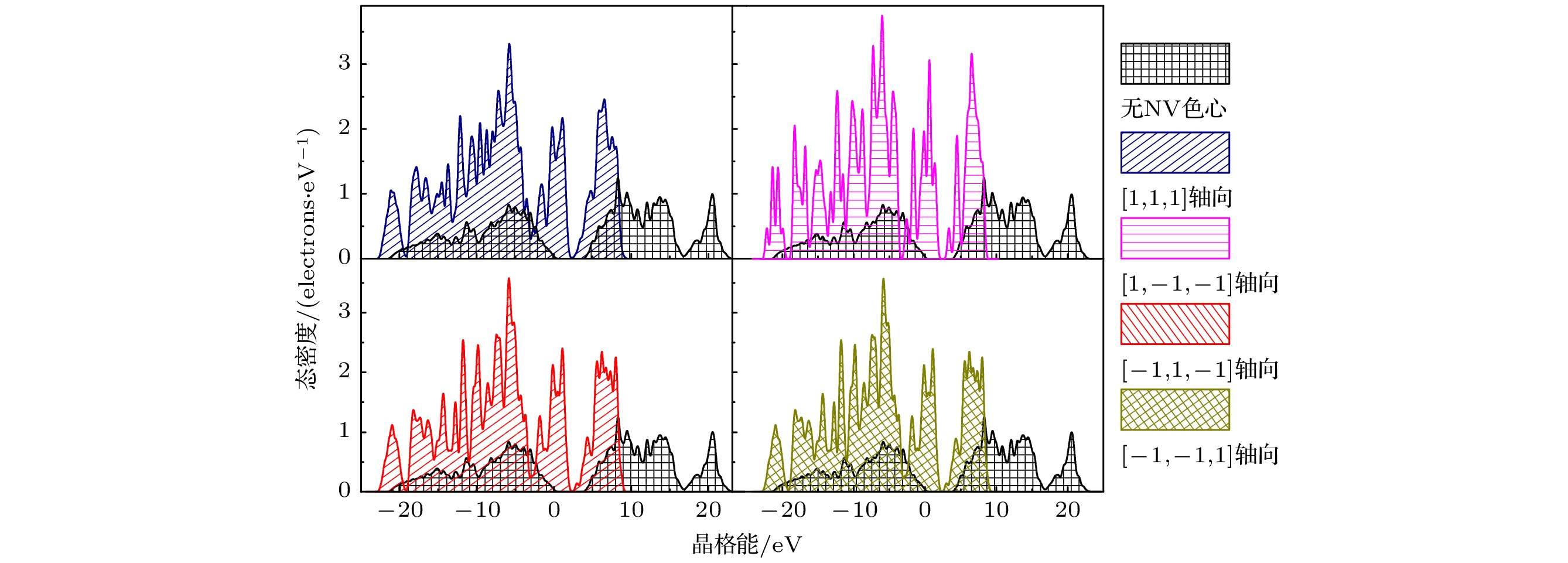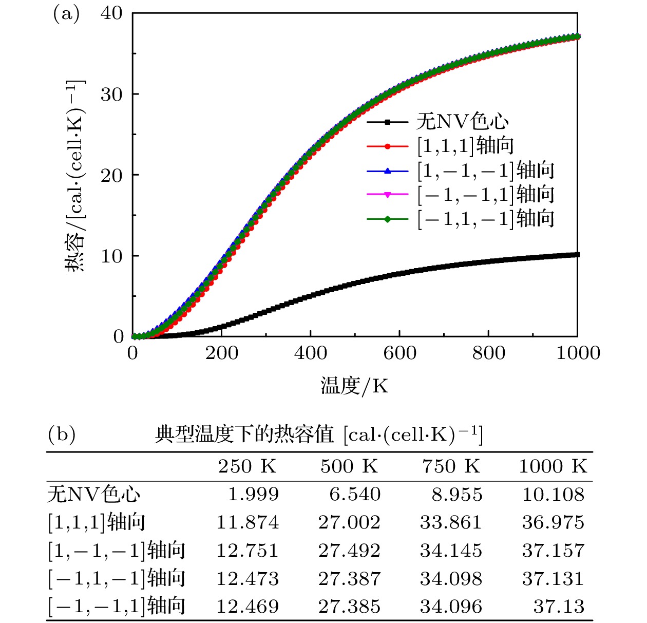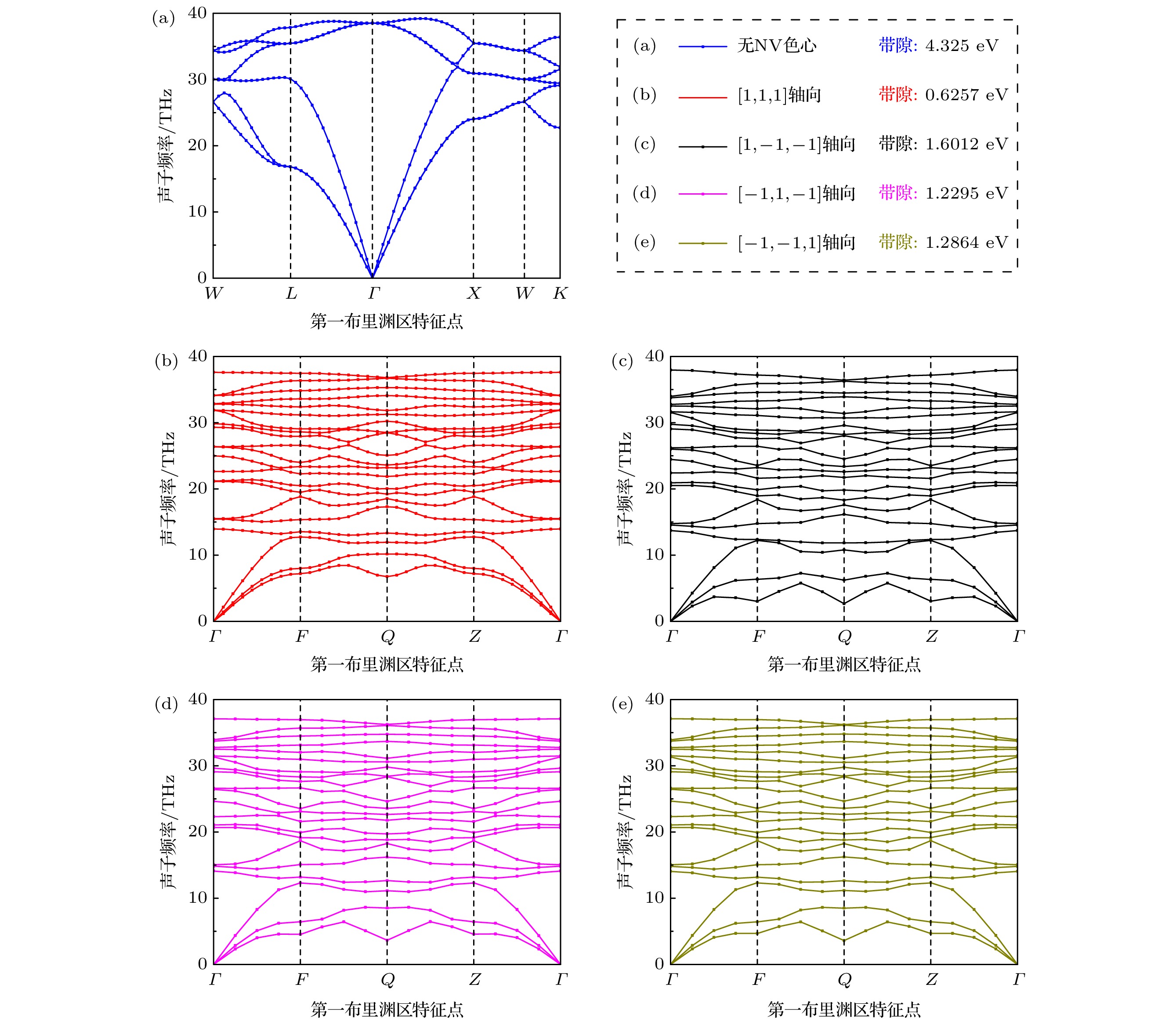 NV色心轴向 晶格动力学矩阵元不对称关系 NV色心轴向 晶格动力学矩阵元不对称关系 无NV色心 $\left\{ \begin{aligned}&{ {D_{xy} }\left( {{q} } \right) = {D_{yx} }\left( {{q} } \right)}\\&{ {D_{yz} }\left( {{q} } \right) = {D_{zy} }\left( {{q} } \right)}\\&{ {D_{xz} }\left( {{q} } \right) = {D_{zx} }\left( {{q} } \right)}\end{aligned} \right.$ [–1, 1, –1]轴向 $\left\{ {\begin{aligned}&{{D_{xy}}\left( {{q}} \right) = - {k_{[ - 1, 1, - 1]}}{D_{yx}}\left( {{q}} \right)}\\&{{D_{yz}}\left( {{q}} \right) = - {k_{[ - 1, 1, - 1]}}{D_{zy}}\left( {{q}} \right)}\\&{{D_{xz}}\left( {{q}} \right) = {k_{[ - 1, 1, - 1]}}{D_{zx}}\left( {{q}} \right)}\end{aligned}} \right.$ [1, 1, 1]轴向 $\left\{ {\begin{aligned}&{{D_{xy}}\left( {{q}} \right) = {k_{[1, 1, 1]}}{D_{yx}}\left( {{q}} \right)}\\&{{D_{yz}}\left( {{q}} \right) = {k_{[1, 1, 1]}}{D_{zy}}\left( {{q}} \right)}\\&{{D_{xz}}\left( {{q}} \right) = {k_{[1, 1, 1]}}{D_{zx}}\left( {{q}} \right)}\end{aligned}} \right.$ [–1, –1, 1]轴向 $\left\{ {\begin{aligned}&{{D_{xy}}\left( {{q}} \right) = {k_{[ - 1, - 1, 1]}}{D_{yx}}\left( {{q}} \right)}\\&{{D_{yz}}\left( {{q}} \right) = - {k_{[ - 1, - 1, 1]}}{D_{zy}}\left( {{q}} \right)}\\&{{D_{xz}}\left( {{q}} \right) = - {k_{[ - 1, - 1, 1]}}{D_{zx}}\left( {{q}} \right)}\end{aligned}} \right.$ [1, –1, –1]轴向 $\left\{ {\begin{aligned}&{{D_{xy}}\left( {{q}} \right) = - {k_{[1, - 1, - 1]}}{D_{yx}}\left( {{q}} \right)}\\&{{D_{yz}}\left( {{q}} \right) = {k_{[1, - 1, - 1]}}{D_{zy}}\left( {{q}} \right)}\\&{{D_{xz}}\left( {{q}} \right) = - {k_{[1, - 1, - 1]}}{D_{zx}}\left( {{q}} \right)}\end{aligned}} \right.$ 特征线 声子谱波矢条件 声子谱函数 极化向量 Λ线 $ {{q}}_{{x}}={{q}}_{y}={{q}}_{{z}}={q} $ $\left\{\begin{aligned}&{\omega }_{1}=\sqrt {{ {A} }_ {[1, 1, 1]} ^ {\varLambda } + {2}{B} _ {[1, 1, 1]} ^ {\varLambda }} \\ &{\omega }_{2}=\sqrt {{ {A} }_ {[1, 1, 1]} ^ {\varLambda } {-}{ {B} }_ {[1, 1, 1]} ^ {\varLambda } } \\ &{\omega }_{3}=\sqrt{ { {A} }_ {[1, 1, 1]} ^ {\varLambda } {-}{ {B} }_ {[1, 1, 1]} ^ {\varLambda } }\end{aligned}\right.$ $ \left\{\begin{aligned}&{{e}}_{{q}{1}}=\left(\frac{1}{\sqrt{3}}, \frac{1}{\sqrt{3}}, \frac{1}{\sqrt{3}}\right)\\ &{{e}}_{{q}{2}}=\left({-}\frac{1}{\sqrt{2}}, \frac{1}{\sqrt{2}}{, 0}\right)\\ &{{e}}_{{q}{3}}=\left({-}\frac{1}{\sqrt{{6}}}{, -}\frac{1}{\sqrt{{6}}}, \frac{\sqrt{{6}}}{3}\right)\end{aligned}\right. $ $ \varDelta $线