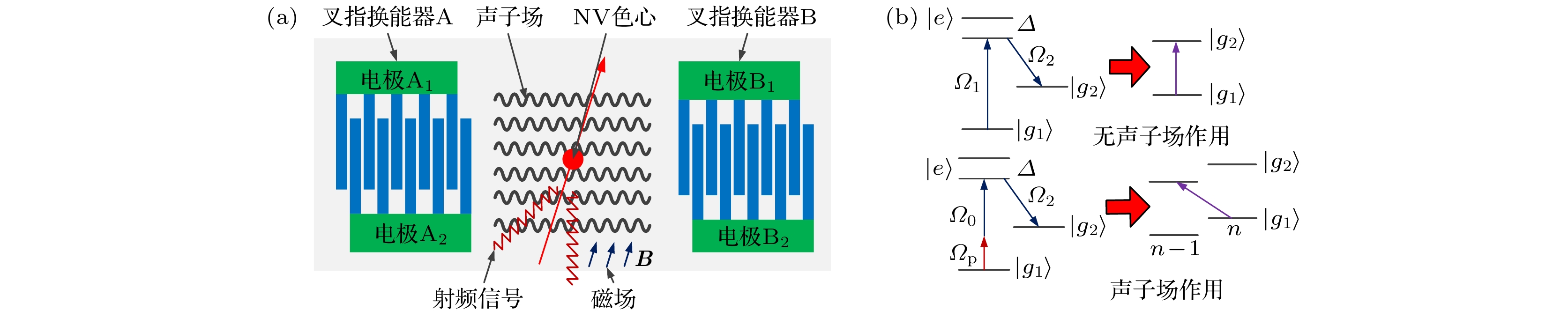金刚石氮-空位色心结构因在量子精密测量领域的高灵敏度优势而备受关注. 本文引入耦合声子场对氮-空位色心原子自旋进行共振调控, 以提高氮-空位色心的自旋跃迁效率. 首先, 基于波函数和晶格的点阵位移矢量关系, 分析了声子与晶格能量交互作用, 研究了基于声子共振调控的氮-空位色心的自旋跃迁机理, 建立了基于应变诱导的能量转移声子-自旋交互耦合激发模型. 其次, 基于氮-空位色心晶格振动理论, 引入满足布洛赫定理的系数矩阵, 建立了不同轴向氮-空位色心第一布里渊区特征区域的声子谱模型. 同时, 基于德拜模型, 考虑热膨胀效应, 解析该声子共振系统的声子热平衡性质, 并对其比热模型进行研究. 最后, 基于分子动力学仿真软件CASTEP和密度泛函理论进行第一性原理研究, 构建了声子模式下不同轴向氮-空位色心的结构优化模型, 并分析了其结构特性、声子特性和热力学特性. 研究结果表明, 系统声子模式的演化依赖于氮-空位的占位, 声子模式强化伴随着热力学熵的降低. 含氮-空位色心金刚石的共价键较纯净无缺陷金刚石更弱, 热力学性质更不稳定. 含氮-空位色心金刚石的声子主共振频段处于THz量级, 次共振频率约为[800,1200] MHz. 根据次共振频段设计叉指宽度为1.5 μm的声表面波共振机构, 其中心频率约为930 MHz. 在该声子共振调控参数条件下, 声子共振调控方法可有效增大氮-空位色心的自旋跃迁概率, 实现氮-空位色心原子自旋操控效率的提高.The nitrogen-vacancy center structure of diamond has attracted widespread attention due to its high sensitivity in quantum precision measurement. In this paper, a coupled phonon field is used to resonantly regulate the atomic spins of the nitrogen-vacancy center for improving the spin transition efficiency. Firstly, the interaction between phonons and lattice energy is analyzed based on the relationship between the wave function and the lattice displacement vector. The spin transition mechanism is investigated based on phonon resonance regulation, and the strain-induced energy transferable phonon-spin interaction coupling excitation model is established. Secondly, the coefficient matrix satisfying Bloch’s theorem is adopted to develop the phonon spectrum model of the first Brillouin zone characteristic region for different axial nitrogen-vacancy centers. Considering the thermal expansion, the thermal balance properties of phonon resonance system are analyzed and its specific heat model is studied based on the Debye model. Finally, the structure optimization model of different axial nitrogen-vacancy centers under the phonon model is built up based on the molecular dynamics simulation software CASTEP and density functional theory for first-principles research. The structural characteristics, phonon characteristics, and thermodynamic properties of nitrogen-vacancy centers are analyzed. The research results show that the evolution of phonon mode depends on the occupation of the nitrogen-vacancy center. A decrease in thermodynamic entropy accompanies the strengthening of the phonon mode. The covalent bond of diamond with nitrogen-vacancy center is weaker than that of a defect-free diamond. The thermodynamic properties of a defect-free diamond are more unstable. The primary phonon resonance frequency of diamond with nitrogen-vacancy centers are on the order of THz, and the secondary phonon resonance frequency is about in a range of 800 and 1200 MHz. A surface acoustic wave resonance mechanism with an interdigital width of 1.5 μm is designed according to the secondary resonance frequency, and its center frequency is about 930 MHz. The phonon resonance control method can effectively increase the spin transition probability of nitrogen-vacancy center under suitable phonon resonance control parameters, and thus realizing the increase of atomic spin manipulation efficiency.
