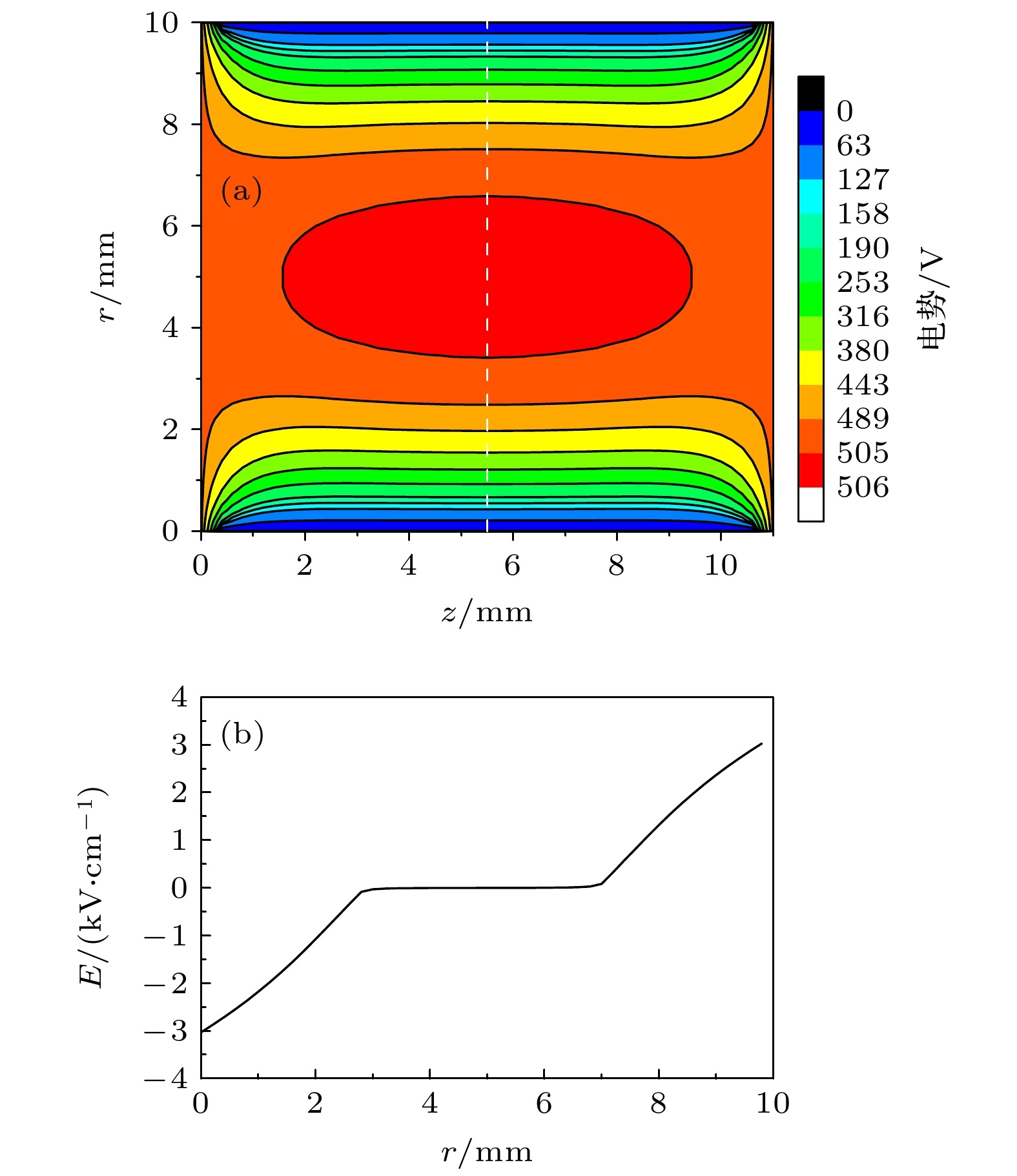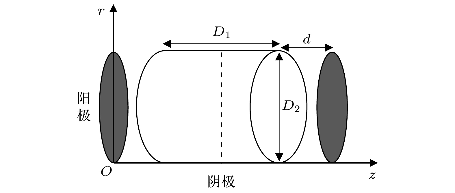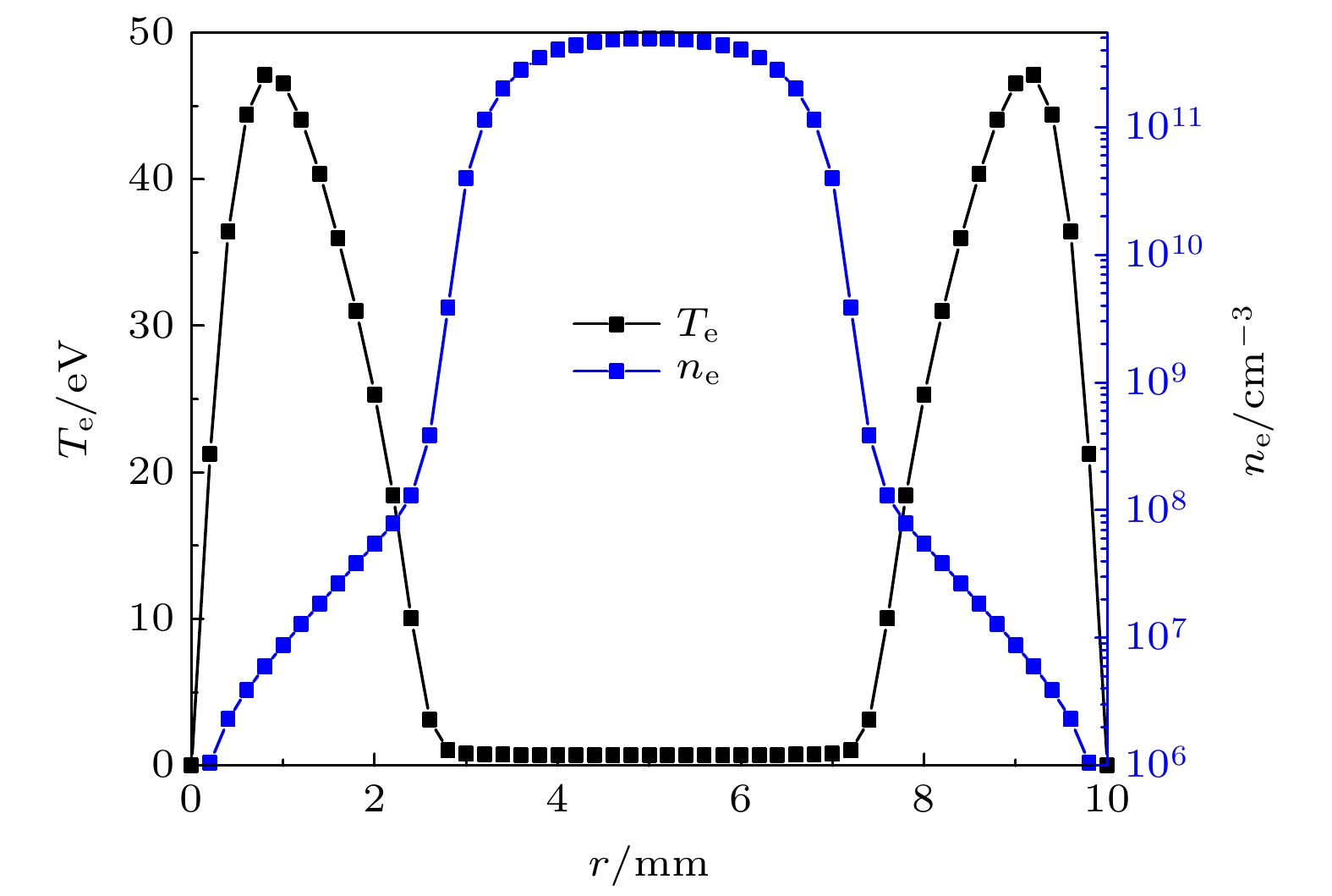 本文利用流体模型对气压为266 Pa的氧气环境下空心阴极放电的放电特性及不同粒子的生成损耗机制进行了模拟研究. 模型中包含11种粒子和48个反应. 在该模拟条件下, 周围阴极所对应的负辉区产生重叠, 表明放电中存在较强的空心阴极效应. 计算得到了不同带电粒子与活性粒子的密度分布. 带电粒子密度主要位于放电单元中心区域, 电子和负氧离子O –是放电体系中主要的负电荷, 其密度峰值分别达到5.0 × 10 11cm –3和1.6 × 10 11cm –3;