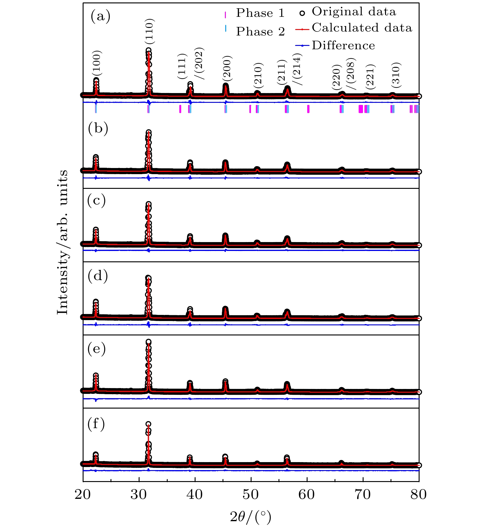 x 相成分/% 晶格参数/Å 晶胞体积/Å3 R因子 a c a R PC R PC R PC Rwp/% Rwp/% χ2 0 75.64 24.36 5.6400(2) 13.8964(0) 3.9893(6) 382.92 63.49 6.98 4.65 2.37 0.05 72.97 27.03 5.6411(7) 13.8983(8) 3.9902(5) 383.03 63.53 5.91 4.06 1.45 0.10 72.70 27.30 5.6390(5) 13.8909(8) 3.9938(5) 382.54 63.71 5.23 3.81 1.24 0.20 68.48 31.62 5.6398(2) 13.8962(4) 3.9911(4) 382.79 63.58 6.39 4.49 1.85 0.50 67.21 32.79 5.6458(1) 13.8768(6) 3.9898(0) 383.07 63.51 5.80 4.09 1.50 1.00 66.41 33.59 5.6487(1) 13.8299(8) 3.9914(5) 382.17 63.59 5.88 4.35 1.36 -