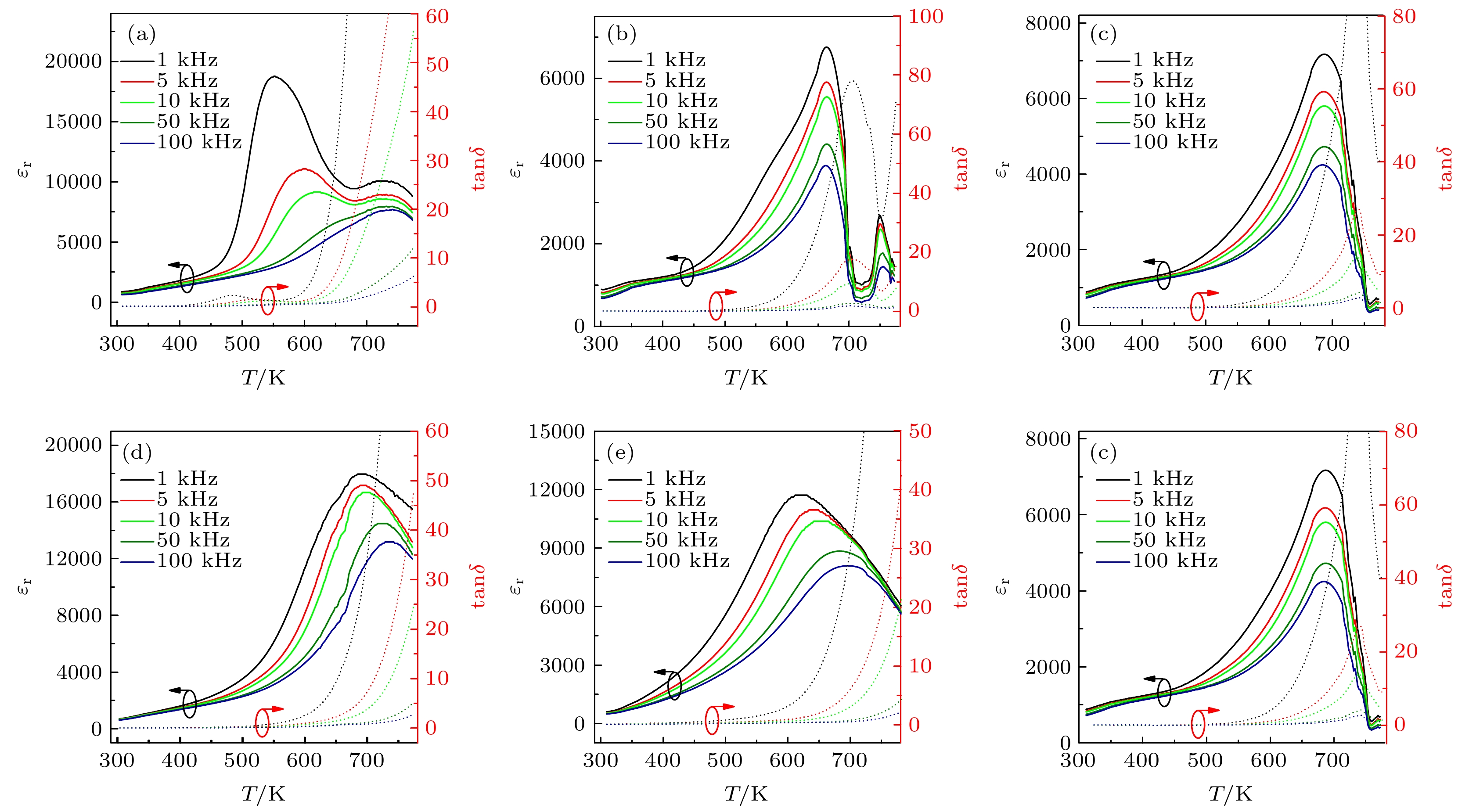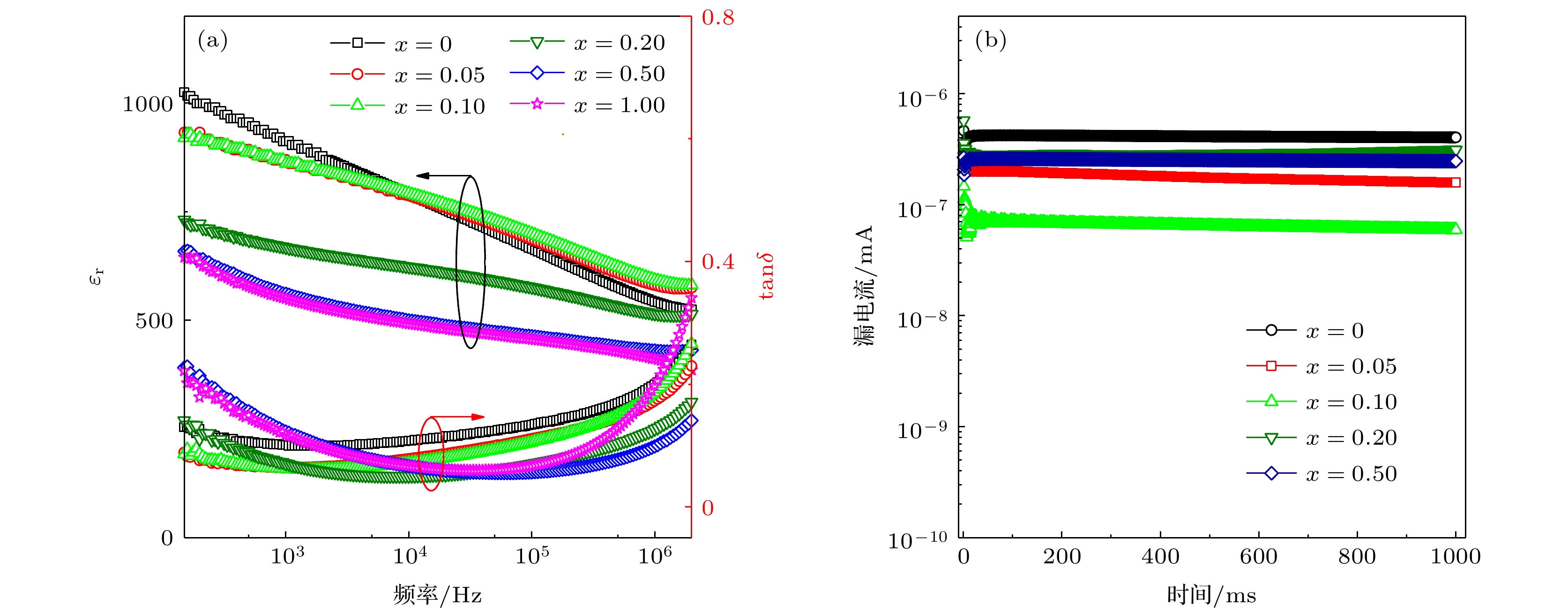 BiFeO 3(BFO)作为反铁磁性和铁电性共存的多铁性材料, 其饱和极化强度理论值大于100 μC/cm 2, 居里温度为830 ℃, 具有较强的电卡效应. 但是由于BFO高温烧结过程中Bi 2O 3易挥发, 铁离子易变价, 导致BFO中缺陷较多, 漏电流较大, 其铁电特性难以发挥出来. 虽然采用与BaTiO 3(BTO)等氧化物铁电体形成固溶体的方法可以减小漏电流, 但是漏电流和高介电损耗问题仍然存在. 本文试图通过添加锰离子到BFO-BTO固溶体的方法解决这一问题. 采用传统的高温固相反应法制备了0.7BiFeO 3-0.3BaTiO 3+ x%MnO 2(BFO-BTO+ x%MnO 2, 其中 x%为质量分数)陶瓷, 研究了MnO 2掺杂对BFO-BTO固溶体的微观结构、介电和铁电性能的影响. 值得注意的是, BFO-BTO+ x%MnO 2样品测试结果证明少量掺杂MnO 2能降低BFO-BTO陶瓷的介电损耗和漏电流, 这是由于掺杂Mn 4+补偿氧空位浓度所致. 另外, 0.7BFO-0.3BTO+0.5%MnO 2陶瓷在100 kV/cm时的最大极化强度达到50.53 μC/cm 2. 最后利用热电偶直测法测试了BFO-BTO+ x%MnO 2陶瓷的电卡效应, 发现极化翻转方法能使BFO-BTO+ x%MnO 2陶瓷的电卡效应翻倍增大, 其中 x= 0样品从0至–30 kV/cm的变化与30 kV/cm至0的电场变化相比, 增大近8倍, 并且证实该方法同样适用于多晶一级相变铁电体.As a kind of ferroelectric and antiferromagnetic coexistent multi-ferroic material, BiFeO 3(BFO) has a theoretical saturation polarization over 100 μC/cm 2, and a Curie temperature of 830 ℃, which may offer a huge electrocaloric effect. However, owing to the evaporation of Bi 2O 3in the sintering process at high temperatures and the variation of chemical valence of iron ions, there are lots of point defects and also a large leakage current existing in BFO, making the ferroelectricity of BFO hard to develop and measure. Although the forming of solid solution with BaTiO 3(BTO) or other oxide ferroelectrics may mitigate the leakage current, high loss tangent is still existent. This work tries to address this issue by adding manganese ions into the BFO-BTO solid solution. The 0.7(BFO)-0.3(BTO)+ x%MnO 2ceramics are prepared through using the conventional solid-state reaction at high temperature. The microstructure, dielectric characteristic and ferroelectric characteristic are investigated by doping different Mn 4+ions. Results indicate that the crystallographic structure is of rhombohedral and pseudocubic phase coexistence. It is observed that a certain content of Mn 4+ions may lead both the loss tangent and the leakage current for BFO-BTO ceramic to decrease, which is due to the compensation of dopant Mn 4+ions for the oxygen vacancies. In addition, the 0.7BFO-0.3BTO+0.5%MnO 2ceramic arrives at a maximum polarization of 50.53 μC/cm 2at 100 kV/cm. Finally, a direct approach is used to measure the electrocaloric effect. It is found that using the polarization flip method, the ECE temperature change is observed to increase almost 8 times when the electric field changes from 0 to –30 kV/m with respect to that when the electric field decreases from 30 kV/cm to 0. This verifies that the Lu et al’s method is also applicable to polycrystalline first-order phase transition ferroelectrics.