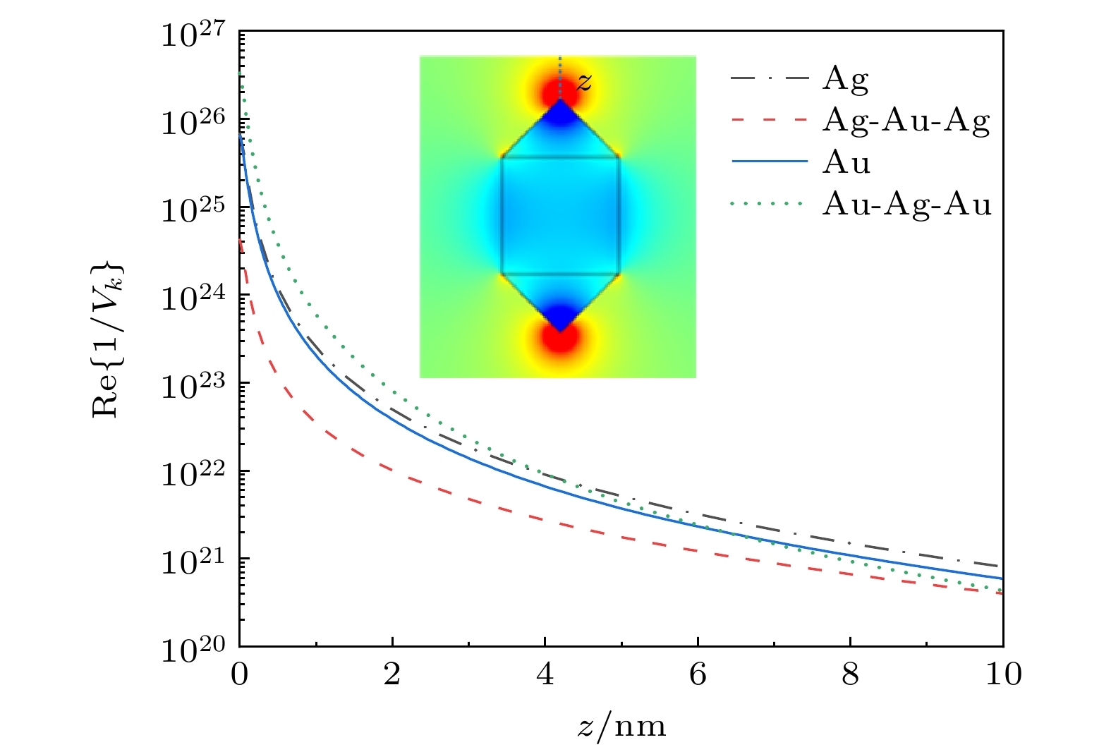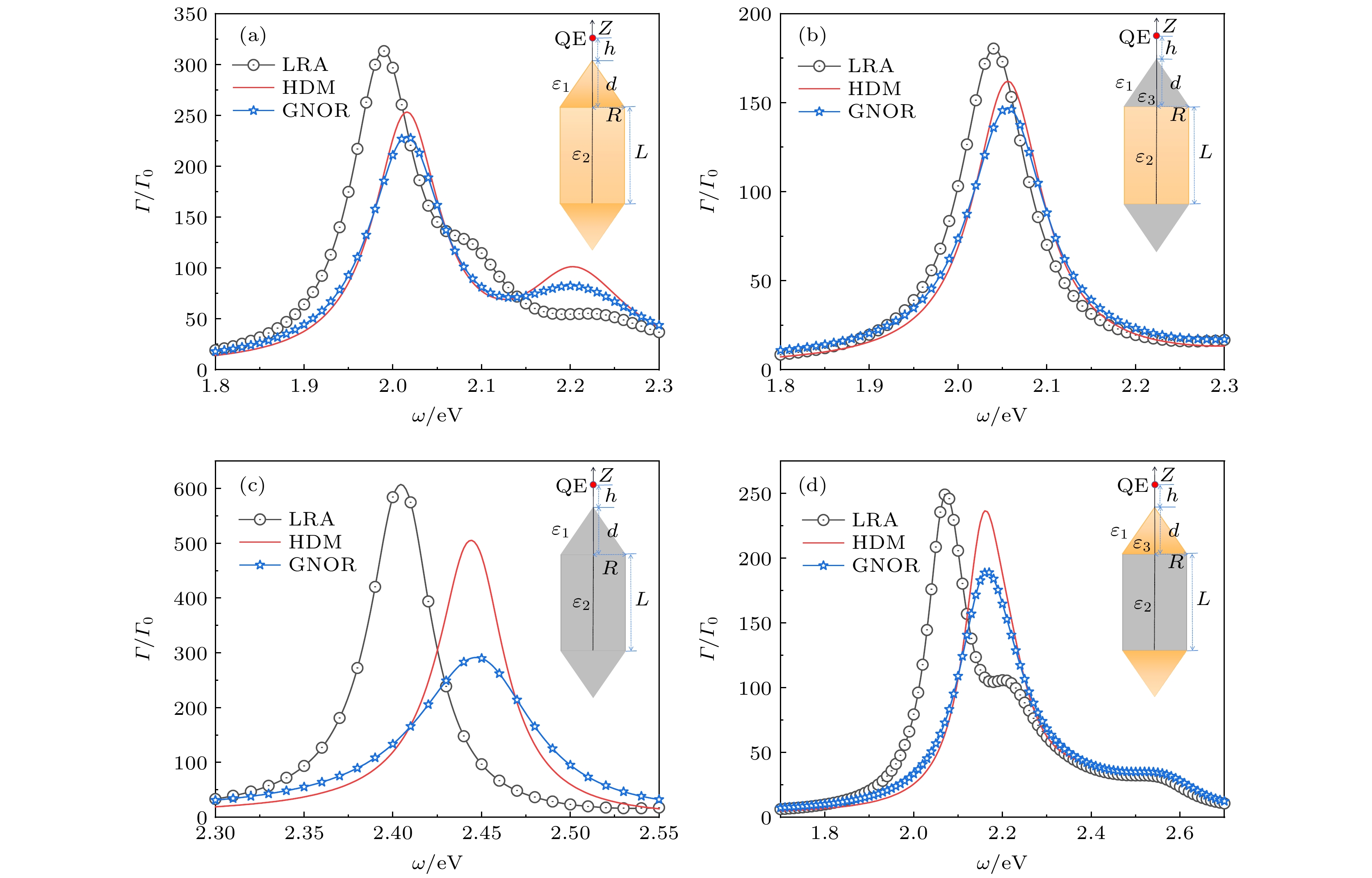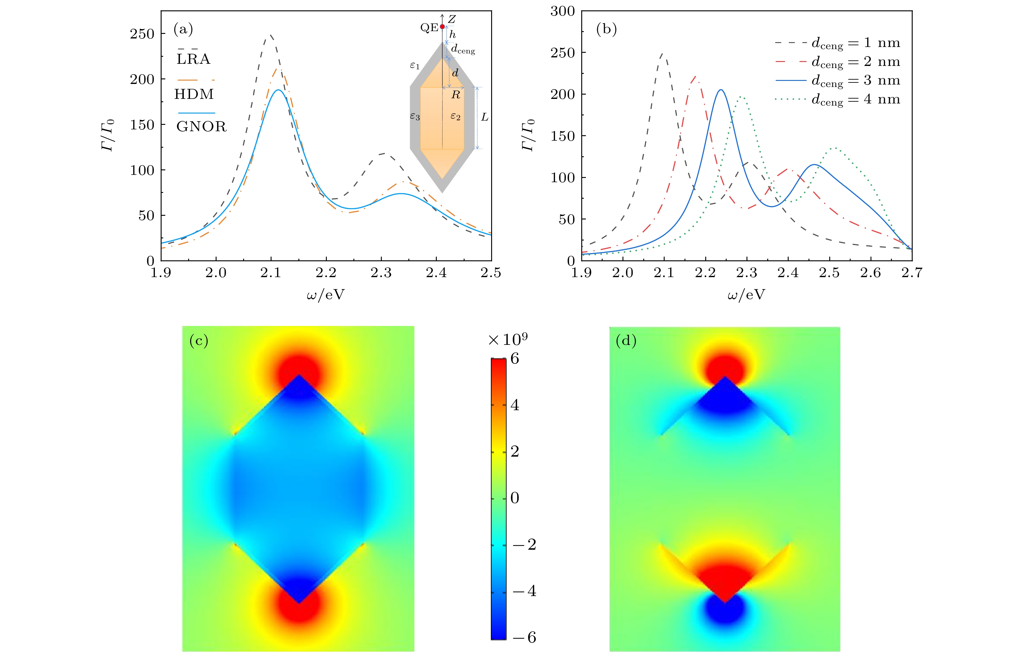 金属纳米柱具有优异的光学性能, 其表面等离激元共振可通过纵横比灵活地调节, 且能将光场局域到亚波长甚至纳米尺度, 被广泛应用于自发辐射调控. 然而, 当纳米柱的端面形貌和材料不同时, 附近量子点的自发辐射特性如何变化尚不明确. 本文分别采用经典的德鲁德局域响应近似、非局域流体动力学模型和广义的非局域光响应模型, 基于有限元方法, 系统地研究金属纳米柱结构的端面形貌、尺寸以及材料对附近量子点自发辐射增强特性的影响. 结果表明, 当端面形貌由尖端逐渐变为圆柱时, 自发辐射增强谱发生明显红移, 峰值逐渐增大. 相比于金纳米结构, 当尖端材料由金改为银时, 自发辐射增强谱蓝移, 峰值略有降低, 而当柱身也改为银时, 即全银纳米结构, 自发辐射增强谱大幅蓝移, 峰值急剧增大. 对于两种金属构成的核壳结构, 壳层金属对内部金属表面等离激元共振具有屏蔽作用, 随着壳层厚度的增大, 核壳结构中表面等离激元共振逐渐接近壳层金属表面等离激元共振, 对金纳米结构包覆银, 共振峰蓝移, 而对银纳米结构包覆金, 共振峰红移.Metal nanorods show excellent optical properties, since the plasmonic resonance frequency can be tuned by its aspect ratio and the optical field can be confined within a region of subwavelength, even within a nanometer region. It has the ability to flexibly modify the spontaneous emission properties of a nearby quantum emitter. However, it is unclear how the emission property changes when the metal nanorod has been deposited at the tips or coated on all sides with metal. In this work, the spontaneous emission enhancements of a two-level atom around a tailored nanorod with a wide variety of shapes, dimensions or materials are systematically investigated by the finite element method. Three different optical response models are adopted, including the classical local response approximation (LRA), the nonlocal hydrodynamic model (HDM), and the generalized nonlocal optical response model (GNOR). For a cylindrical nanorod with two endcaps, it is found that the resonance frequency shows large redshift and the emission enhancement peak increases as the endcap gradually changes from cone to cylinder of the same height. The resonance frequency shows small blueshift and the emission enhancement peak decreases slightly as the deposited metal of the conical endcaps changes from gold to silver. However, as the material of the cylinder also changes from gold to silver, becoming an all-silver nanostructure, an obvious blueshift can be detected at the resonance frequency and the emission enhancement peak rises sharply. For bimetal core-shell nanostructure, the shell can screen the surface plasmon of the core from being excited, and the plasmonic resonance associated with shell increases in proportion to the thickness of the shell. The emission enhancement peak for gold nanostructure appears to be blue-shifted when coated with silver. In contrast, it is red-shifted for silver nanostructure coated with gold.