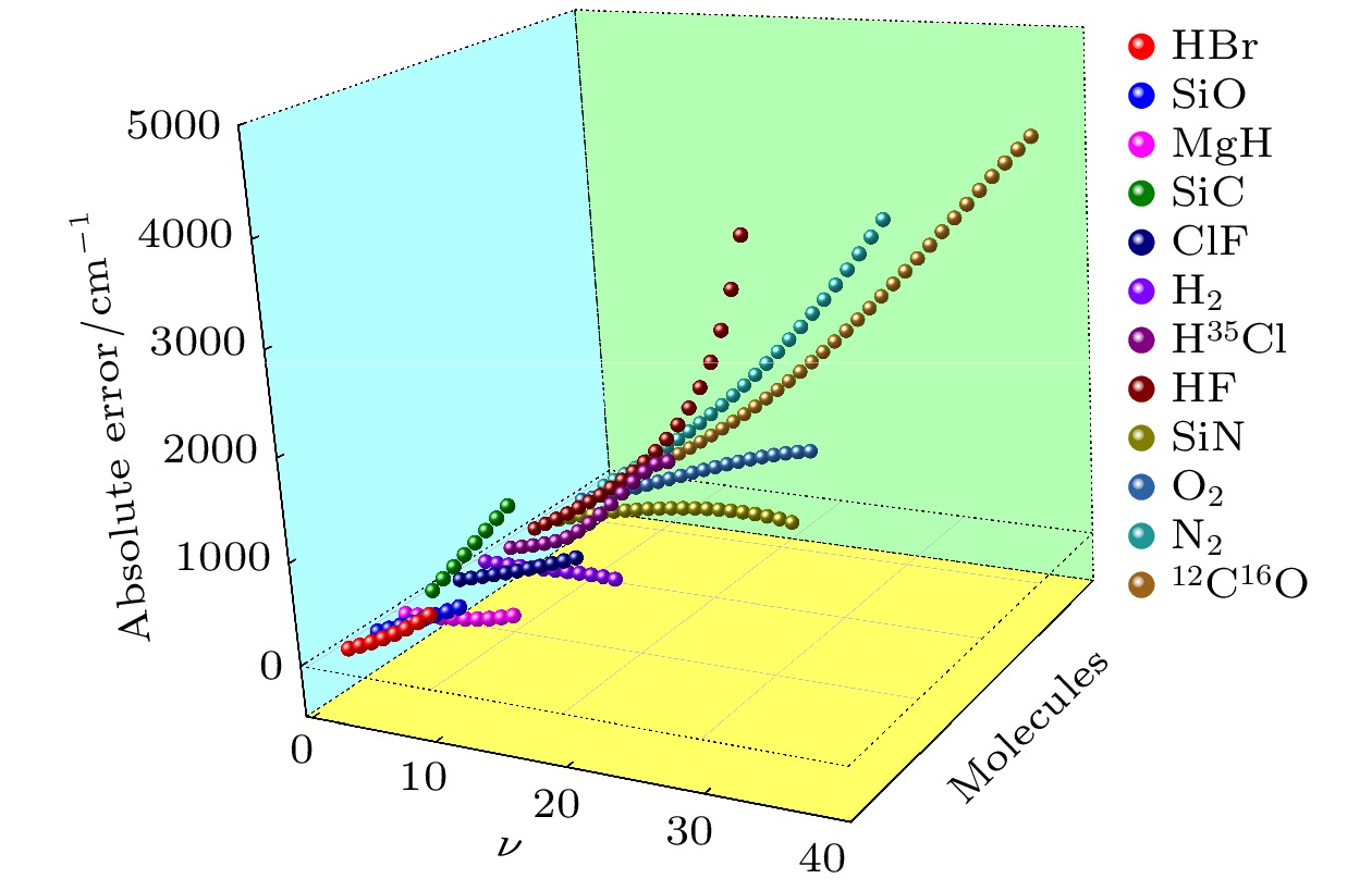 $ \nu $ H2 HF DF H35Cl LiH Li2 0 2179.69 2050.77 1490.30 1483.88 705.08 175.032 1 6341.75 6012.19 4396.97 4369.86 2078.45 521.26 2 10268.40 9801.57 7212.12 7151.86 3406.08 862.26 3 13694.54 13423.60 9937.66 9830.66 4688.81 1198.00 4 17433.22 16882.45 12575.33 12406.71 5927.55 1528.41 ${\text{H}}{}^{{\text{79}}}{\text{Br}}$ N2 BF ClF NO CN 0 1314.65 1175.77 742.00 191.77 948.50 1031.20 1 3873.57 3505.69 2208.00 573.06 2824.50 3073.60 2 6341.99 5806.93 3651.00 951.35 4627.30 5089.70 3 8719.91 8079.47 5072.00 1326.60 6491.90 7079.50 4 11007.01 10323.28 6470.00 1698.90 8283.50 9042.80 Br2 BCl CP CS SiCl O2 0 162.38 416.83 618.19 709.00 267.25 664.69 1 485.53 1242.63 1844.32 2117.00 798.54 2326.53 2 806.51 2058.80 3056.76 3515.00 1325.50 3968.09 3 1125.29 2865.49 4255.53 4902.00 1847.50 5589.60 4 1441.88 3662.85 5440.62 6278.00 2365.50 7191.32 12C16O 13C16O 14C16O 12C17O 13C17O 14C17O 0 1081.77 1057.72 1036.74 1068.03 1043.66 1022.39 1 3225.04 3153.79 3091.61 3184.32 3112.11 3049.05 2 6341.83 5224.54 5122.15 5274.81 5155.92 5052.07 3 7432.21 7270.04 7128.44 7339.54 7175.14 7031.50 4 9496.24 9290.35 9110.52 9378.60 9169.83 8987.38 SO SiC SiN 24Mg16O Na35Cl NaLi 0 576.94 475.47 574.06 391.14 181.90 127.83 1 1740.42 1416.67 1712.46 1165.88 543.05 381.22 2 2916.75 2344.87 2837.85 1930.32 900.70 631.10 3 4105.98 3260.07 3950.20 2684.16 1254.89 877.79 4 5308.16 4162.27 5049.47 3427.11 1605.65 1121.12 MgH AlO AlF Al Cl SiO BH 0 739.11 488.00 394.60 246.60 619.20 1171.06 1 2171.09 1453.40 1180.00 734.10 1848.90 3440.30 2 3539.79 2404.76 1956.10 1217.30 3066.50 5614.11 3 4841.14 3342.19 2722.30 1698.00 4272.30 7694.16 4 6070.50 4265.42 3480.20 2175.20 5466.10 9684.16 输入变量$X$ 目标变量$\hat Y:{E_\nu }$ 文献[59] $E_\nu ^{{\text{this work}}}$ $ E_\nu ^{\text{T}} $ $ E_\nu ^{\text{Q}} $ 171.702 172.1623 175.03 174.059 178.903 511.410 513.631 521.26 518.255 531.853 846.059 849.982 862.26 857.832 878.969 1175.599 1181.177 1198.00 1191.397 1173.096 1499.987 1507.169 1528.41 1519.330 1496.133 1819.161 1827.906 1853.46 1841.991 1906.993 2133.063 2143.328 2173.07 2159.852 2106.362 2441.620 2453.368 2487.19 2471.991 2438.853 2744.753 2757.954 2795.74 2778.334 2693.961 3042.368 3057.002 3090.64 3072.703 3102.89 3334.377 3350.421 3395.80 3373.920 3369.871 3620.669 3638.108 3687.11 3663.159 3630.759 3901.126 3919.951 3972.43 3946.618 4009.308 4175.619 4195.927 4251.73 4223.997 4297.662 4444.003 4465.597 4524.78 4495.270 4487.998 4706.126 4729.113 4791.43 4760.610 4530.406 4961.805 4986.210 5051.53 5018.559 4962.152 5210.858 5236.706 5304.93 5270.268 5225.061 5453.074 5480.402 5551.4 5514.831 5506.045 5688.224 5717.081 6790.71 5753.539 5701.189 5916.059 5946.503 6022.66 5983.959 6022.425 注: 文献[59]的数据和$E_\nu ^{{\text{this work}}}$不作为输入数据. HF$ \nu $ ${E_\nu }$ ${\delta _{{\text{this work}}}}$ $E_\nu ^{{\text{this work}}}$ $\delta _\nu ^{\text{Q}}$ $E_\nu ^{\text{Q}} $ 0 2050.771 0.04093 2134.714 0.01200 2075.378 1 6012.194 0.05485 6341.983 0.01562 6106.099 2 9801.566 0.03044 10099.884 0.01694 9967.644 3 13423.603 0.001166 13407.950 0.01797 13664.780 4 16882.448 0.004083 16951.383 0.01893 17202.024 5 20181.824 0.0005710 20193.347 0.01990 20583.515 6 23324.620 0.008118 23135.267 0.02093 23812.920 7 26313.146 0.01637 25882.423 0.02205 26893.357 8 29148.927 0.01435 28730.690 0.02327 29827.322 9 31832.367 0.01963 31207.435 0.02464 32616.648 10 34362.909 0.004397 34211.806 0.02618 35262.441 11 36738.405 0.01714 36108.527 0.02794 37764.995 12 38954.943 0.01769 38265.658 0.03000 40123.716 13 41006.593 0.01487 40396.799 0.03244 42337.026 14 42884.443 0.01483 42248.544 0.03539 44402.227 15 44576.005 0.01264 44012.508 0.03902 46315.354 16 46064.207 0.009428 45629.921 0.04357 48071.083 17 47325.663 0.006234 47030.644 0.04938 49662.648 18 48328.541 0.0003463 48311.807 0.05697 51081.932 19 49026.508 0.005459 49294.146 0.06717 52319.807 HBr$ \nu $ ${E_\nu }$ ${\delta _{{\text{this work}}}}$ $E_\nu ^{{\text{this work}}}$ $\delta _\nu ^{\text{Q}}$ $E_\nu ^{\text{Q}}$ 0 1314.653 0.02080 1341.993 0.01314 1331.929 1 3873.566 0.06601 4129.243 0.01762 3941.805 2 6341.990 0.01130 6413.868 0.01935 6464.682 3 8719.913 0.01104 8816.207 0.02093 8902.436 4 11007.012 0.01316 11151.888 0.02259 11255.684 5 13202.585 0.01387 13385.700 0.02437 13524.341 6 15305.471 0.01795 15580.146 0.02630 15707.958 7 17313.970 0.002268 17274.704 0.02841 17805.806 H35Cl $ \nu $ ${E_\nu }$ ${\delta _{{\text{this work}}}}$ $E_\nu ^{{\text{this work}}}$ $\delta _\nu ^{\text{Q}}$ $E_\nu ^{\text{Q}}$ 0 1483.881 0.01052 1468.276 0.01050 1468.294 1 4369.857 0.01009 4413.952 0.003299 4384.273 2 7151.864 0.009209 7217.724 0.006637 7199.330 3 9830.658 0.01910 10018.462 0.008566 9914.869 4 12406.710 0.004748 12465.616 0.01028 12534.187 5 14880.156 0.002706 14839.892 0.01250 15066.200 6 17250.746 0.002461 17208.284 0.01563 17520.446 7 19517.778 0.003098 19457.320 0.01906 19889.759 8 21680.003 0.01529 21348.516 0.02231 22163.716 9 23735.517 0.01306 23425.579 0.02561 24343.381 10 25681.608 0.005119 25813.072 0.02871 26418.895 11 27514.609 0.009392 27256.180 0.03154 28382.336 12 29229.647 9.641 E-05 29226.829 0.03378 30217.072 13 30820.291 0.008591 30555.509 0.03507 31901.224 14 32278.144 0.004052 32408.930 0.03476 33400.117 Na35Cl $ \nu $ ${E_\nu }$ ${\delta _{{\text{this work}}}}$ $E_\nu ^{{\text{this work}}}$ $\delta _\nu ^{\text{Q}}$ $E_\nu ^{\text{Q}}$ 0 181.899 0.008954 180.270 0.04204 174.252 1 543.050 0.01550 534.633 0.03299 525.138 2 900.702 0.007215 894.204 0.03107 872.718 3 1254.890 0.01144 1240.538 0.03014 1217.063 4 1605.649 0.005573 1596.700 0.02955 1558.204 5 1953.013 0.008120 1937.155 0.02912 1896.150 6 2297.016 0.005233 2284.995 0.02877 2230.937 7 2637.692 0.001172 2640.784 0.02847 2562.592 8 2975.075 0.01092 2942.574 0.02821 2891.142 9 3309.198 0.001195 3305.243 0.02798 3216.614 10 3640.093 0.01084 3600.653 0.02776 3539.057 11 3967.795 0.001966 3959.992 0.02755 3858.485 12 4292.334 0.002171 4283.017 0.02735 4174.918 Na35Cl