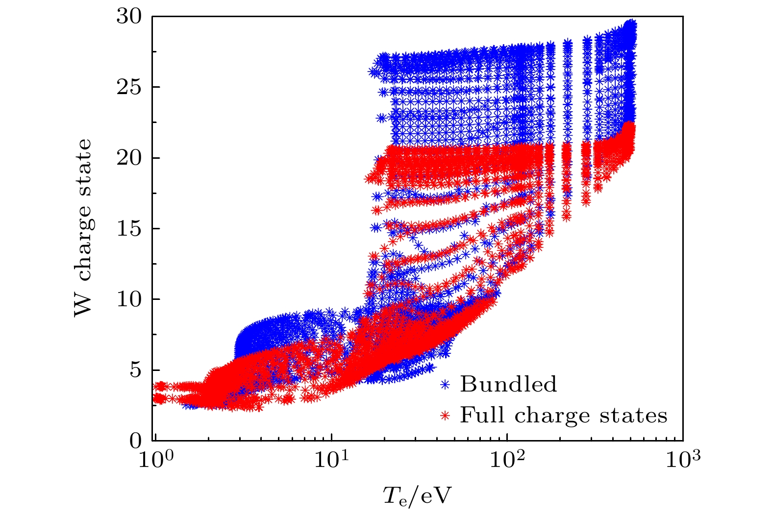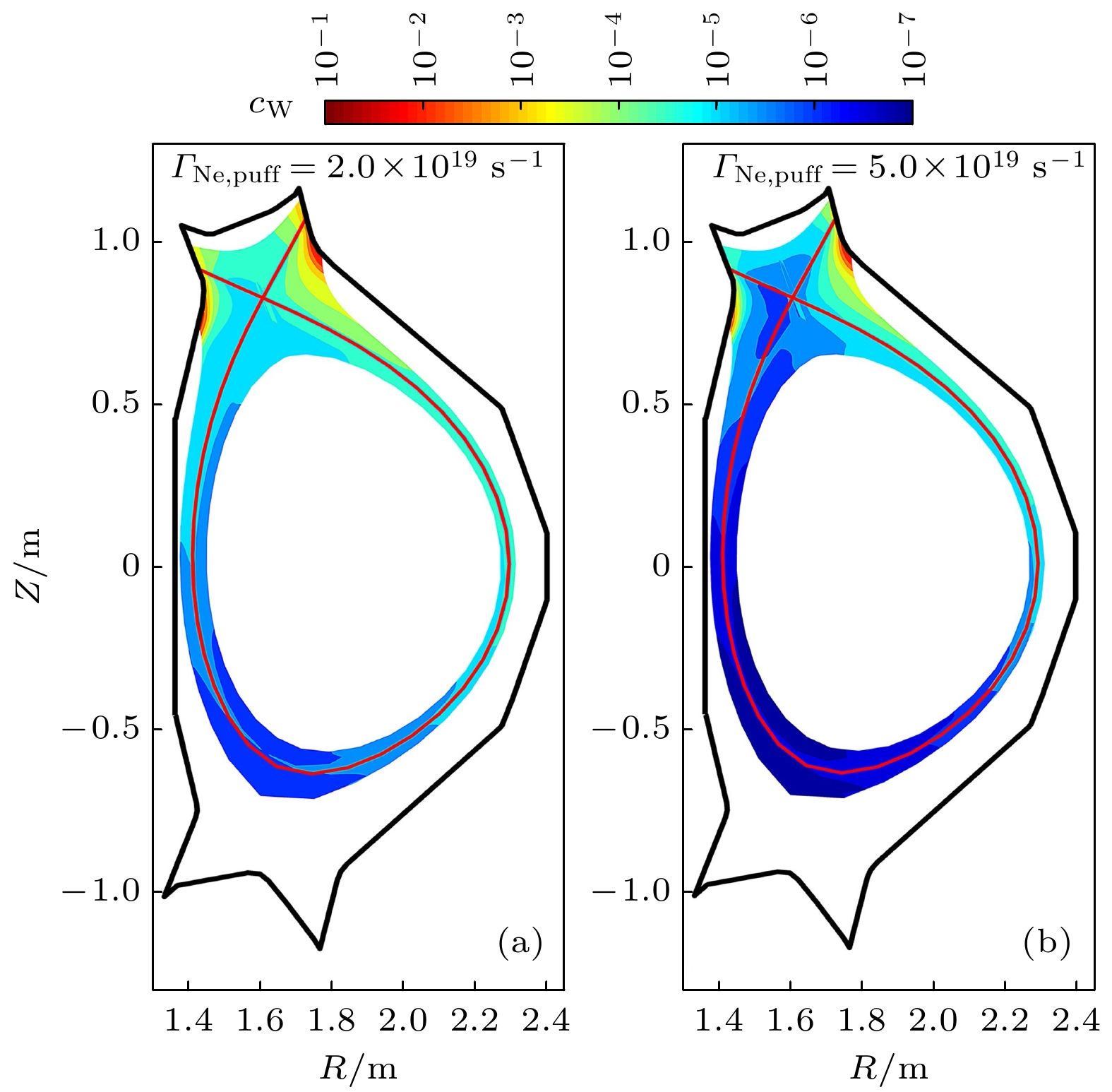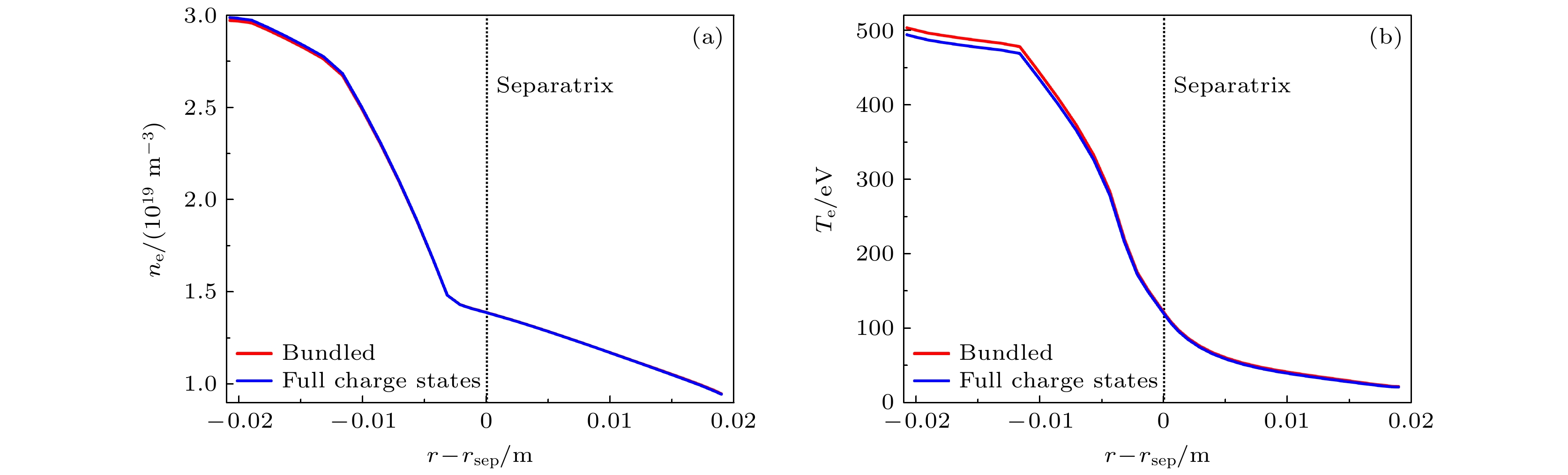 重杂质(如钨)聚芯是未来托卡马克反应堆中等离子体高性能运行所面临的严峻挑战. 开展多流体及动力学模拟以研究氖杂质注入条件下, 东方超环EAST托卡马克中等离子体高约束时的钨杂质边界输运特性. 结果表明, 低电离态钨离子主要聚集在碰撞率较高的偏滤器区域, 流体近似可很好地满足; 高电离态钨离子密度相对较低且主要位于碰撞率相对较低的芯部, 多流体与动力学模拟结果差异显著; 但二者计算的钨杂质总密度差异较小(< 30%). 多流体模拟中, 除将钨离子考虑为74种流体外, 还将电离能接近的钨离子进行价态捆绑. 比较发现, 价态捆绑可显著降低计算成本, 但在高再循环(或部分脱靶)运行机制下可显著高估(低估)偏滤器区域等离子体温度(密度), 从而大幅低估钨电离源及钨密度, 其根源在于价态捆绑对钨离子平均电离态和偏滤器区域辐射功率损失的显著影响. 模拟结果还表明, 氖杂质注入促进偏滤器脱靶可有效缓解钨杂质聚芯.Accumulation of tungsten (W) in core is a serious challenge for achieving high-performance plasmas in future tokamak reactors, thus W impurity transport is a highly concerned topic in the tokamak physics researches. Multi-fluid model and kinetic model are the numerical tools widely used for investigating and/or predicting impurity behaviors in the boundary of tokamak plasma. Generally, the applicability of multi-fluid model for impurity transport modeling requires that the collision mean-free-path should be smaller than the gradient scale lengths of particles, which may not be always satisfied. It is performed and comparatively investigated to evaluate the applicability of multi-fluid model for W impurity transport modeling, multi-fluid (SOLPS-ITER) modeling and kinetic (DIVIMP) modeling of W impurity transport in the edge of high-confinement plasma in Experimental Advanced Superconducting Tokamak (EAST) during neon impurity seeding. It is found that low-charge-state W ions are mainly located in the divertor region near the target plate where plasma collisionality is relatively high due to the relatively low/high local plasma temperature/density. Hence, the fluid assumption for transport of lowly-charged W ions can be well satisfied. Consequently, the density of lowly-charged W ions predicted by SOLPS-ITER and that calculated by DIVIMP are almost similar. Owing to the fact that the density of highly-charged W ions is relatively low and these particles mainly exist in the upstream (e.g. the main SOL and core) where plasma collisionality is relatively low, the fluid approximation cannot be well satisfied. However, the total W impurity density calculated by the kinetic code DIVIMP and the multi-fluid model SOLPS-ITER are found to be in agreement with each other within a factor of 1.5 for the simulation cases presented in this contribution. Besides, the multi-fluid simulation with bundled charge state model has also been performed, the obtained results are compared with those from the multi-fluid modeling with W ions treated as 74 fluids. It is revealed that in simulation cases with neon impurity seeding and with divertor plasmas in high-recycling or partially detached regimes, the bundling scheme, which is commonly used for saving the computation cost in multi-fluid modeling, tends to overestimate the average charge state of W ions and thus tends to underestimate the radiation power loss, especially in the divertor region. Consequently, under the circumstance that W impurity radiation dominates the radiative power loss in divertor region, plasma temperature/density can be largely overestimated/underestimated, leading to the underestimation of W ion ionization source and W impurity density. Moreover, simulation results demonstrate that W accumulation in core can decrease effectively during divertor detachment promoted by neon seeding.