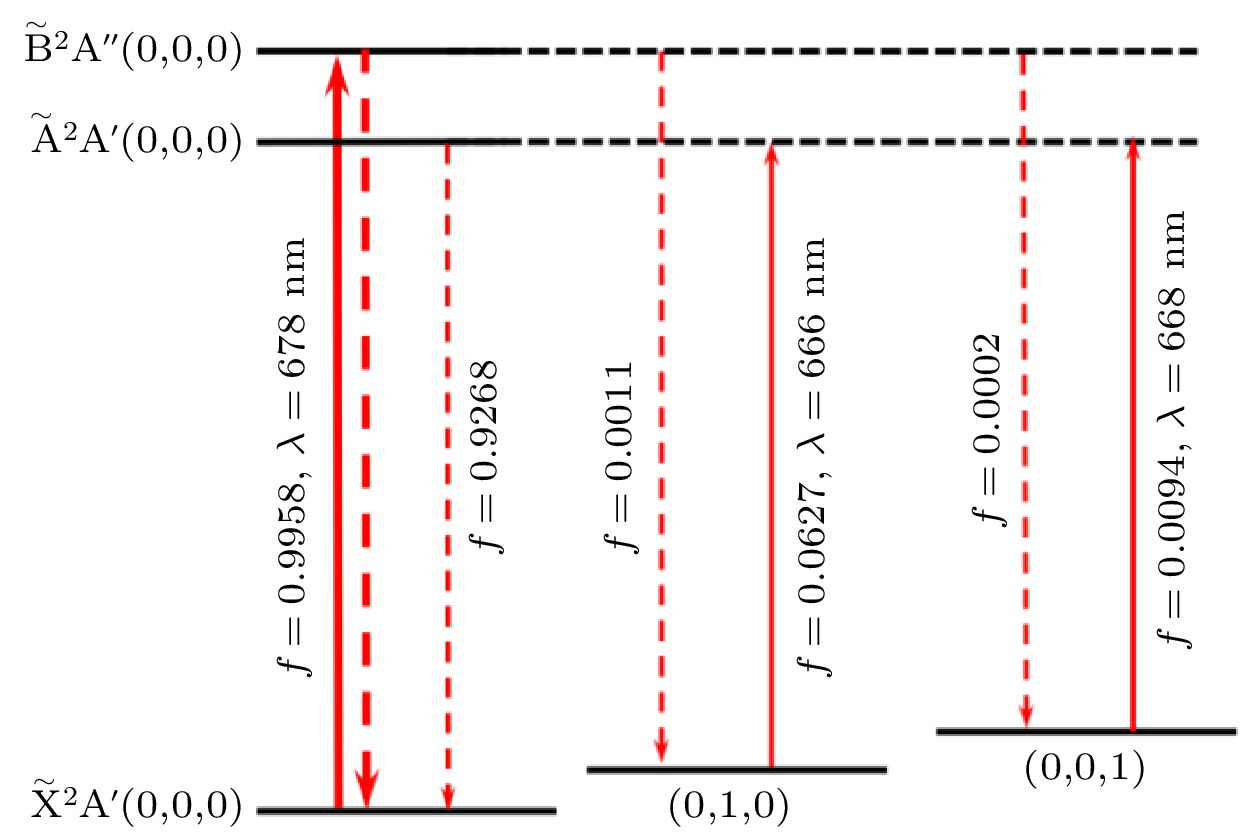 $ {\tilde{{\mathrm{X}}}}^{2}{{\mathrm{A}}}' $ 几何结构参数分别为 R CaS= 2.564 Å; R SH= 1.357 Å; ∠CaSH= 91.0°; 从$ {\tilde{{\mathrm{X}}}}^{2}{{\mathrm{A}}}^{\prime} $ 到$ {\tilde{{\mathrm{A}}}}^{2}{{\mathrm{A}}}^{\prime} $ ,$ {\tilde{{\mathrm{B}}}}^{2}{{\mathrm{A}}}^{{\prime\prime} } $ 和$ {\tilde{{\mathrm{C}}}}^{2}{{\mathrm{A}}}^{\prime} $ 的垂直激发能分别为1.898, 1.945和1.966 eV, 与已有实验符合得很好. 进一步, 在3ζ级别基组上, 计算了该分子4个最低电子态的势能面, 并通过求解核运动方程给出CaS键伸缩、CaSH弯曲两个振动模的频率. 最后, 理论计算给出的$ {\tilde{{\mathrm{X}}}}^{2}{{\mathrm{A}}}^{\prime} ({\mathrm{0, 0}}, 0) $ 态到激发态$ {\tilde{{\mathrm{A}}}}^{2}{{\mathrm{A}}}^{\prime} ({\mathrm{0, 0}}, 0) $ ,$ {\tilde{{\mathrm{B}}}}^{2}{{\mathrm{A}}}^{{\prime\prime} }({\mathrm{0, 0}}, 0) $ 和$ {\tilde{{\mathrm{C}}}}^{2}{{\mathrm{A}}}^{\prime} ({\mathrm{0, 0}}, 0) $ 跃迁的Frank-Condon (FC)因子分别为0.9268, 0.9958和0.9248. 结合Frank-Condon因子和激发态寿命分析, 本文给出了可能用于CaSH冷却的光学循环, 为CaSH的激光冷却提供了理论参考.-