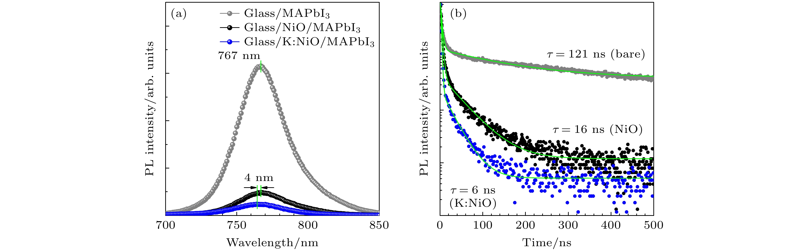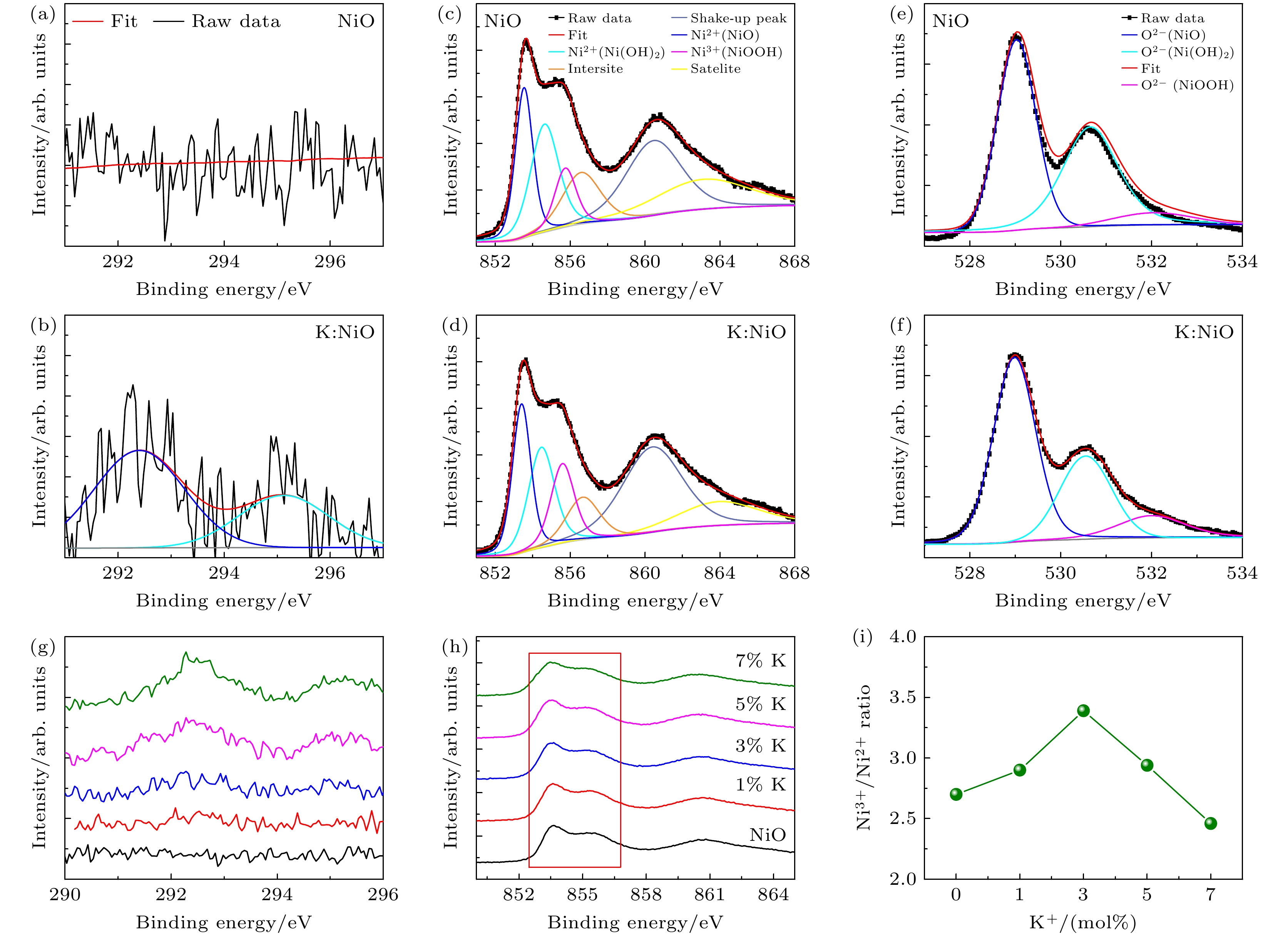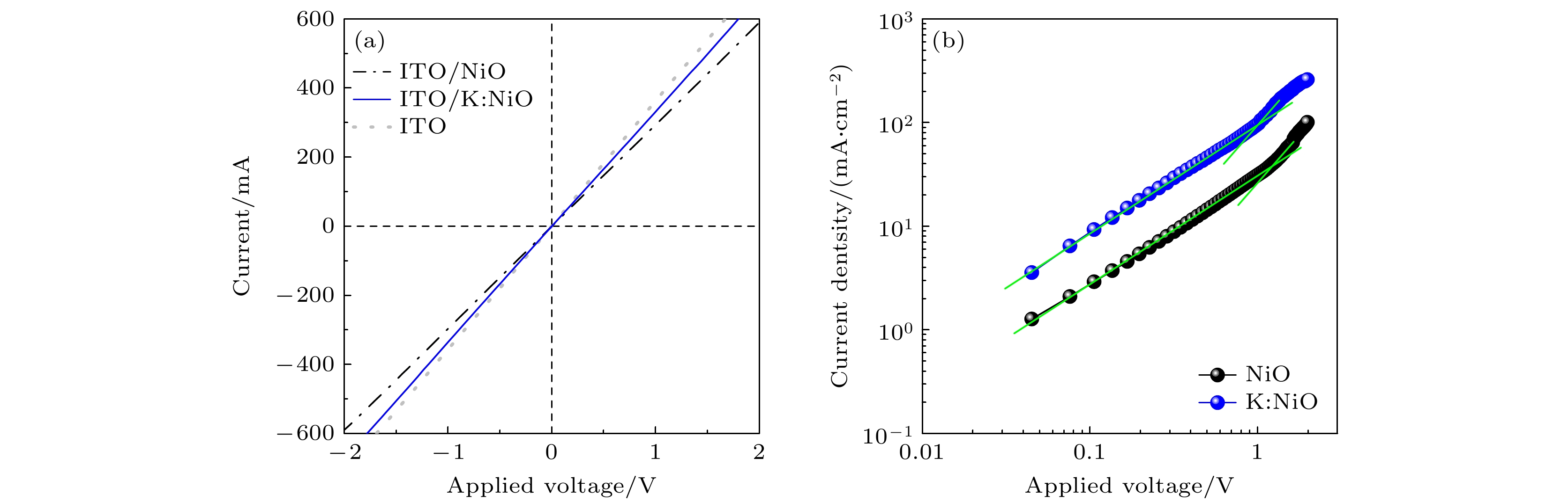 反式钙钛矿太阳电池(perovskite solar cell, PSC)是当前钙钛矿电池领域的重点发展方向, 其中, NiO作为一种无机空穴传输材料, 具有良好的化学稳定性, 被广泛用于制备反式结构器件. 然而, 由于NiO的电导率和空穴迁移率相对较低且与钙钛矿薄膜的界面接触较差, 使其在实现高性能反式PSC方面存在困难. 为克服上述问题, 本工作采用乙酸钾为钾源, 通过在NiO纳米晶中掺入钾离子(K +)有效提升了NiO的电导率和空穴迁移率. 此外, 掺杂K +后, NiO与钙钛矿薄膜之间具有更好的界面接触, 光生电荷的分离更有利. 实验结果表明, 最优的K +掺杂摩尔分数为3%, 经过K +掺杂后电池效率从15.15%提高到16.75%, 这主要得益于短路电流密度和填充因子的提升.Perovskite solar cells (PSCs) with inverted structures have received significant attention in the field of photovoltaics. NiO is one of the commonly explored hole transport materials (HTMs) because of its excellent chemical stability in comparison with organic materials. Pure NiO is an insulator, but the presence of nickel vacancies can lead to the formation of Ni 3+ions,resulting in p-type semiconductor properties. However, the low conductivity and poor interfacial contact between NiO and perovskite thin films still pose challenges in achieving high-performance inverted PSCs. To solve these problems, potassium acetate is used as a potassium source for a nickel precursor, and therefore potassium ions (K +) are doped into NiO nanocrystals. The introduction of K +into NiO leads to the formation of Ni 3+ions, thereby increasing the conductivity and hole mobility of NiO. Furthermore, K +-doped NiO exhibits better interface contact with the perovskite film, facilitating the efficient separation of photo-generated charges and showing a strong photoluminescence quenching effect. Experimental results demonstrate that the optimal concentration of K +doping is 3 mol%, and the PSCs prepared with K +-doped NiO exhibit a significant increase in efficiency, from 15.15% to 16.75%, which is attributed primarily to the improvements in the short-circuit current density and fill factor. These improvements highlight the importance of enhanced conductivity and better interfacial contact achieved through K +doping for charge carrier collection, effectively addressing the limitations of NiO in inverted PSCs.