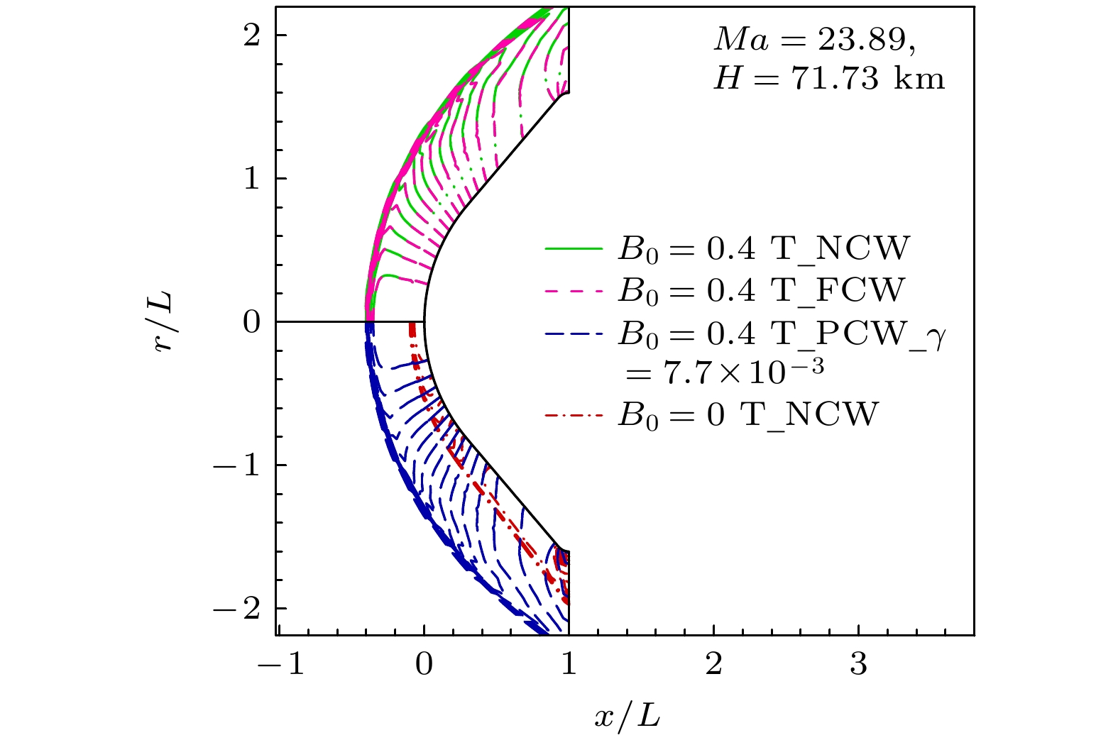 以轨道再入实验飞行器为研究对象, 采用热化学非平衡磁流体动力学模型对高超声速飞行器的表面热流进行数值模拟, 分析了不同飞行工况下壁面催化条件对气动热环境影响规律, 研究了外加磁场条件对热化学非平衡流场影响机制. 结果表明: 再入过程中, 表面热流随催化复合系数的增加呈单调递增分布, 壁面催化条件显著影响磁流体动力学控制效果, 总热流密度与壁面附近原子组分堆积量、扩散梯度及温度梯度密切相关. 外加磁场作用下, 壁面附近氧原子、氮原子组分堆积量减少; 洛伦兹力导致激波脱体距离增大, 组分扩散梯度、壁面温度梯度降低. 磁控热防护系统“电磁冷却”能力从大到小依次为全催化、有限催化、非催化壁面.In the re-entry process of the vehicle into the atmosphere, the high-temperature environment, induced by the compression of the strong shock wave and viscous retardation, is created around the head of a vehicle. These generate a conductive plasma flow field, which provides a direct working environment for the application of magnetohydrodynaimic (MHD) control technology. Numerical simulations based on thermochemical non-equilibrium MHD model are adopted to analyze the surface heat flux of an orbital reentry experiment (OREX) vehicle. The influences of wall catalytic conditions on the aerothermal environment under different flight conditions are discussed. In addition, the control mechanism of an external magnetic field on high-temperature thermochemical non-equilibrium flow field is analyzed. The results show that the distribution of surface heat flux monotonically increases with the catalytic recombination coefficient increasing, and the surface heat flux rises and then drops with the flight altitude decreasing. Moreover, the wall catalytic properties significantly affect the efficiency of MHD control technology, and the total heat flux is closely related to the accumulation of atomic components, diffusion gradient and temperature gradient near the wall region. With an external magnetic field applied, the accumulation of oxygen atoms and nitrogen atoms near the wall can be reduced. Moreover, the Lorentz force can increase the shock standoff distance, and then reduce the component diffusion gradient and wall temperature gradient. Under three different wall catalytic conditions, the ability to control the surface heat flux MHD is ranked from strong to weak as fully catalyzed, partially catalyzed and non-catalyzed.