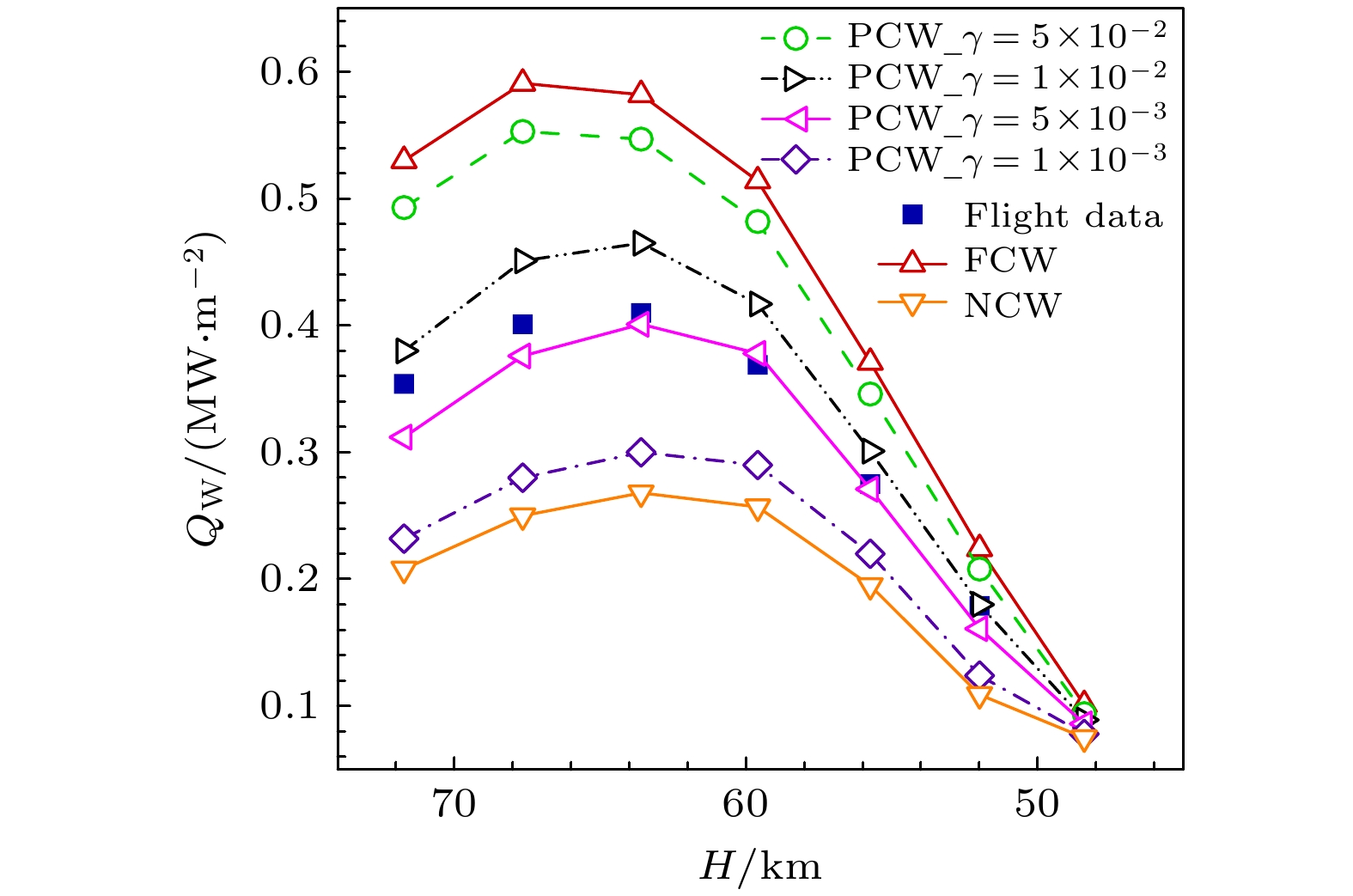 反应类型 反应表达式 控制温度 离解反应 $ {\text{AB}} + {\text{M}} \rightleftarrows {\text{A}} + {\text{B}} + {\text{M}} $ $ 正向 : {T}_{\text{f}} = {T}^{\alpha }{T}_{v}^{1-\alpha };\text{ }逆向 : {T}_{\text{b}} = T $ 交换反应 $ \begin{array}{c} {\text{AB}} + {\text{C}} \rightleftarrows {\text{A}} + {\text{BC}} \\ {\text{A}}{{\text{B}}^ + } + {\text{C}} \rightleftarrows {{\text{A}}^ + } + {\text{BC}} \end{array} $ $ 正向 : {T}_{\text{f}} = T;\text{ }逆向 : {T}_{\text{b}} = T $ 一般电离反应 $ \begin{array}{c} {\text{A}} + {\text{B}} \rightleftarrows {\text{A}}{{\text{B}}^ + } + {{\mathrm{e}}^ - } \\ {\text{AB}} + {\text{M}} \rightleftarrows {\text{A}}{{\text{B}}^ + } + {{\mathrm{e}}^ - } + {\text{M}} \\ {{\text{A}}_2} + {{\text{B}}_2} \rightleftarrows {\text{A}}{{\text{B}}^ + } + {\text{AB}} + {{\mathrm{e}}^ - } \end{array} $ $ 正向 : {T}_{\text{f}} = T;\text{ }逆向 : {T}_{\text{b}} = {T}_{v} $ 电子碰撞电离反应 $ {\text{A}} + {{\mathrm{e}}^ - } \rightleftarrows {{\text{A}}^ + } + {{\mathrm{e}}^ - } + {{\mathrm{e}}^ - } $ $ 正向 : {T}_{{\mathrm{f}}} = {T}_{v};\text{ }逆向 : {T}_{\text{b}} = {T}_{v} $ 参数 符号 值 速度/(km·s–1) ${V_\infty }$ 7.99 来流温度/K T∞ 345 总焓/(MJ·kg–1) ${H_0}$ 32 来流密度/(kg·m–3) ρ∞ 1.77×10–4 算例 飞行时间 H/km ${\rho _\infty }$/(kg·m–3) Ma ${T_\infty }$/K C1 7441.5 71.73 6.489×10–5 23.89 214.98 C2 7451.5 67.66 1.143×10–4 22.22 225.99 C3 7461.5 63.60 1.960×10–4 20.09 237.14 C4 7471.5 59.60 3.255×10–4 17.55 248.12 C5 7481.5 55.74 5.203×10–4 14.71 258.74 C6 7491.5 51.99 8.065×10–4 11.80 268.20 C7 7501.5 48.40 1.253×10–3 9.06 270.65 网格 $\Delta n$/(10–6 m) $R{e_{\Delta n, \infty }}$ Case_M1 252.00 20 Case_M2 126.00 10 Case_M3 50.00 4 Case_M4 25.00 2 Case_M5 7.20 0.6 Case_M6 3.60 0.3 工况 H /km 驻点热流实验结果$ Q_{\text{w},\exp}/(\text{MW}{\cdot}\text{m}^{-2}) $ 实验数据