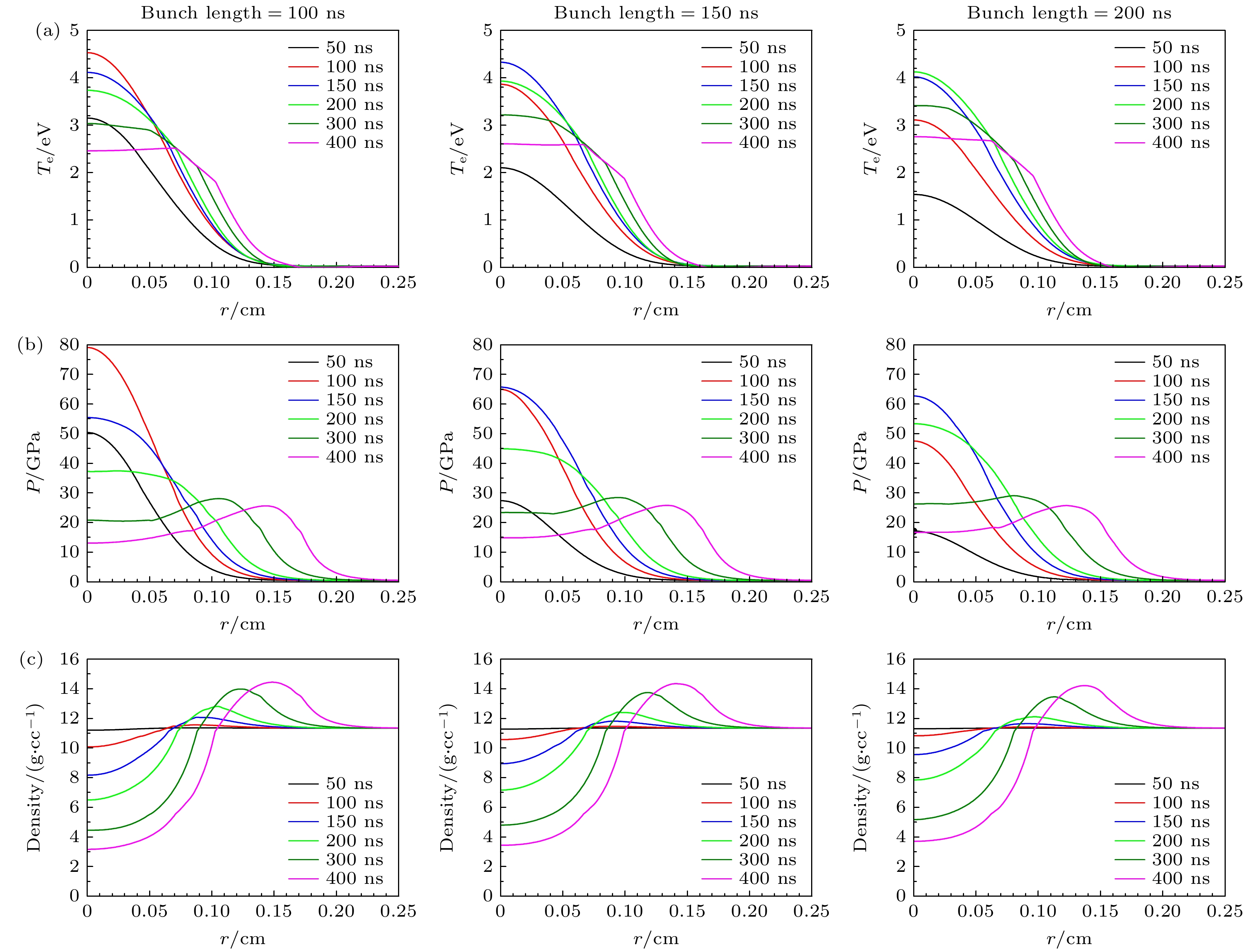 The unique properties of heavy-ion beam-driven high-energy density matter (HEDM), characterized by macroscale uniformity, extended volumetric dimension, and material diversity, present novel opportunities for advancing high-energy density physics (HEDP). The High-Intensity Heavy-Ion Accelerator Facility (HIAF), a cornerstone project which is initiated during China’s 12th Five-Year Plan, is currently being accelerated in construction. After completion, it will become a primary platform for experimental research on the HEDP phenomenon induced by intense heavy-ion beams. In this work, a self-developed 1D radiation hydrodynamics code, Aardvark, is used to simulate the interaction dynamics between uranium ion beams and cylindrical targets under HIAF-relevant beam parameters. The results show time-evolution images of specific energy deposition, temperature, pressure, and density of the target material in the radial direction during heavy-ion beam energy loading. By comparing the state of matter produced by the ion beam hitting the target at different beam energy and intensity, a interesting phenomenon is observed, i.e. a plateau region of temperature and pressure are formed near the axis center. This result indicates that under the action of the heavy-ion beam, a substantially homogeneous region is formed in the axis center the target material, further elucidating the salient characteristics of the heavy-ion beam-driven high energy density material, i.e. homogeneous state. The state parameters of the target matter undergo significant changes in the process, for a beam duration of 150 ns and a beam intensity of 4 × 1011 ppp (particle per pulse) and beam energy of 500 MeV/u. A sharp discontinuity in pressure and density occurs, forming a phenomenon known as a shock wave. Thereby, systematic modulation of heavy ion beam parameters enables investigation into the generation and propagation dynamics of shock waves. This study further constructs a systematic database that meticulously records the state parameters of target materials when uranium ion beams interact with various types of targets. The relevant simulation data provide important theoretical guidance for planning heavy-ion beam-driven high-energy density physics experiments at HIAF and crucial theoretical support for in-depth research on the generation, evolution, and properties of high-energy density matter. These advances in calculation position HIAF as a transformative platform for detecting extreme-state substances, with is of direct implications in studying inertial confinement fusion and modeling astrophysical plasma. -