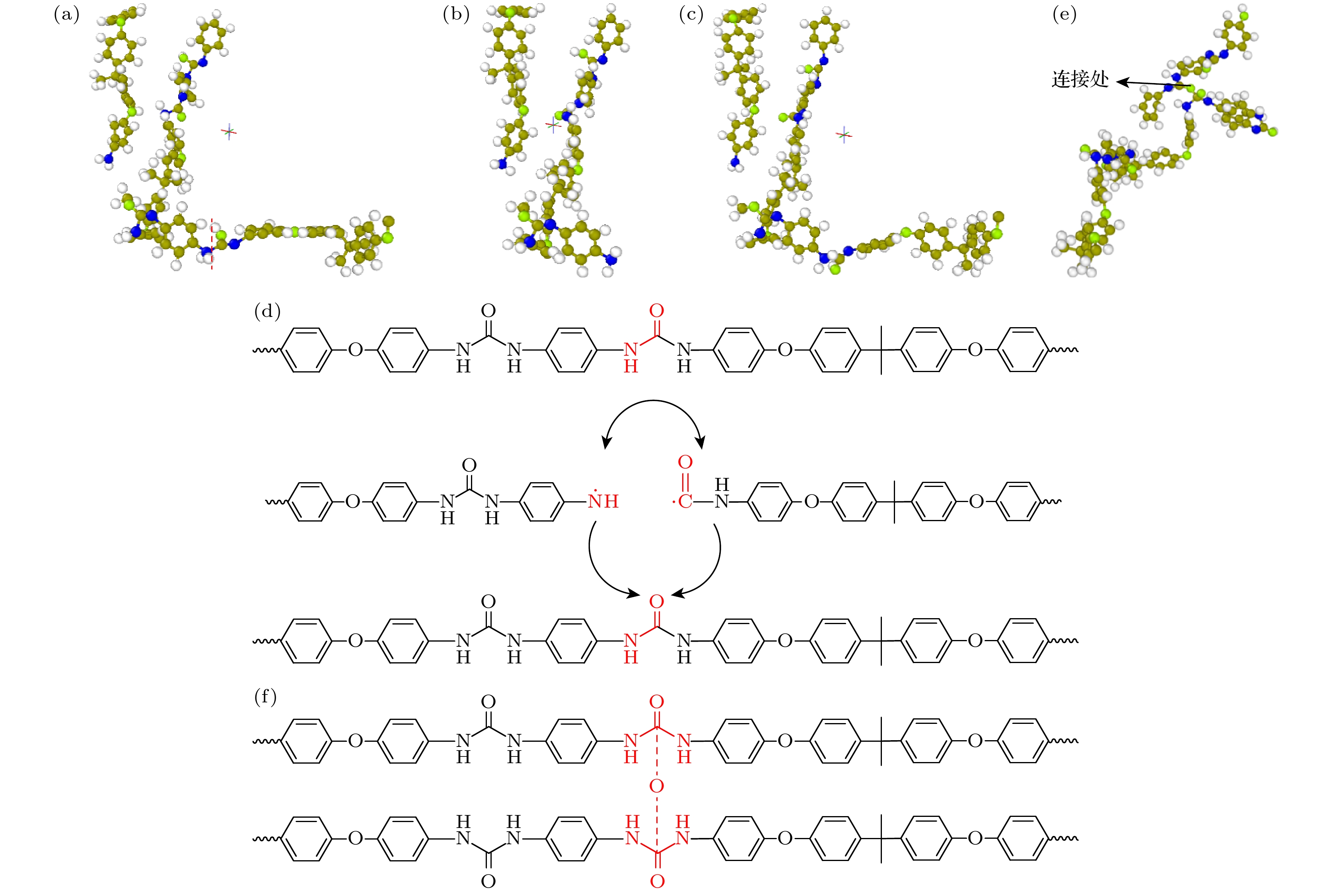 采用热氧老化方式模拟聚脲(polyurea, PU)薄膜在高温工况下的老化行为, 根据PU薄膜介电储能特性的变化规律将其老化过程划分为3个阶段. 结果表明: 老化初期, 氧气的桥接作用促使分子链规整排列, 相邻脲基团之间的氢键作用稍有增强, 分子链间距减小, 介电常数减小, 而击穿场强变化较小; 老化中期, 醚键断裂并诱导形成联苯结构, 体系无定形程度加剧, 介电常数增大, 但联苯结构加深了陷阱深度, 导致载流子迁移率降低, 这提高了薄膜的击穿场强; 老化后期, 氧气促使脲基分解, 造成贡献深陷阱能级的基团数量减少, 同时主链发生裂解, 并释放CO2与H2O等小分子物质, 这些因素共同导致了PU的击穿场强显著降低. 热氧老化过程中PU的储能密度表现出与击穿场强相同的时间依赖性, 证明了计及陷阱演变的PU储能性能退化机理: 氧气对醚键和脲基的分解作用分别诱发了联苯结构的形成和主链的裂解, 这改变了陷阱深度, 其中陷阱深度越浅, PU性能退化越显著.Dielectric capacitors are essential energy storage devices with high power density. The dielectric films of capacitors will age at working temperatures, a leading their performance to degrade. Polyurea (PU) is a potential working dielectric for capacitors with high energy density and low dielectric loss. However, the aging characteristics and underlying mechanism of PU have not been discussed. Considering the operating temperature of commercial dielectric capacitors, the aging characteristics of PU are investigate by being exposed to 80 °C for different durations. Compared with dielectric constant, breakdown strength changes significantly with aging time which can be used as a characteristic parameter to evaluate the aging degree of PU. Combining experimental method and simulation method, the correlation between molecular structure, trap properties and breakdown strength during thermo-oxidative aging is studied and established. The results show that the thermal-oxidative aging of PU can be divided into three stages. In the early stage of aging, the bridging effect of oxygen promotes the order arrangement of molecular chains. In this stage, the molecular chain spacing decreases, but the H-bonding interaction between adjacent urea groups is enhanced slightly as shown in Fig. (a). As a result, the dielectric constant decreases, while the breakdown strength is almost unchanged. In the middle stage of aging, ether bonds break and inducing the formation of biphenyl structures and resulting in a disordered structure as illustrated in Fig. (b). The enhanced mobility effect increases the dielectric constant. Meanwhile, the biphenyl structures deepen the trap depth, resulting in the decrease of carrier mobility and the increase of the breakdown strength. In the late stage of aging, oxygen promotes the decomposition of urea groups, thereby reducing the number of urea groups that form deep traps. At the same time, the main chain undergoes breakage, releasing small molecules such as CO2 and H2O, which is shown in Fig. (c). These factors collectively lead to a significant reduction in the breakdown strength of PU. In addition, the variations of dielectric constant, breakdown strength and energy density in the three stages are summarized in Fig. (d).