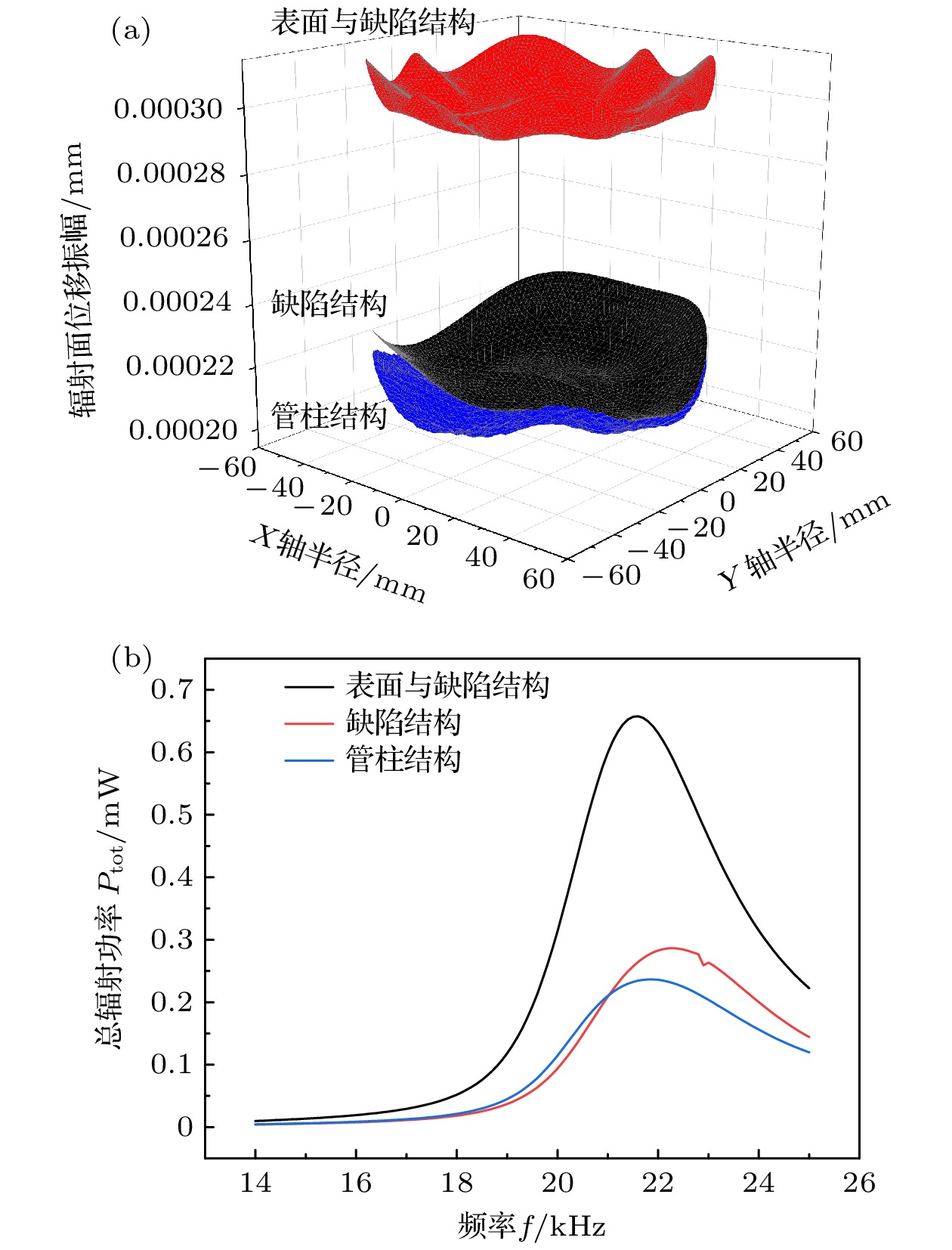 /mW缺陷结构 0.2180 × 10–3 87.73 0.04818 管柱结构 0.2109 × 10–3 90.56 0.04904 表面与缺陷结构 0.3015 × 10–3 93.56 0.1181 比值(表面与缺陷/缺陷) 1.384 1.066 2.450 比值(表面与缺陷/管柱) 1.430 1.033 2.407 A B C D 后盖板表面凹槽厚度w/mm 19015.485 1.544 –0.09065 0.004986 楔形体孔的宽度w1 /mm 19003.333 13.94 –0.4575 –0.02117 正常散射体空气圆柱孔半径r8/mm 21299.902 –36.52 0.000 –50.71 空气圆柱孔的高度h4/mm 20530.792 –202.5 8.669 –0.1261 环状体槽的内半径r7/mm 19015.083 2.116 11.49 3.530 A B C D 后盖板表面凹槽厚度w/ mm 0.0002939 6.991×10–6 0.000 0.000 楔形体孔的宽度w1/mm 3.048×10–4 –2.717×10–6 3.576×10–7 0.000 正常散射体空气圆柱孔半径r8/mm 6.102×10–4 –1.155×10–4 0.000 2.187×10–6 空气圆柱孔的高度h4/mm 3.063×10–4 –2.397×10–6 1.375×10–7 1.373×10–10 环状体槽的内半径r7/mm 3.005×10–4 –4.852×10–6 2.407×10–5 –6.396×10–6 A B C D 后盖板表面凹槽厚度w/mm 0.9355 –0.0004441 3.130×10–5 4.060×10–7 楔形体孔的宽度w1/mm 0.9798 –0.04139 0.003935 –0.0003165 正常散射体空气圆柱孔半径r8/mm –0.3622 0.4834 0.000 –0.009487 空气圆柱孔的高度h4/mm 0.5726 –0.004406 0.003738 –0.0001257 环状体槽的内半径r7/mm 0.9600 –0.1010 0.05795 –0.01953 -