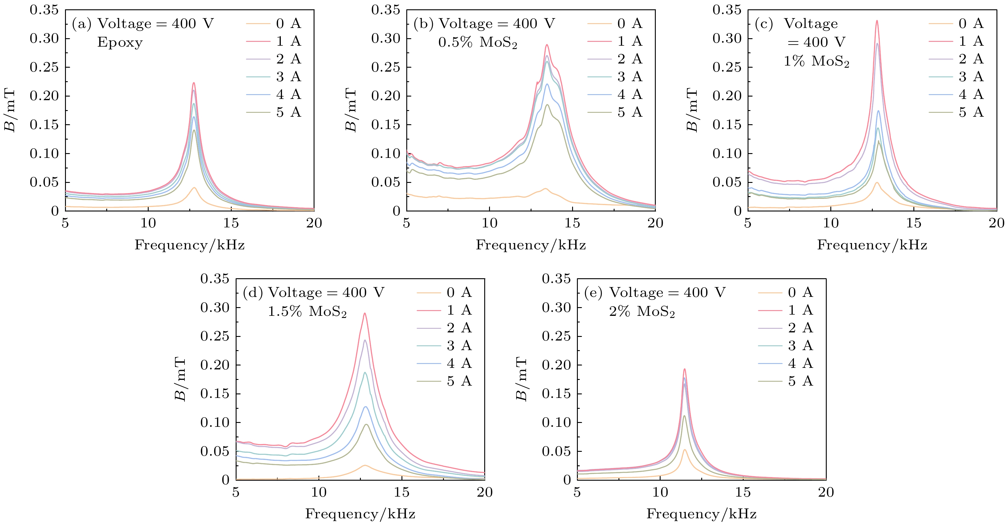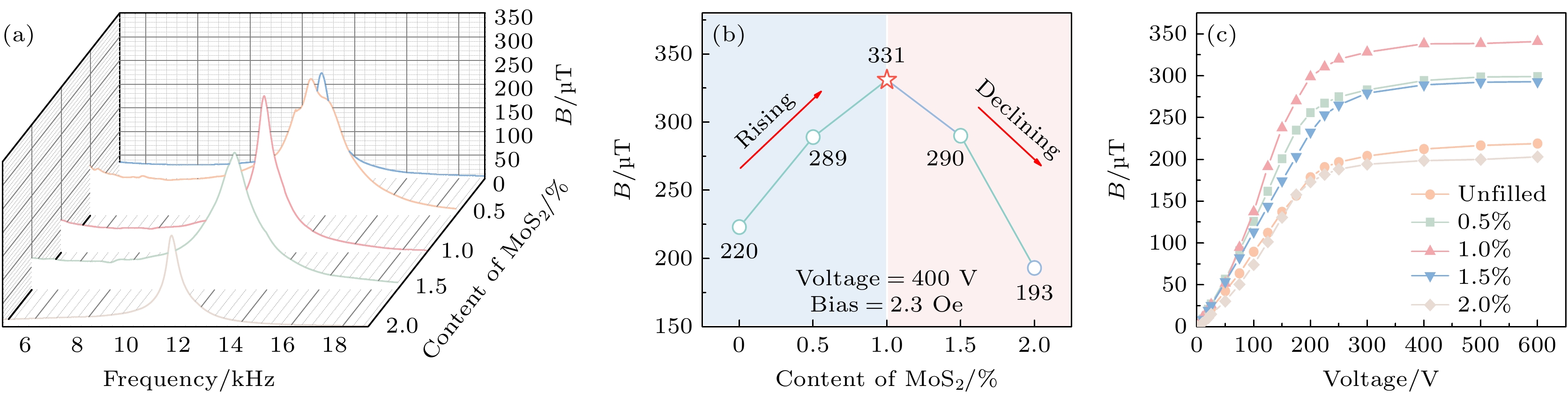 针对传统低频电天线存在的体积庞大与高功耗问题, 基于压电谐振原理的磁电天线展现出显著的优势. 然而, 磁电复合材料中的黏接层与压电相、铁磁相之间的声学阻抗失配现象, 严重阻碍了磁-机-电耦合过程中的应力传递效率, 进而限制了磁电复合材料的磁辐射强度. 为提升磁发射性能, 本文设计了一种高界面应力传递特性的磁电复合材料, 其具有类三明治的结构, 由Pb(Zr, Ti)O3压电纤维复合材料(macro fiber composite, MFC)压电层、均匀填充MoS2的环氧树脂黏接层, 以及FeBSi(Metglas)磁致伸缩层组成. 通过向黏接层引入二维填料MoS2, 有效改善了黏接层与铁电相、铁磁相之间的声阻抗匹配特性. 系统研究了MoS2填充量对PZT MFC/Metglas磁电复合材料磁发射强度的影响规律. 实验结果表明, 当MoS2填充质量分数为1%时, 该复合材料在最佳偏置磁场条件下的磁发射强度达到了331 μT, 相较于未填充MoS2的磁电复合材料提升了1.5倍; 在距离发射源1 m处, 磁发射强度可达2.7 nT. 结合声阻抗匹配理论, 深入探讨了电-机-磁耦合过程中的应力传递机制. 此外, 通过采用幅移键控调制技术, 验证了基于MoS2改性的PZT MFC/Metglas磁电复合材料在信号无损传输方面的有效性. 本研究提出的黏接层优化方法, 为通过增强应力传递效率提升磁电响应性能提供了一种简便高效的技术途径, 同时为低频水下通信、地下传感以及分布式无线网络等小型通信系统的发展提供了新的技术方案与理论支撑.