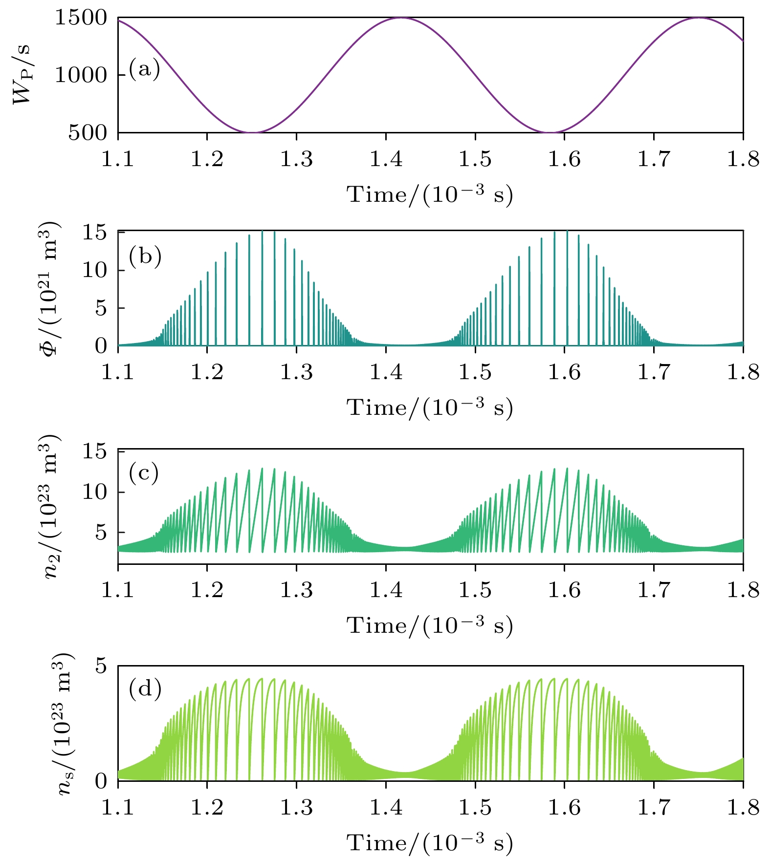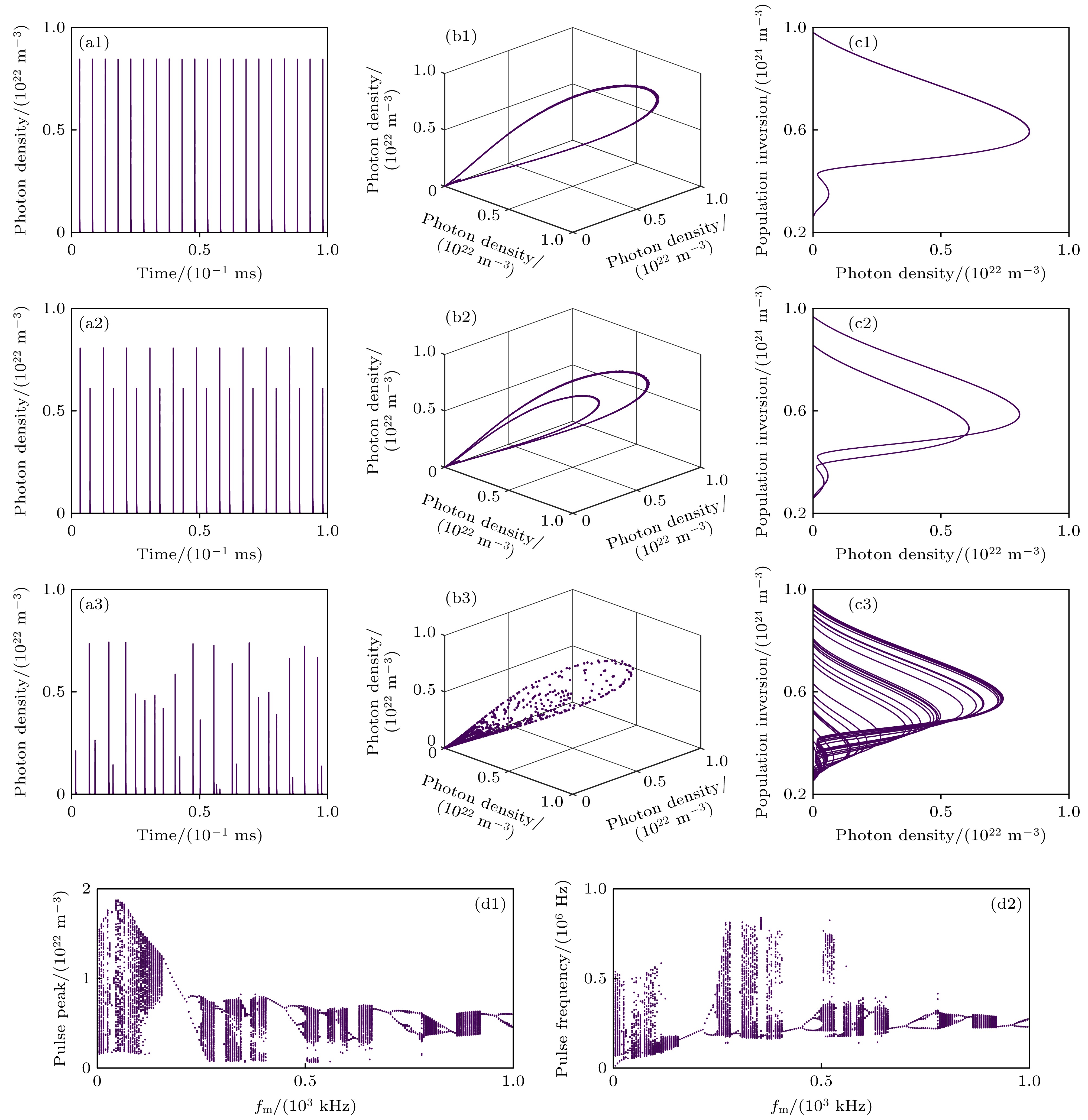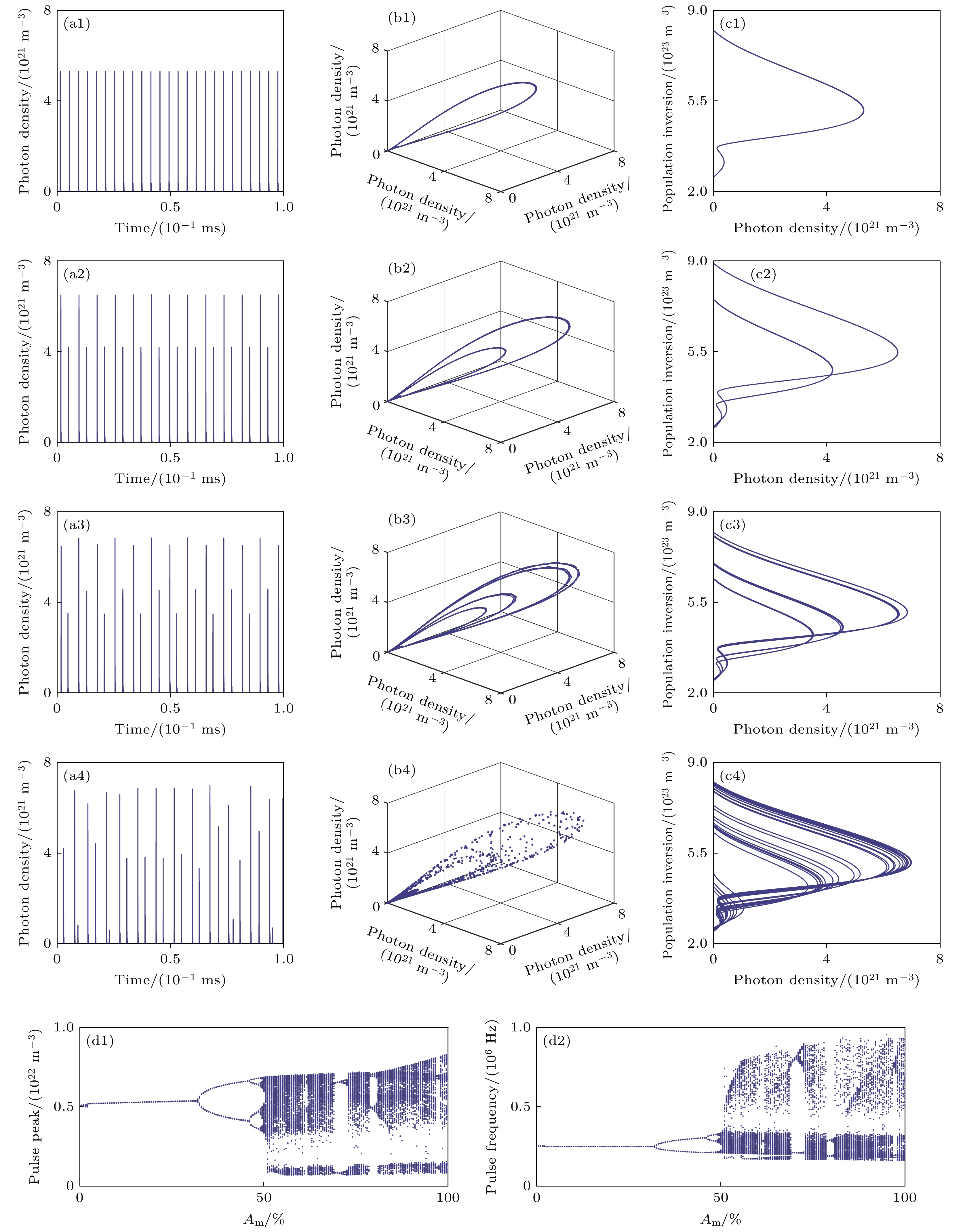 All-solid-state passively Q-switched lasers can exhibit nonlinear behaviors such as period-doubling, injection locking, and chaos under specific conditions, offering new applications in fields like secure communication and random number generation. As a result, the nonlinear dynamics of laser systems are becoming increasingly important. Pump modulation is a typical method of controlling the nonlinear dynamical states of solid-state lasers. In this work, the nonlinear dynamical characteristics of an all-solid-state passively Q-switched Nd:YAG/Cr:YAG laser under pump modulation are investigated by solving a four-level rate equation system using the Runge-Kutta method. The results demonstrate that by adjusting key parameters including modulation frequency, modulation amplitude, and unmodulated pump rate, the laser system can exhibit rich dynamical states, including period-one, period-two, multi-period, and chaotic pulsation. By analyzing the bifurcation diagram, the evolution pattern of output laser pulse characteristics with parameter changes is revealed. The system mainly enters chaos through period-doubling and quasi-periodic routes, while exhibiting a unique phenomenon where the pulse peak and pulse frequency follow synchronized evolutionary paths but with opposite trends in intensity variation, indicating dynamic coupling effects between frequency and intensity domains. By constructing the nonlinear dynamical distributions within a three-dimensional pump modulation parameter space, the combined effects of modulation frequency, modulation amplitude, and unmodulated pump rate on the evolution of the laser’s nonlinear dynamics are systematically investigated in this work. The results show that at lower unmodulated pump rates, the system cannot be driven into nonlinear states even when the modulation amplitude and frequency are relatively large. In contrast, under higher unmodulated pump rates, the appropriate tuning of modulation amplitude and frequency enables the system to transition from periodic states to chaotic behavior. This work not only elucidates the modulation mechanisms of pump parameters on the nonlinear dynamics of lasers, but also provides theoretical guidance for optimizing laser output performance and designing high-performance chaotic lasers, which is of great significance in promoting the applications of Q-switched lasers in precision measurement and secure communication fields.