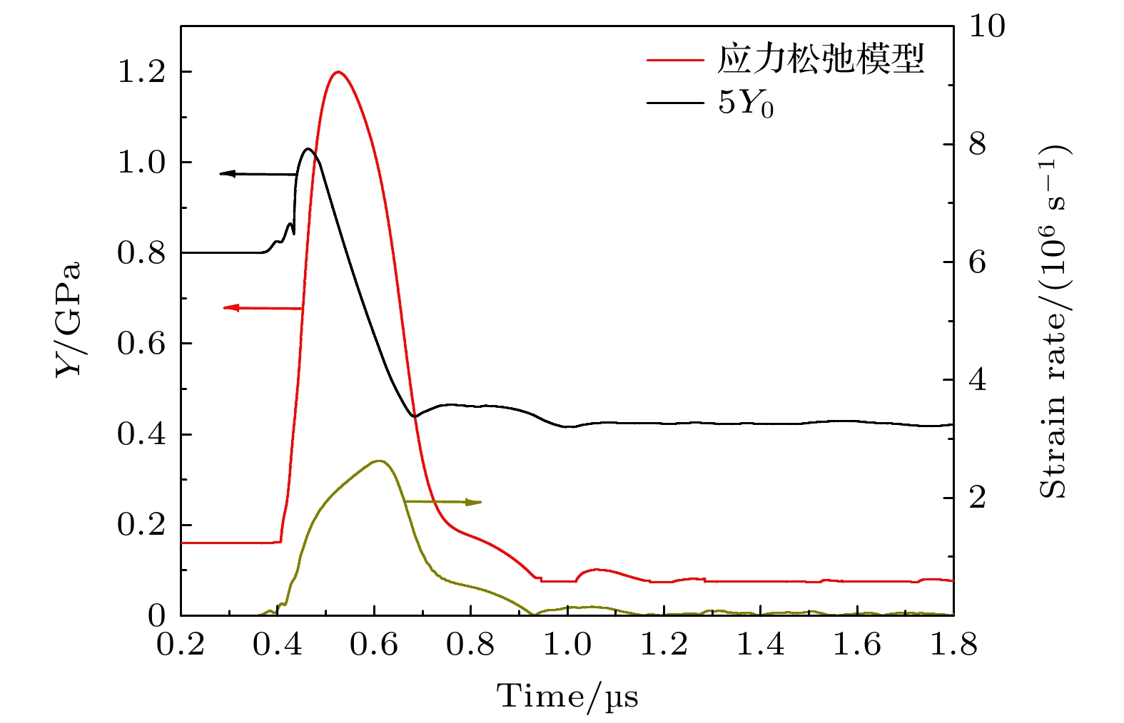 The strain rate effect on strength is a key issue in the study of dynamic constitutive models, and the Richtmyer-Meshkov instability experiment on the free surface of metal reflects the strength behavior under extremely high strain rates. After the shock wave propagates to the free surface and undergoes unloading, the metal enters a near-ambient pressure state and its strain rate exceeds 106 s–1. The initial sinusoidal perturbation exhibits the phase inversion trend of forming spike and bubble structure, while the development of the perturbation gradually stabilizes under the suppression effect of material strength. In the initial research, equivalent strength of metal under high strain rate is usually estimated by total spike growth for perturbation evolutions. Subsequent studies show that the maximum value of the spike velocity which can be directly measured can be the metric to determine equivalent strength. However, the influence of the non-uniformity of strength on the development of spike velocity has not been investigated. Tin is a critical material in the study of dynamic mechanical behavior under extreme conditions. Currently, the experiments of dynamic strength on tin usually combine various effects such as strain rate, pressure, and phase transitions. So far, no research has been found on the Richtmyer-Meshkov (RM) instability experiment, which is a method to separate high strain rate effect on tin free surface. The characteristics of tin dynamic strength behavior under extremely high strain rates are still unclear. This study conducts numerical simulations on the Richtmyer-Meshkov instability experiment of a tin sample with a pre-imposed sinusoidal perturbation with an amplitude 0.15 mm and a wavelength 0.8 mm under a shock pressure of 5.5 GPa. Using our developed two-dimensional explicit finite element program for elastoplastic hydrodynamics, the simulation results of three constitutive models, including elastic-perfectly plastic model, Steinberg-Cochran-Guinan model, and stress relaxation model, on the spike velocity curves are compared with the measurements. The equivalent strength of tin can be evaluated by obtaining a consistent maximum spike velocity of free surface perturbation between the calculation with elastic-perfectly plastic model and measurements. It is found that the strength increases by about 64 times at a strain rate of ~106 s–1 compared with that at a quasi-static strain rate of ~10–4 s–1, indicating that the strain rate hardening is extraordinarily significant. By adjusting model parameters, both the elastic-perfectly plastic model and Steinberg-Cochran-Guinan model can capture the maximum spike velocity but fail to reproduce the unloading process observed in experiment. Compared with the experimental results, the calculated spike velocity decreases too rapidly. In contrast, stress relaxation model due to considering strain rate effects achieves excellent agreement with the entire experimental spike velocity evolution, not only capturing the peak velocity but also solving the problem of overly rapid velocity decay. This demonstrates that the strain rate effect on material strength not only suppresses the maximum spike velocity but also affects the deceleration stage, revealing that the influence of strain rate effect persists throughout different stages of perturbation development. This study indicates that the experiment data available for dynamic constitutive model research extend from a single peak velocity value to the complete velocity evolution. The utilization efficiency of experimental data is greatly improved, providing important values for studying the dynamic constitutive models under extremely high strain rates.
