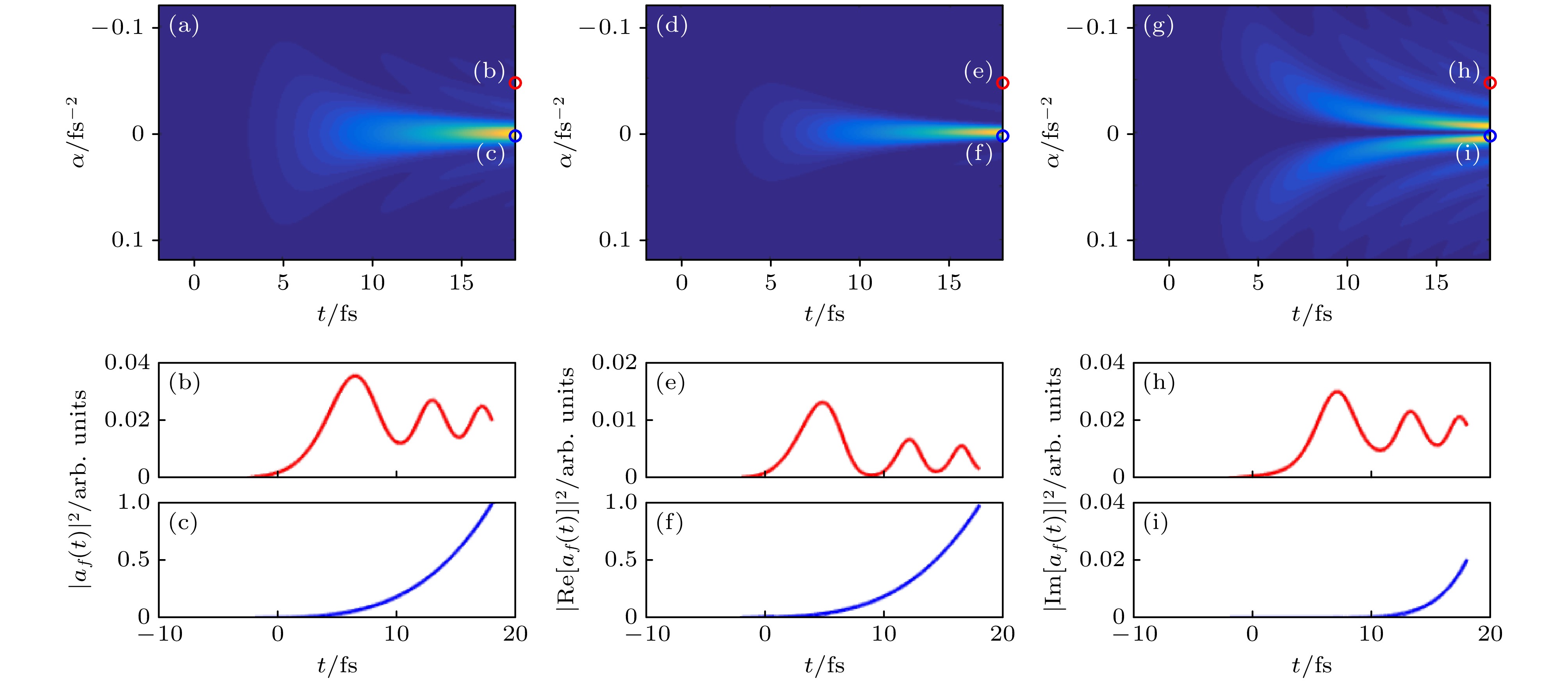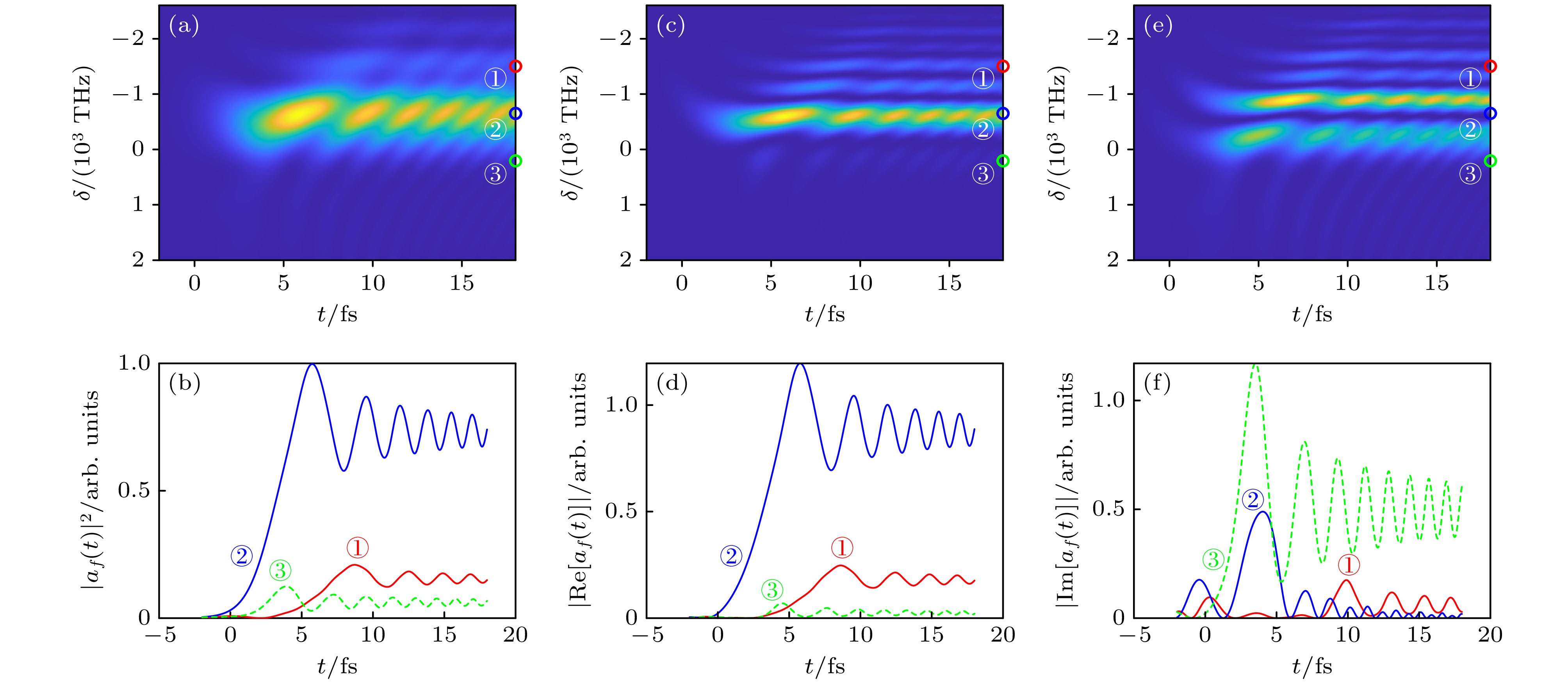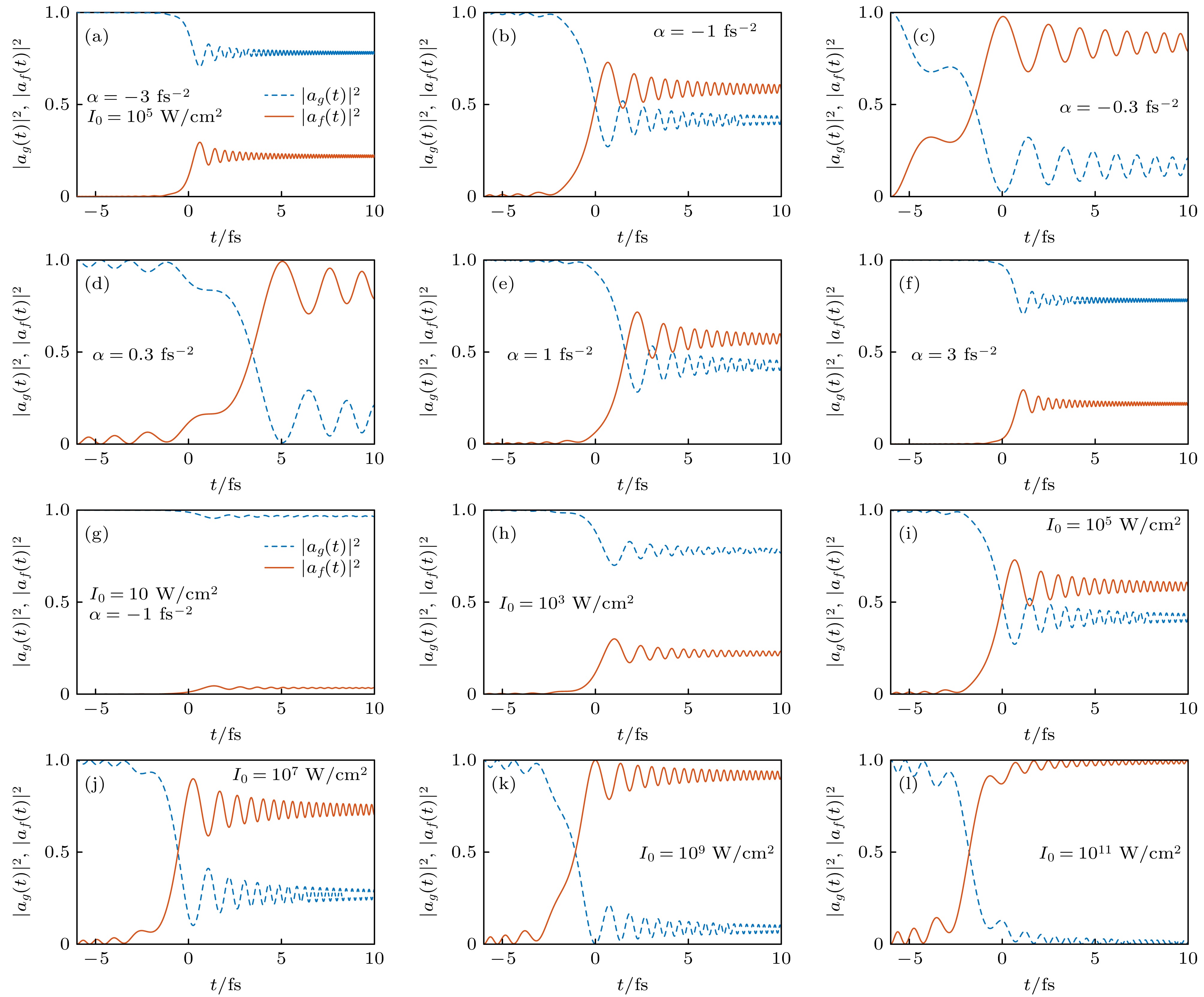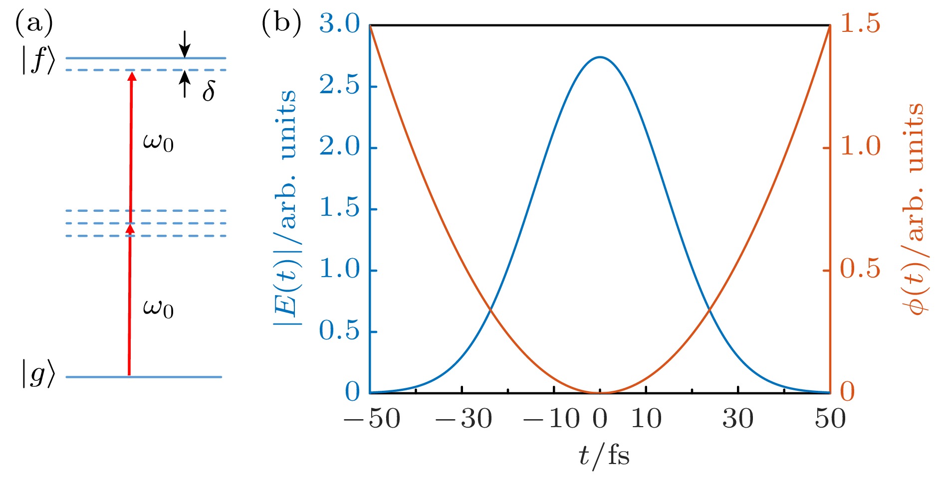 在强场激发的一般情况下, 斯塔克效应对于瞬态双光子跃迁具有重要影响, 且该过程的解析描述具有很大挑战. 本文采用解析求解与数值模拟相结合的方法, 系统研究了弱场和强场啁啾脉冲激发的瞬态双光子跃迁过程, 揭示了光场强度、啁啾因子、失谐量等参数对双光子跃迁概率时域演化的重要影响. 首先, 本文利用二阶微扰理论得到了双光子时域跃迁概率振幅的近似解析解表达式. 该解析解表明, 弱场激发的瞬态双光子跃迁过程类似于菲涅耳直边衍射效应. 随着光场强度的增强, 斯塔克效应对双光子跃迁的影响随之增强. 其次, 本文通过一系列近似处理得到了强场作用下薛定谔方程的近似解析解. 此解析解表明, 强场斯塔克效应引起能级分裂使得双光子跃迁概率时域的对称性遭到了破坏, 其频域过程类似于“双缝干涉”效应. 研究结果表明, 强场激发时布居转移效率与光场强度具有重要关系, 而啁啾因子不仅可以调节布居转移效率和时间位置, 还可以改变布居概率在时域的振荡频率. 这对于强场激发的布居概率时域演化描述提供了新思路, 并对双光子显微成像研究提供了科学依据.In general cases of strong field excitation, the Stark effect has a significant influence on transient two-photon transitions, and the analytic description of this process is quite challenging. By combining analytical solutions and numerical simulations, the transient two-photon transition processes excited by weak and strong chirped pulses are systematically investigated, showing the important influences of parameters such as light field intensity, chirp factor, and detuning on the time-domain evolution of two-photon transition probabilities. Firstly, an approximate analytical expression is derived for the amplitude of the time-domain two-photon transition probability by using the second-order perturbation theory. This analytical solution indicates that the transient two-photon transition process under weak field excitation is similar to the Fresnel rectangular edge diffraction effect. As the light field intensity increases, the influence of the Stark effect on two-photon transitions also intensifies. Secondly, through a series of approximations, the approximate analytical solutions of the Schrödinger equation under strong field interactions are obtained. The analytical solutions show that the strong field Stark effect induces energy level to split, which disrupts the symmetry of the time-domain two-photon transition probability distribution, and its frequency domain process is similar to the “double-slit interference” effect. The research results indicate that the efficiency of population transfer during strong field excitation is closely related to the light field intensity, while the chirp factor can not only regulate the efficiency and time position of population transfer but also change the oscillation frequency of the population probability in the time domain. This work offers new insights into describing the time-domain evolution of the population probability under strong field excitation and lays a scientific basis for research on two-photon microscopy imaging.