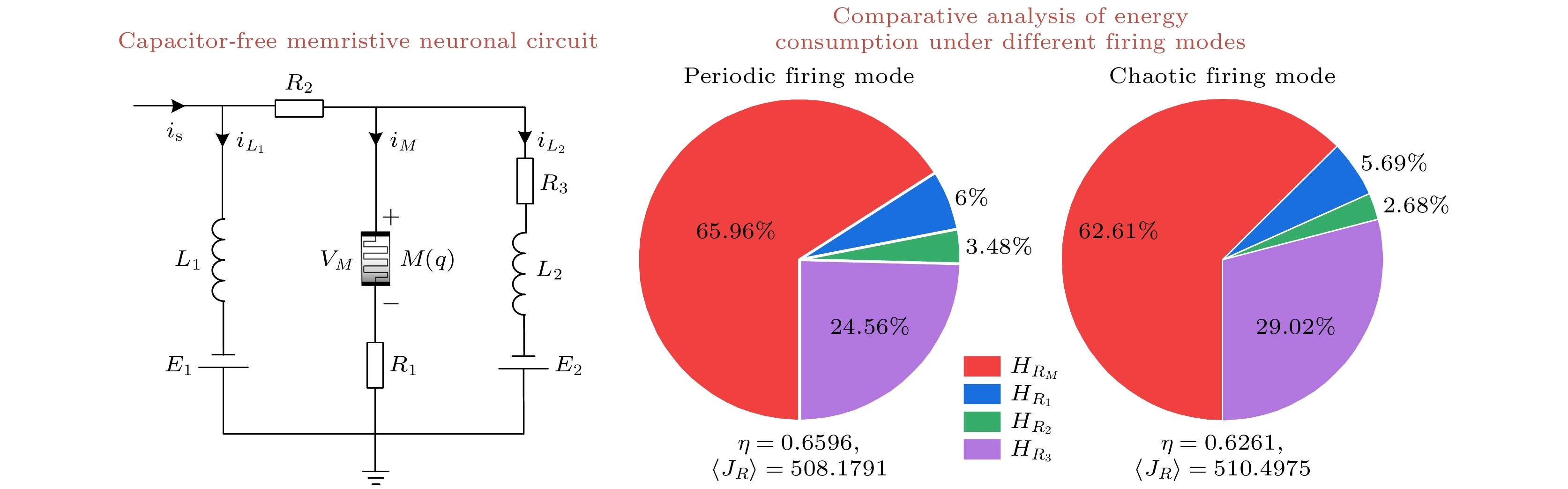 To address the issues of high dynamic power consumption and substantial occupation of silicon integration resources in traditional capacitor-containing neuronal circuits, this study proposes a capacitor-free neuronal circuit based on a charge-controlled memristor. By taking the intrinsic parameters of the charge-controlled memristor as the reference for scaling transformation, dimensionless dynamical equations are derived. The local asymptotic stability of the system is verified using Jacobian matrix eigenvalue decomposition and the Routh-Hurwitz criterion. Gaussian white noise is introduced to simulate the interference for detecting coherent resonance, while energy characteristics are analyzed by combining Hamiltonian energy formulas and resistance energy consumption expressions. Additionally, the fourth-order Runge-Kutta method is adopted to conduct numerical simulations.The research results indicate that external stimulus, ionic channel conductance, and reversal potential can flexibly regulate the periodic/chaotic firing modes of the neuron. In the periodic state, the proportion of electric field energy of the charge-controlled memristor in the total energy is higher; in the chaotic state, however, the proportion of magnetic field energy of the inductive coils increases. The circuit exhibits coherent resonance under the influence of noise, and resistor is the main energy-consuming component. The conclusion proves that the circuit is feasible in principle, with rich dynamical characteristics and good noise robustness. Adjusting the resistance value can enhance energy efficiency while preserving multiple firing modes, thereby providing theoretical support and optimization direction for designing high-integration, low-power neuromorphic computing circuits.