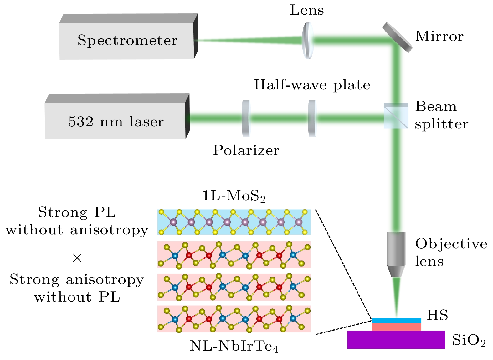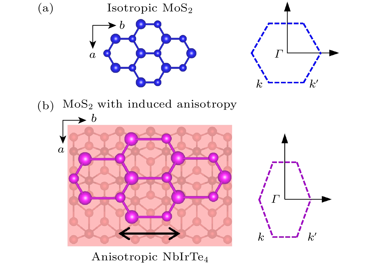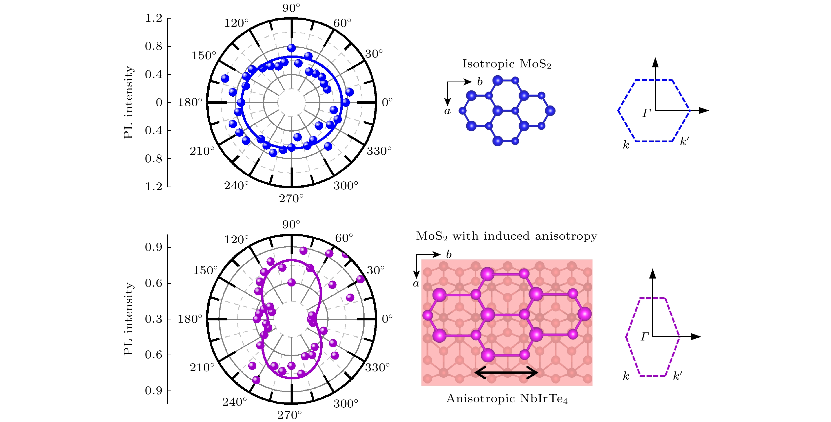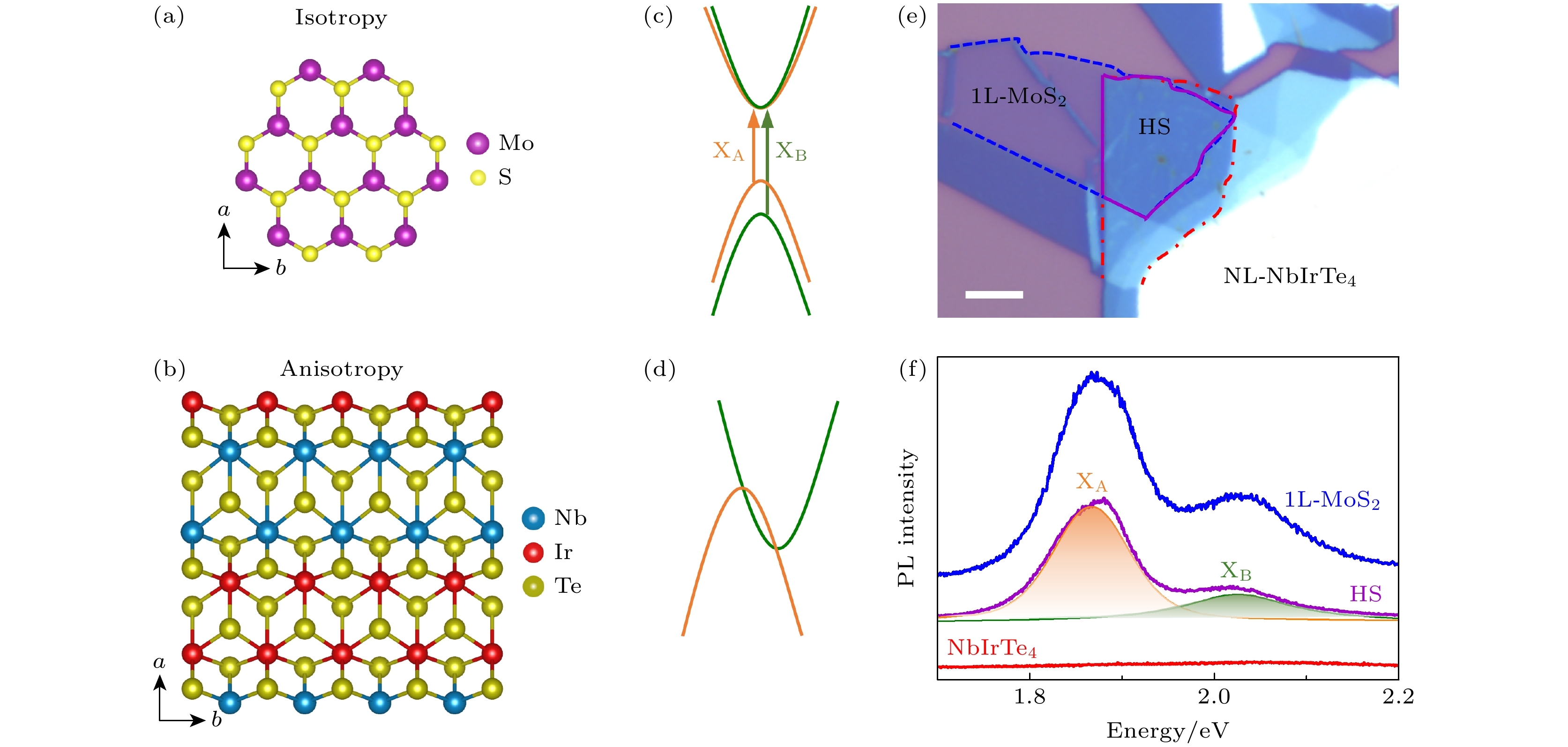 二维材料的发光特性与各向异性构成了微纳偏振发光器件实现与性能优化的物理基础. 然而, 并非所有天然二维材料体系同时具备强本征发光与强各向异性, 这在很大程度上限制了其在偏振可控发光器件中的应用潜力. 针对这一问题, 本研究基于范德瓦耳斯工程策略, 构建了由单层MoS2与低对称性NbIrTe4组成的异质结, 从而实现了高效发光特性与强各向异性响应的协同耦合. 角分辨偏振光致发光测试结果表明, NbIrTe4中固有的各向异性势场能够有效地改变单层MoS2的面内晶格对称性, 诱导其光致发光过程呈现明显的偏振依赖性, 并显著地提升激子的各向异性辐射强度. 本研究不仅揭示了范德瓦耳斯异质结中发光各向异性产生的微观物理机制, 还为新一代高性能偏振发光器件的结构设计与性能调控提供了可行的理论指导与实验依据.Luminescence and anisotropy in two-dimensional (2D) materials have important implications for both fundamental material physics and potential applications such as polarized light-emitting devices. However, many natural-occuring 2D materials typically exhibit either luminescence or anisotropy, but not both. In this work, we utilize van der Waals (vdW) engineering to construct a heterostructure (HS) with anisotropic luminescent properties, which is composed of isotropic monolayer (1L) MoS2 (with strong intrinsic luminescence) and low-symmetry NbIrTe4 (strong anisotropy without photoluminescence). Experimentally, we characterize the optical response of the HS by using angle-resolved PL spectroscopy. The results indicate that the intrinsic anisotropic potential field of NbIrTe4 at the interface effectively breaks the in-plane isotropic symmetry of MoS2, inducing a pronounced polarization-dependent emission of A and B excitons. The anisotropy ratio is enhanced to ~1.58, corresponding to a linear polarization degree of approximately 22%. This work provides new insights into 2D interfacial coupling and offers useful guidance for the design and engineering of next-generation high-performance, tunable polarized light-emitting devices.