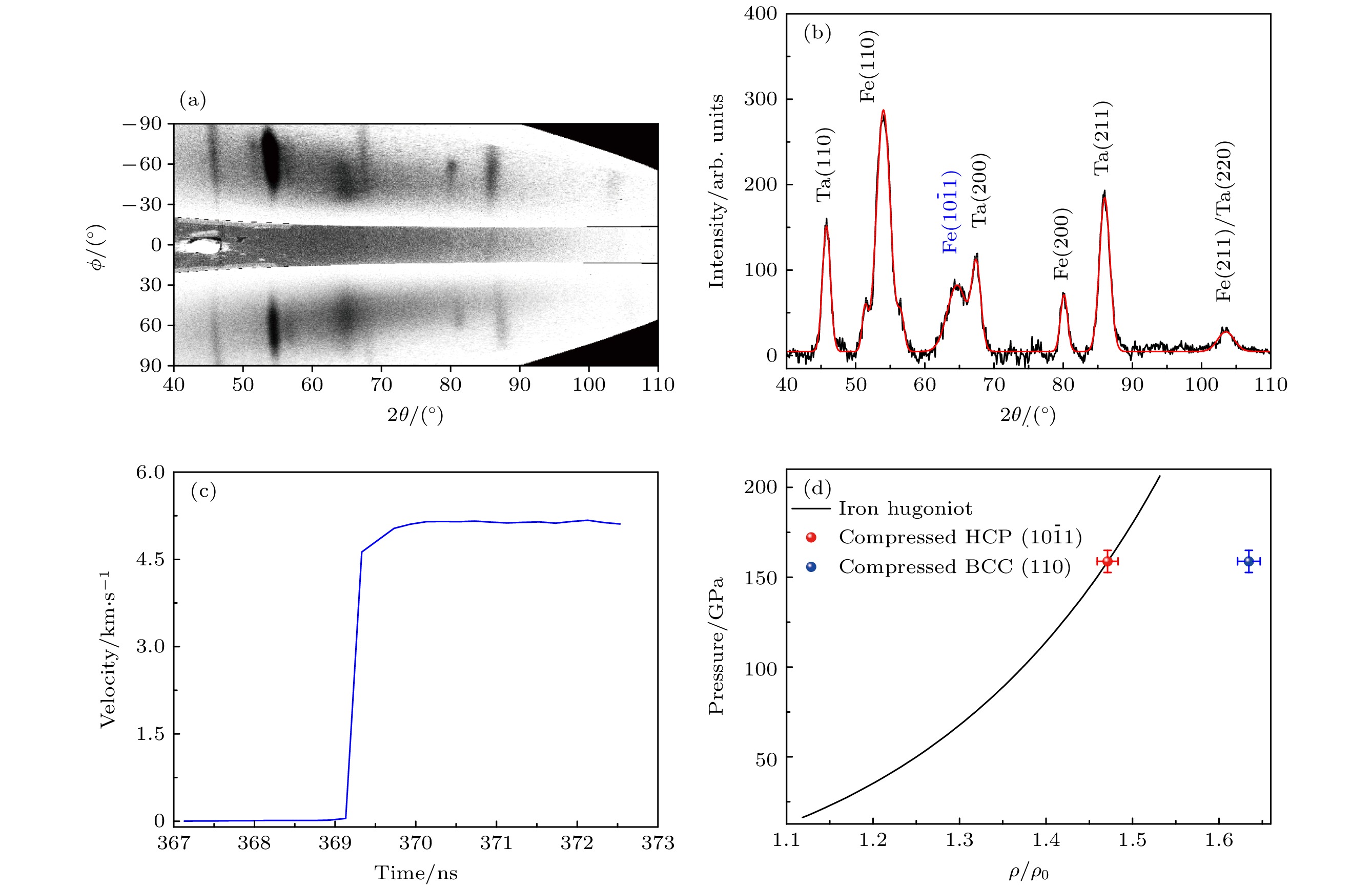 in situobservation of material phase transition under high-strain-rate shock loading is carried out with typical metals of vanadium and iron. Diffraction results are consistent with vanadium remaining in the body-centered-cubic structure up to 69 GPa, while iron transforms from the body-centered-cubic structure into hexagonal-close-packed structure at 159 GPa. The compressive properties of vanadium and iron obtained in