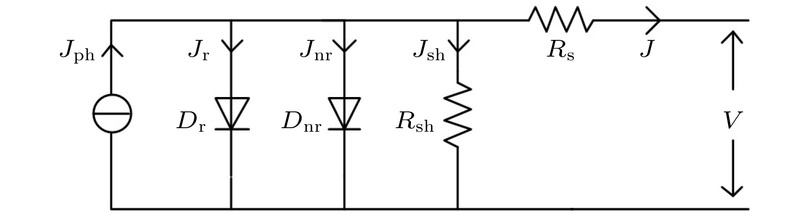 理解并量化影响钙钛矿太阳电池效率的因素, 对研发高性能器件尤为重要. 目前, 太阳电池普遍认可的三大损失为光学损失、欧姆损失和非辐射复合损失. 其中, 非辐射复合包括体复合和表面复合, 已被证明是制约电池效率提升的决定性因素. 本文提出了一种分析电池伏安特性曲线的等效电路模型, 能对上述损失机制进行全面描述, 并通过与漂移-扩散模型及实验结果的对比, 证实了电路模型的可靠性, 拟合误差在2%以内. 根据该模型, 可以准确判断电池内的主导复合机制, 并可从实际电池伏安曲线中提取不同效率损失对应的物理参数, 绘制电压扫描过程中各机制随电压的演化曲线, 从而理解效率损失的物理机理. 该模型从电路角度分析了不同损失机制对电池工作特性的影响, 有助于定位提高效率的关键点, 是一个较全面的钙钛矿太阳电池仿真分析工具.Perovskite solar cells have been attracting more and more attentions due to their extraordinary performances in the photovoltaic field. In view of the highest certified power conversion efficiency of 25.5% that is much lower than the corresponding Shockley-Queisser limit, understanding and quantifying the main loss factors affecting the power conversion efficiency of perovskite solar cells are urgently needed. At present, the three loss mechanisms generally recognized are optical loss, ohmic loss, and non-radiative recombination loss. Including the trap-assisted bulk recombination and surface recombination, the non-radiative recombination is proved to be the dominant recombination mechanism prohibiting the increase of efficiency. In this work, based on semiconductor physics, the expressions of bulk and surface recombination currents are analytically derived. Then taking the optical loss, series and shunt resistance losses, and bulk and surface recombination losses into considerations, an equivalent circuit model is proposed to describe the current density-voltage characteristics of practical perovskite solar cells. Furthermore, by comparing to the drift-diffusion model, the pre-defined physical parameters of the drift-diffusion model well agree with the fitting parameters retrieved by the equivalent circuit model, which verifies the reliability of the proposed model. For example, the carrier lifetimes in the drift-diffusion model are consistent with the recombination factors in the equivalent circuit model. Moreover, when the circuit model is applied to analyze experimental results, the fitting outcomes show favorable consistency to the physical investigations offered by the experiments. And the relative fitting errors of the above cases are all less than 2%. Through employing the model, the dominant recombination type is clearly identified and split current density-voltage curves characterizing different loss mechanisms are offered, which intuitively reveals the physical principles of efficiency loss. Additionally, through calculating the efficiency loss ratios under the open-circuit voltage condition, quantifying the above-mentioned loss mechanisms becomes simple and compelling. The prediction capability of the model is expected to be enhanced if a series of light intensity dependent current density-voltage curves are fitted simultaneously. Consequently, this model offers a guideline to approach the efficiency limit from a circuit-level perspective. And the model is a comprehensive simulation and analysis tool for understanding the device physics of perovskite solar cells.