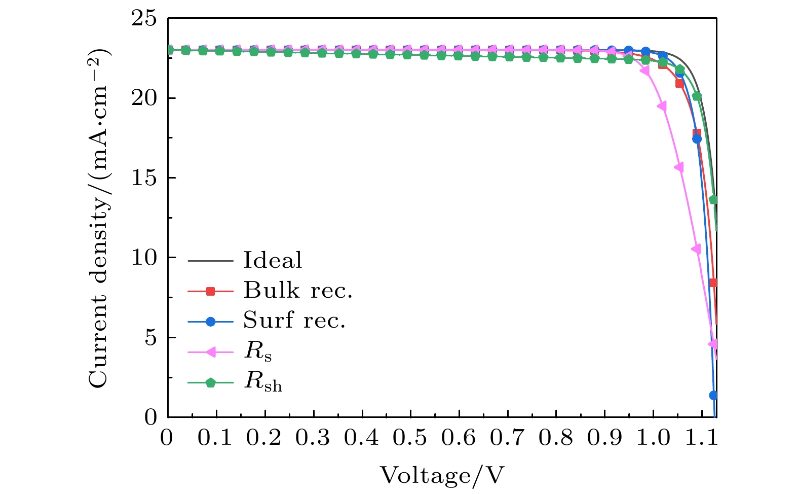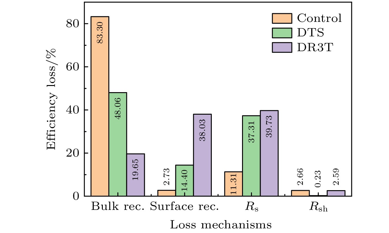 Cases $\gamma_ {\rm{bulk} }/{\rm s}^{-1}$ $\gamma_ {\rm{surf} }/{\rm s}^{-1}$ Rs/$\left({{\Omega} }\cdot {\rm{cm} }^2\right)$ $R_{{\rm{sh}}}$/$\left(\Omega \cdot {\rm{cm} }^2\right)$ $J_{{\rm{sc}}}/({\rm{mA}}\cdot {\rm{cm}}^{-2})$ $V_{{\rm{oc}}}$/V $FF$/% $PCE$/% Bulk $2.07\times10^6$ $3.48\times10^{5}$ $3.34\times10^{-3}$ $1.46\times10^{6}$ $24.28$ $1.13$ $82.33$ $22.58$ Surface $1.30\times10^7$ $1.95\times10^{9}$ $3.84\times10^{-1}$ $9.24\times10^{6}$ $24.30$ $0.96$ $84.32$ $19.74$ CTL $8.75\times10^4$ $0.86$ $7.03\times10^{-1}$ $7.00\times10^{3}$ $24.32$ $1.28$ $73.15$ $22.85$ 注1: Bulk代表仅考虑体复合, Surface代表仅考虑表面复合, CTL代表不考虑非辐射复合但改变传输层迁移率的情况. $\gamma_{{\rm{bulk}}}$代表体复合系数; $\gamma_{{\rm{surf}}}$代表表面复合系数; $R_{\rm{s}}$为串联电阻; $R_{{\rm{sh}}}$为并联电阻; $J_{{\rm{sc}}}$, $V_{{\rm{oc}}}$,FF和$PCE$分别代表经计算得到的短路电流、开路电压、填充因子和光电转换效率. Cases $\tau_{ {\rm{bulk} } }/{\rm s}$ ${\tau^{-1}_{ {\rm{bulk} } } }/{\rm s}^{-1}$ $\gamma_{ {\rm{bulk} } }/{\rm s}^{-1}$ $\tau_{ {\rm{surf} } }/{\rm s}$ ${\tau^{-1}_{ {\rm{surf} } } }/{\rm s}^{-1}$ $\gamma_{{\rm{surf}}}/{\rm s}^{-1}$ Bulk $1.00\times10^{-7}$ $1.00\times10^{7}$ $2.07\times10^{6}$ ${\rm{Inf}}$ ${\rm{Inf}}\ {\rm{small}}$ $3.48\times10^{5}$ Surface ${\rm{Inf}}$ ${\rm{Inf}}\ {\rm{small}}$ $1.30\times10^{7}$ $1.00\times10^{-9}$ $1.00\times10^9$ $1.95\times10^9$ CTL ${\rm{Inf}}$ ${\rm{ Inf}}\ {\rm{small}}$ $8.75\times10^{4}$ ${\rm{Inf}}$ ${\rm{Inf}}\ {\rm{small}}$ $0.86$ Cases $\gamma_{{\rm{bulk}}}/{\rm s}^{-1}$ $U_{{\rm{surf}}}/({\rm {nm}} \cdot{\rm {cm}}^{3} \cdot {\rm s}^{-1})$ ${R_{\rm{s}}}$/$\left(\Omega \cdot { {\rm{cm} } }^2\right)$ $R_{{\rm{sh}}}$/$\left(\Omega \cdot { {\rm{cm} } }^2\right)$ $J_{{\rm{sc}}}$/$\left({\rm{mA}} \cdot {\rm{cm}}^{-2}\right)$ $V_{{\rm{oc}}}$/${\rm{V}}$ $FF$/% $PCE$/% Control $7.43\times10^6$ $9.65\times10^{-7}$ $2.10$ $1.73\times10^{3}$ $21.29$ $1.06$ $76.03$ $17.24$ DTS $1.89\times10^6$ $8.61\times10^{-7}$ $3.71$ $1.83\times10^{3}$ $22.50$ $1.11$ $77.16$ $19.34$ DR3T $7.17\times10^5$ $1.96\times10^{-6}$ $4.20$ $1.63\times10^{3}$ $22.95$ $1.12$ $77.05$ $19.77$ -