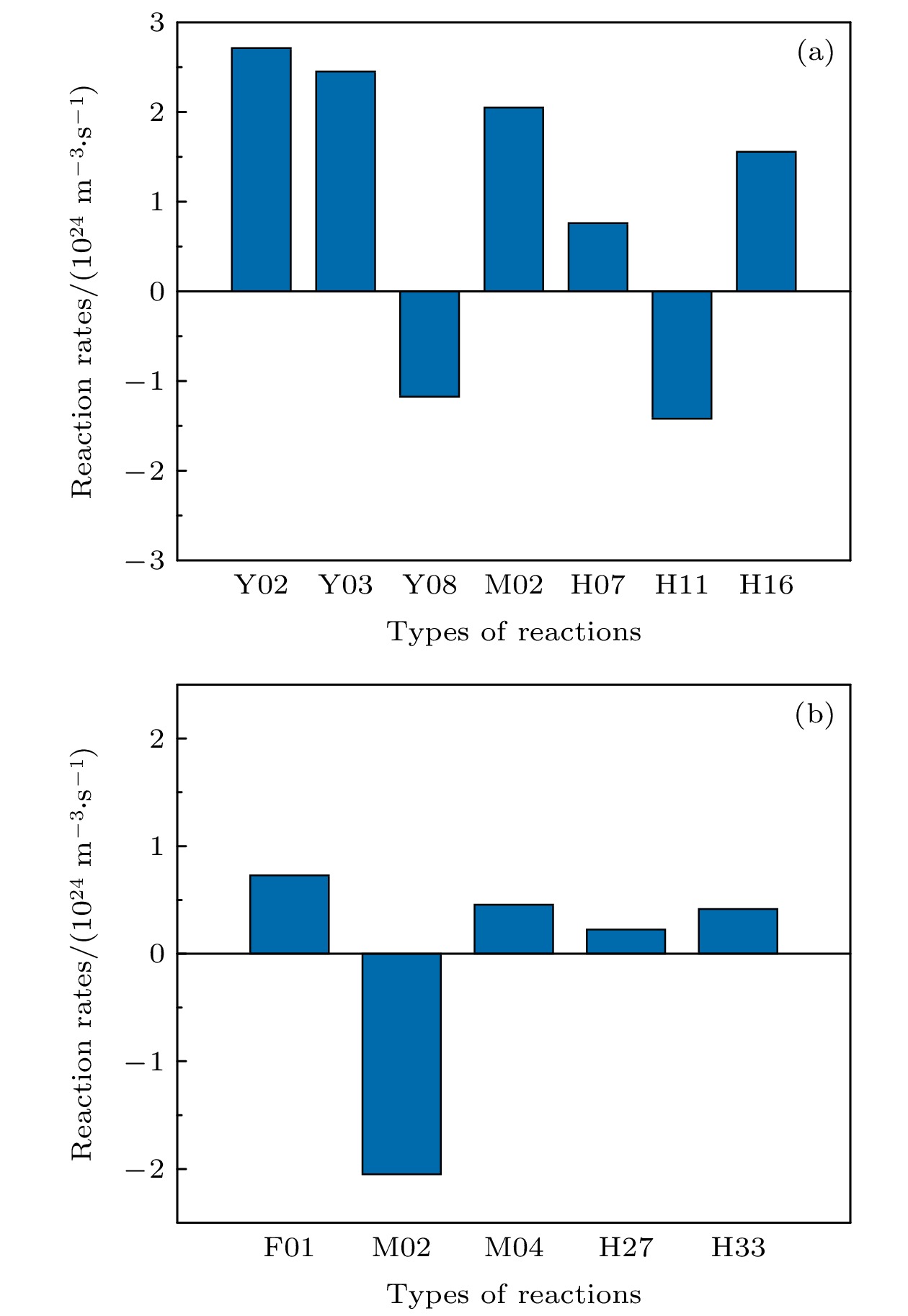 $ {\mathrm{O}}_{5}^{+} $, $ {\mathrm{C}}_{2}{\mathrm{O}}_{2}^{+} $, $ {\mathrm{C}}_{2}{\mathrm{O}}_{3}^{+} $, $ {\mathrm{C}}_{2}{\mathrm{O}}_{4}^{+} $负离子 $ {\mathrm{C}\mathrm{O}}_{4}^{-} $, $ {\mathrm{C}\mathrm{O}}_{3}^{-} $, O–, $ {\mathrm{O}}_{2}^{-} $, $ {\mathrm{O}}_{3}^{-} $, $ {\mathrm{O}}_{4}^{-} $ 序号 反应 文献 (X01) e + CO2$ \Rightarrow $ $ {\mathrm{C}\mathrm{O}}_{2}^{+} $ + 2e [50] (X02) e + CO2$ \Rightarrow $ CO + O + e [50] (X03) e + CO2$ \Rightarrow $ CO + O– [50] (X04) e + CO2$ \Rightarrow $ 2e + O + CO+ [50] (X05) e + CO2$ \Rightarrow $ 2e + CO + O+ [50] (X06) e + CO2$ \Rightarrow $ 2e + C++ O2 [50] (X07) e + CO2$ \Rightarrow $ $ {\mathrm{O}}_{2}^{+} $ + C + 2e [51,52] (X08) e + CO $ \Rightarrow $ C + O– [50] (X09) e + CO $ \Rightarrow $ e + C + O [50] (X10) e + CO $ \Rightarrow $ 2e + CO+ [50] (X11) e + CO $ \Rightarrow $ 2e + C + O+ [50] (X12) e + CO $ \Rightarrow $ 2e + C++ O [50] (X13) e + O3$ \Rightarrow $ $ {{\mathrm{O}}_{2}^{-}}^{-} $ + O [50] (X14) e + O3$ \Rightarrow $ O2+ O– [50] (X15) e + O3$ \Rightarrow $ O + O2+ e [53] (X16) e + O3$ \Rightarrow $ $ {\mathrm{O}}_{2}^{+} $ + O + 2e [53] (X17) e + O3$ \Rightarrow $ O++ O–+ O + e [53] (X18) e + O2$ \Rightarrow $ 2 O + e [50] (X19) e + O2$ \Rightarrow $ O + O– [50] (X20) e + O2$ \Rightarrow $ 2e + $ {\mathrm{O}}_{2}^{+} $ [50] (X21) e + O2$ \Rightarrow $ 2e + O + O+ [50] (X22) e + O2$ \Rightarrow $ e + O++ O– [50,54] (X23) e + O $ \Rightarrow $ 2e + O+ [50] (X24) e + C $ \Rightarrow $ 2e + C+ [50] 序号 反应 反应速率系数 文献 (I01) O–+ CO2$ \Rightarrow$ O + CO2+ e 4.0 × 10–18 [48] (I02) O–+ CO2+ CO $ \Rightarrow$ $ {\mathrm{C}\mathrm{O}}_{3}^{-} $ + CO 1.5 × 10–40 [61] (I03) O–+ CO2+ O2$ \Rightarrow$ $ {\mathrm{C}\mathrm{O}}_{3}^{-} $ + O2 3.1 × 10–40 [61] (I04) O–+ CO2+ CO2$ \Rightarrow$ $ {\mathrm{C}\mathrm{O}}_{3}^{-} $ + CO2 9.0 × 10–41 [52] (I05) $ {\mathrm{O}}_{2}^{-} $ + CO2+ O2$ \Rightarrow$ $ {\mathrm{C}\mathrm{O}}_{4}^{-} $ + O2 4.7 × 10–41 [52] (I06) $ {\mathrm{O}}_{3}^{-} $+ CO2$ \Rightarrow$ $ {\mathrm{C}\mathrm{O}}_{3}^{-} $ + O2 5.5 × 10–16 [18] (I07) $ {\mathrm{O}}_{4}^{-} $ + CO2$ \Rightarrow$ O2+ $ {\mathrm{C}\mathrm{O}}_{4}^{-} $ 4.8 × 10–16 [18] (I08) O++ CO2$ \Rightarrow$ $ {\mathrm{O}}_{2}^{+} $ + CO 9.4 × 10–16 [18] (I09) O++ CO2$ \Rightarrow$ O + $ {\mathrm{C}\mathrm{O}}_{2}^{+} $ 4.5 × 10–16 [18] (I10) C++ CO2$ \Rightarrow$ CO++ CO 1.1 × 10–15 [18] (I11) $ {\mathrm{O}}_{2}^{+} $ + CO2+M$ \Rightarrow$ $ {\mathrm{C}\mathrm{O}}_{4}^{+} $ +M 2.3 × 10–41 [18] (I12) $ {\mathrm{O}}_{5}^{+} $ + CO2$ \Rightarrow$ $ {\mathrm{C}\mathrm{O}}_{4}^{+} $ + O3 1.0 × 10–17 [52] (I13) CO++ CO2$ \Rightarrow$ $ {\mathrm{C}\mathrm{O}}_{2}^{+} $ + CO 1.0 × 10–15 [56] (I14) $ {\mathrm{C}\mathrm{O}}_{2}^{+} $ + CO2+M$ \Rightarrow$ $ {\mathrm{C}}_{2}{\mathrm{O}}_{4}^{+} $ +M 3.0 × 10–40 [18] (I15) O++ CO $ \Rightarrow$ O + CO+ 4.9 × 10–18(Tg/298)0.5exp(–4580/Tg) [18] (I16) C++ CO $ \Rightarrow$ CO++ C 5.0 × 10–19 [18] (I17) $ {\mathrm{C}}_{2}{\mathrm{O}}_{3}^{+} $ + CO $ \Rightarrow$ CO2+ $ {\mathrm{C}}_{2}{\mathrm{O}}_{2}^{+} $ 1.1 × 10–15 [18] (I18) $ {\mathrm{C}}_{2}{\mathrm{O}}_{4}^{+} $ + CO $ \Rightarrow$ CO2+ $ {\mathrm{C}}_{2}{\mathrm{O}}_{3}^{+} $ 9.0 × 10–16 [18] (I19) $ {\mathrm{C}}_{2}{\mathrm{O}}_{3}^{+} $ + CO +M$ \Rightarrow$ CO2+ $ {\mathrm{C}}_{2}{\mathrm{O}}_{2}^{+} $ +M 2.6 × 10–38 [18] (I20) $ {\mathrm{C}}_{2}{\mathrm{O}}_{4}^{+} $ + CO +M$ \Rightarrow$ CO2+ $ {\mathrm{C}}_{2}{\mathrm{O}}_{3}^{+} $ +M 4.2 × 10–38 [18] (I21) O–+ CO $ \Rightarrow$ CO2+ e 5.5 × 10–16 [44] (I22) $ {\mathrm{C}\mathrm{O}}_{3}^{-} $ + CO $ \Rightarrow$ 2CO2+ e 5.0 × 10–19 [58] (I23) $ {\mathrm{O}}_{2}^{+} $ + C $ \Rightarrow$ CO++ O 5.2 × 10–17 [18] (I24) $ {\mathrm{O}}_{2}^{+} $ + C $ \Rightarrow$ C++ O2 5.2 × 10–17 [18] (I25) CO++ C $ \Rightarrow$ CO + C+ 1.1 × 10–16 [18] (I26) O–+ C $ \Rightarrow$ CO + e 5.0 × 10–16 [57] (I27) $ {\mathrm{C}\mathrm{O}}_{2}^{+} $ + O $ \Rightarrow$ $ {\mathrm{O}}_{2}^{+} $ + CO 1.638 × 10–16 [52] (I28) $ {\mathrm{C}\mathrm{O}}_{2}^{+} $ + O $ \Rightarrow$ CO2+ O+ 9.62 × 10–17 [18] (I29) CO++ O $ \Rightarrow$ CO + O+ 1.4 × 10–16 [18] (I30) $ {\mathrm{C}\mathrm{O}}_{4}^{-} $ + O $ \Rightarrow$ $ {\mathrm{C}\mathrm{O}}_{3}^{-} $ + O2 1.1 × 10–16 [18] (I31) $ {\mathrm{C}\mathrm{O}}_{4}^{-} $ + O $ \Rightarrow$ CO2+ O2+ O– 1.4 × 10–17 [18] (I32) $ {\mathrm{C}\mathrm{O}}_{4}^{-} $ + O $ \Rightarrow$ CO2+ $ {\mathrm{O}}_{3}^{-} $ 1.4 × 10–16 [18] (I33) $ {\mathrm{C}\mathrm{O}}_{3}^{-} $ + O $ \Rightarrow$ CO2+ $ {\mathrm{O}}_{2}^{-} $ 8.0 × 10–17 [58] (I34) $ {\mathrm{C}\mathrm{O}}_{2}^{+} $ + O2$ \Rightarrow$ $ {\mathrm{O}}_{2}^{+} $ + CO2 6.4 × 10–17 [52] (I35) CO++ O2$ \Rightarrow$ $ {\mathrm{O}}_{2}^{+} $ + CO 1.2 × 10–16 [18] (I36) C++ O2$ \Rightarrow$ CO + O+ 6.2 × 10–16 [18] (I37) C++ O2$ \Rightarrow$ CO++ O 3.8 × 10–16 [18] (I38) $ {\mathrm{C}}_{2}{\mathrm{O}}_{2}^{+} $ + O2$ \Rightarrow$ 2CO + $ {\mathrm{O}}_{2}^{+} $ 5.0 × 10–18 [18] (I39) $ {\mathrm{C}\mathrm{O}}_{4}^{-} $ + O3$ \Rightarrow$ CO2+ $ {\mathrm{O}}_{3}^{-} $ + O2 1.3 × 10–16 [18] (I40) $ {\mathrm{C}\mathrm{O}}_{4}^{+} $ + O3$ \Rightarrow$ $ {\mathrm{O}}_{5}^{+} $ + CO2 1.0 × 10–16 [52] (I41) $ {\mathrm{C}\mathrm{O}}_{2}^{+} $ + O–$ \Rightarrow$ O + CO2 1.0 × 10–13 [62] (I42) $ {\mathrm{C}\mathrm{O}}_{2}^{+} $ + $ {\mathrm{O}}_{2}^{-} $ $ \Rightarrow$ CO + O2+ O 6.0 × 10–13 [44] (I43) $ {\mathrm{C}\mathrm{O}}_{2}^{+} $ + $ {\mathrm{C}\mathrm{O}}_{3}^{-} $ $ \Rightarrow$ 2CO2+ O 5.0 × 10–13 [58] (I44) $ {\mathrm{C}\mathrm{O}}_{2}^{+} $ + $ {\mathrm{C}\mathrm{O}}_{4}^{-} $ $ \Rightarrow$ 2CO2+ O2 5.0 × 10–13 [18] (I45) CO++ $ {\mathrm{O}}_{2}^{-} $ $ \Rightarrow$ CO + O2 2.0 × 10–13 [55] (I46) C++ O–$ \Rightarrow$ C + O 5.0 × 10–14 [55] (I47) C++ $ {\mathrm{O}}_{2}^{-} $ $ \Rightarrow$ C + O2 5.0 × 10–14 [55] (I48) O–+ CO+$ 