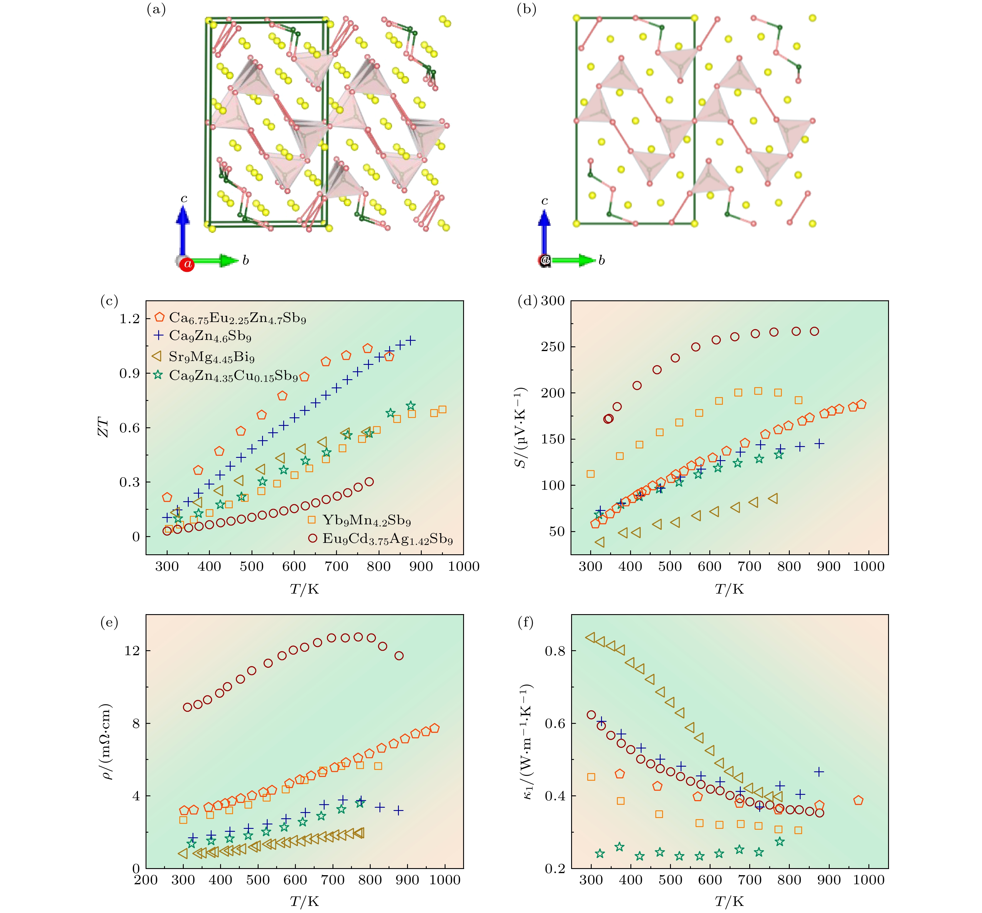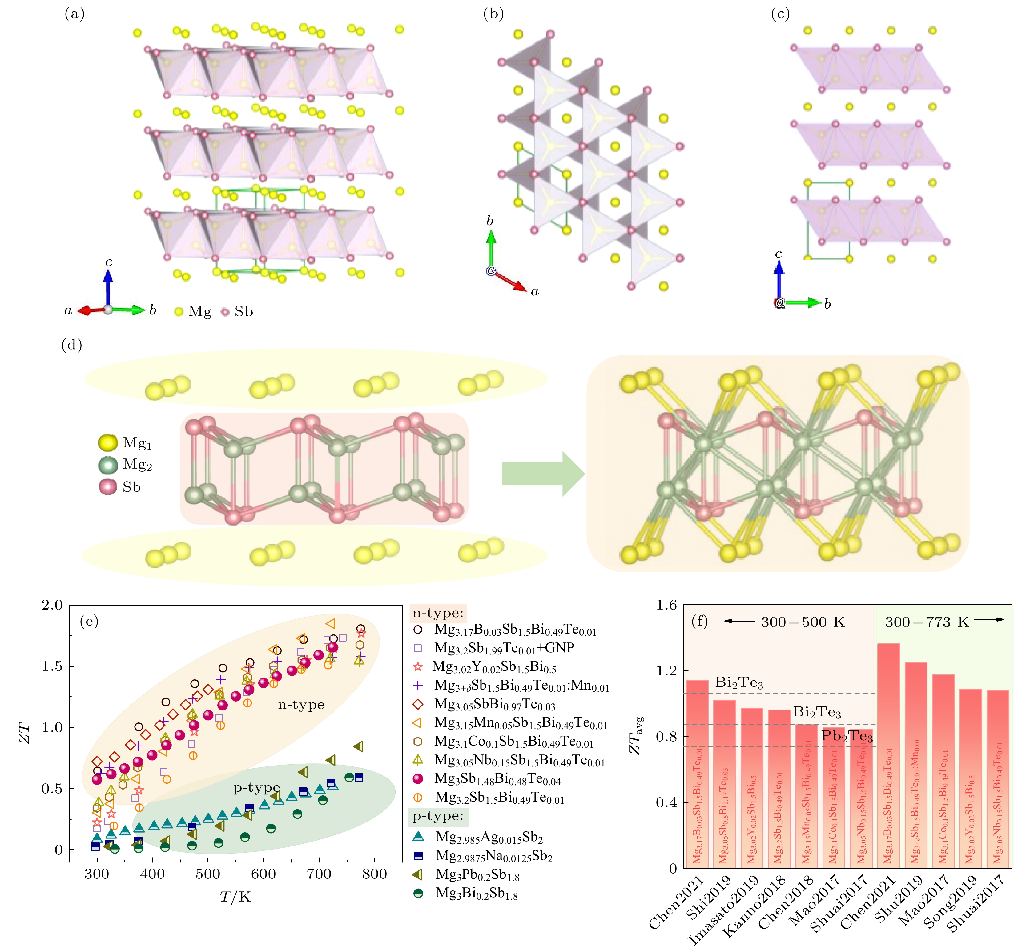 时间 材料 Ρ/(mΩ·cm) S/ (μV·K–1) κ/(W·m–1·K–1) ZT T/ K ZTRT 2005 Ca0.25Yb0.75Zn2Sb2[36] 3.7 170 1.4 0.56 773 0.08 2007 BaZn2Sb2[38] 6.1 185 1.25 0.33 673 0.05 2008 YbZn1.9Mn0.1Sb2[57] 1.5 150 1.6 0.65 726 0.05 2008 EuZn2Sb2[58] 1.8 180 1.45 0.9 713 0.16 2009 YbCd1.6Zn0.4Sb2[46] 1.66 180 1.1 1.2 650 0.2 2010 Yb0.6Ca0.4Cd2Sb2[37] 4.4 240 0.9 0.96 700 0.14 2010 Yb0.75Eu0.25Cd2Sb2[59] 4 240 1 0.97 650 0.18 2010 EuZn1.8Cd0.2Sb2[47] 2 200 1.4 1.06 650 0.18 2011 YbCd1.85Mn0.15Sb2[60] 5.7 245 0.6 1.14 650 0.17 2012 YbMg2Bi2[39] 5 180 1.8 0.44 650 0.07 2014 Yb0.99Zn2Sb2[61] 1.3 160 1.7 0.85 800 0.05 2016 YbCd1.9Mg0.1Sb2[40] 3.3 230 1.02 1.08 650 0.2 2016 Ca0.5Yb0.5Mg2Bi2[49] 2.8 187 1.08 1 873 0.1 2016 Ca0.995Na0.005Mg2Bi1.98[54] 3 200 1.25 0.9 873 0.05 2016 Eu0.2Yb0.2Ca0.6Mg2Bi2[8] 3.5 215 0.92 1.3 875 0.25 2018 YbCd1.5Zn0.5Sb2[34] 1.7 172 1.2 1.26 700 0.18 2018 Yb0.96Ba0.04Cd1.5Zn0.5Sb2[34] 2 185 0.94 1.3 700 0.18 2019 Ba0.7975Yb0.2Na0.0025Cd2Sb2[41] 4.1 210 0.81 0.93 700 0.1 2019 EuCd1.4Zn0.6Sb2[42] 3.5 220 1 0.96 700 0.18 2020 Ca0.65Yb0.35Mg1.9Zn0.1Bi1.98[43] 2.63 185 1.04 1 773 0.2 2020 YbMg2Bi1.58Sb0.4[44] 4.1 219 1 1.05 873 0.14 2020 Sm0.25Yb0.375Eu0.375Mg2Bi1.99[45] 3.7 197 0.9 0.9 773 0.18 2020 (Yb0.9Mg0.1)Mg0.8Zn1.198Ag0.002Sb2[21] 4.75 257 0.74 1.5 773 0.28 时间 材料 ρ/(mΩ·cm) S/(μV·K–1) κ/(W·m–1·K–1) ZT T/K ZTRT 2006 Mg3Sb2[83] 29 288 1.2 0.21 875 0.001 2013 Mg3Bi0.2Sb1.8[76] 40 400 0.58 0.6 750 0.01 2014 Mg3Pb0.2Sb1.8[48] 28.6 280 0.28 0.84 773 0.03 2015 Mg2.9875Na0.0125Sb2[66] 5.4 200 0.95 0.6 773 0.03 2017 Mg2.985Ag0.015Sb2[22] 9 205 0.65 0.51 725 0.08 2016 Mg3.2Sb1.5Bi0.49Te0.01[67] 5 –286 0.79 1.51 716 0.2 2016 Mg3Sb1.48Bi0.48Te0.04[53] 10 –205 0.73 1.6 750 0.6 2017 Mg3.05Nb0.15Sb1.5Bi0.49Te0.01[9] 4.35 –277 0.84 1.57 700 0.31 2017 Mg3.1Co0.1Sb1.5Bi0.49Te0.01[69] 5.1 –295 0.78 1.7 773 0.4 2018 Mg3.15Mn0.05Sb1.5Bi0.49Te0.01[10] 4.5 –302 0.79 1.85 723 0.42 2019 Mg3+δSb1.5Bi0.49Te0.01:Mn0.01[78] 4.5 –290 0.9 1.6 773 0.65 2019 Mg3.05SbBi0.97Te0.03[74] 1.7 –202 0.92 1.31 500 0.71 2019 Mg3.02Y0.02Sb1.5Bi0.5[11] 4.2 –270 0.76 1.8 773 0.2 2020 Mg3.2Sb1.99Te0.01+GNP[23] 6.4 –320 0.74 1.7 750 0.18 2021 Mg3.17B0.03Sb1.5Bi0.49Te0.01[12] 5.4 –296 0.69 1.81 773 0.62 时间 材料 ρ/(mΩ·cm) S/(μV·K–1) κ/(W·m–1·K–1) ZT T/K ZTRT 2014 Yb9Mn4.2Sb9[87] 7.9 185 0.58 0.7 950 0.035 2015 Eu9Cd3.75Ag1.42Sb9[91] 2.0 85 1.0 0.32 750 0.03 2016 Ca9Zn4.35Cu0.15Sb9[89] 3.0 140 0.8 0.72 873 0.1 2017 Ca9Zn4.6Sb9[27] 11.0 270 0.48 1.1 873 0.1 2019 Ca6.75Eu2.25Zn4.7Sb9[28] 5.55 200 0.53 1.05 773 0.21 2021 Sr9Mg4.45Bi9[90] 3.75 135 0.65 0.57 773 0.14 (323 K) 时间 材料 ρ/(mΩ·cm) S/(μV·K–1) κ/(W·m–1·K–1) ZT T/K ZTRT 2017 Yb2CdSb2[92] 5 155 0.52 0.2 523 0.23 2017 Yb1.64Eu0.36CdSb2[92] 3.5 170 0.6 0.7 523 0.26 2018 Eu2ZnSb2[25] 24.4 290 0.42 0.6 723 0.14 2018 Eu2Zn0.98Sb2[25] 8 220 0.48 1 823 0.22 2020 Eu2Zn0.97Ag0.06Sb2[24] 10 220 0.43 0.93 823 0.2 2020 Eu2Zn0.95Ag0.06Sb2[24] 5.3 194 0.5 1.1 823 0.2 时间 材料 ρ/(mΩ·cm) S/(μV·K–1) κ/(W·m-1·K–1) ZT T/K ZTRT 2018 Ca0.85La0.15Ag0.89Sb[106] 1.85 120 1.3 0.52 860 0.07 2018 Ca0.55Sr0.3La0.15Ag0.89Sb[106] 1.6 125 1.0 0.7 823 0.1 2020 SrAgSb[26] 0.95 114 2.2 0.5 773 0.07 2020 Sr1.01AgSb[26] 1.27 125 1.7 0.58 773 0.1 2020 EuCuSb[26] 0.64 83 2.9 0.3 773 0.03 2020 EuAgSb[26] 0.74 90 2.4 0.35 773 0.05 -