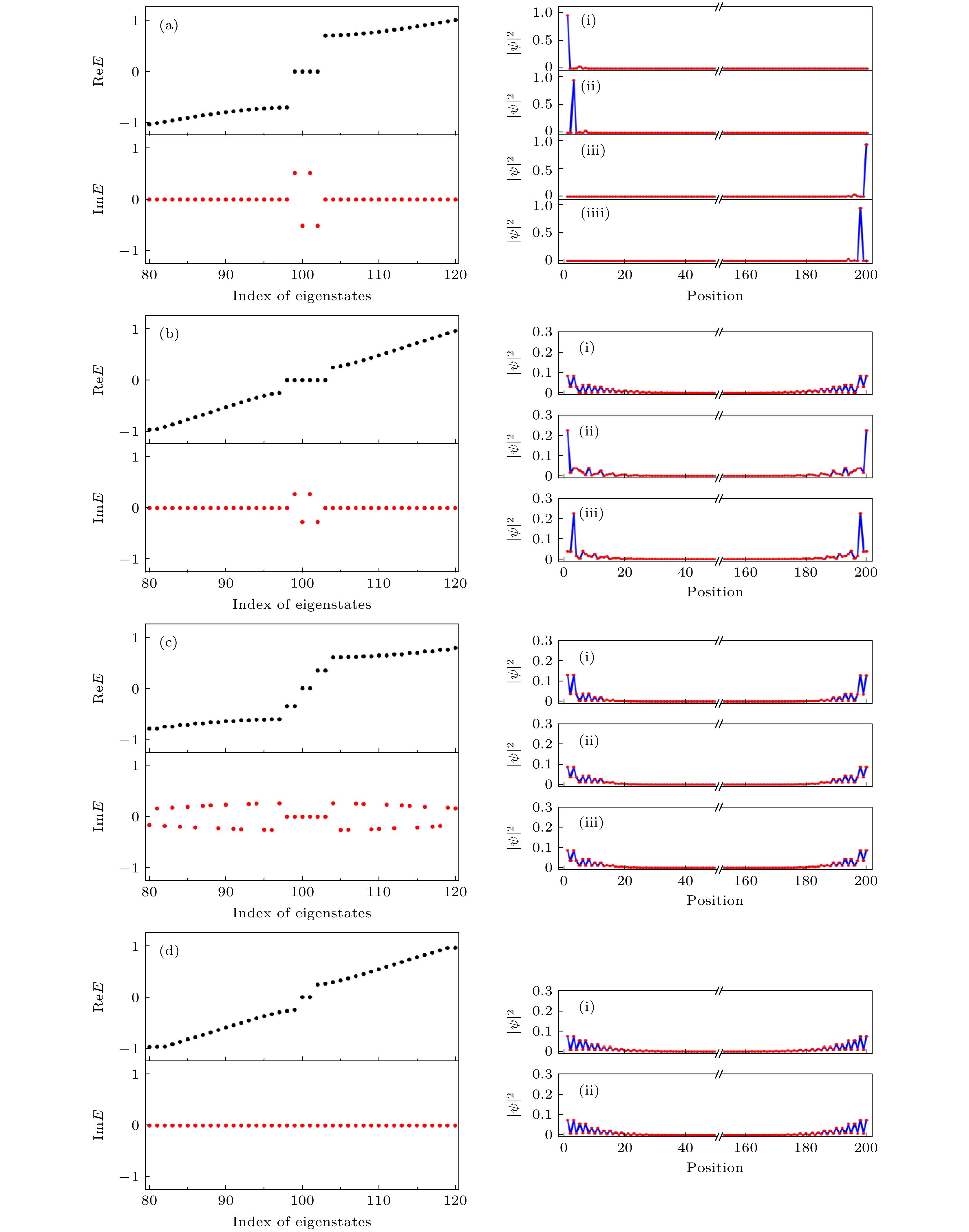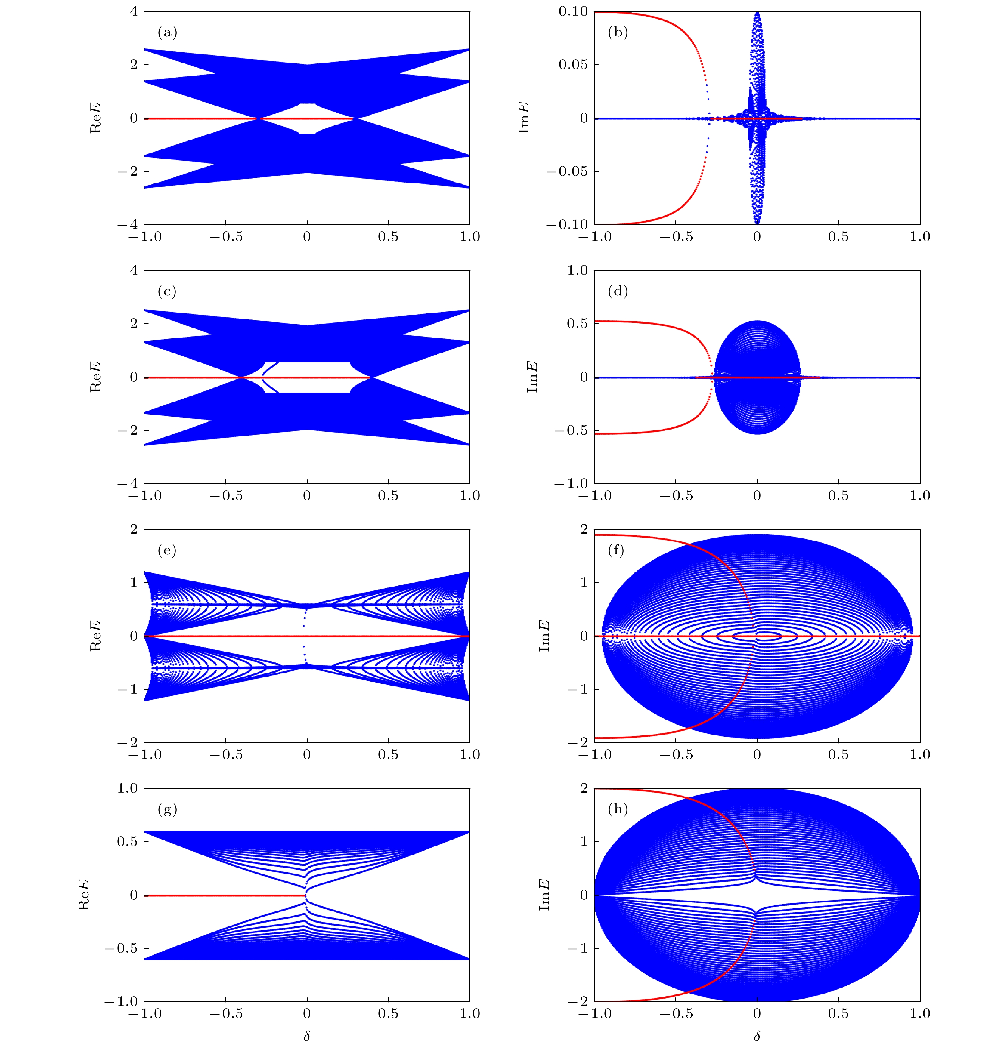 ${\cal {PT}}$ 相变. 此外, 虚势能和自旋轨道耦合共同作用使得拓扑平庸区中发生拓扑相变, 并且拓扑非平庸区变宽. 能谱结果显示, 虚势能和自旋轨道耦合对于体系的零能态有明显的调控作用, 主要在于出现了4种局域性、数目均不同的零能态. 这说明虚势能和自旋轨道耦合对体系的能带结构的特殊调节效果. 本文有助于理解${\cal {PT}}$ 对称非厄米系统的拓扑相变行为.The topological property and the energy property of one-dimensional non-Hermitian spin-orbit-coupled Su-Schrieffer-Heeger (SSH) model are investigated theoretically, by introducing spin-dependent imaginary potentials with gain and loss effects. It is found that the imaginary potential leads the imaginary energy spectra to appera in the topologically nontrivial region of this system, and the${\cal {PT}}$ phase transition to happen in the topologically trivial region. In addition, the imaginary potential energy and spin-orbit coupling work together to make the topological phase transition occur in the topologically trivial region, and the topological non-trivial region becomes wider. The energy spectrum results show that the imaginary potential energy and the spin-orbit coupling can obviously control the zero-energy states of the system, which mainly lies in the presence of four zero-energy states with four different localities and numbers. This shows the special adjustment effect of imaginary potential energy and spin-orbit coupling on the energy band structure of the system. It is believed that these results are helpful in understanding the topological phase transition behavior of${\cal {PT}}$ -symmetric non-Hermitian system.-