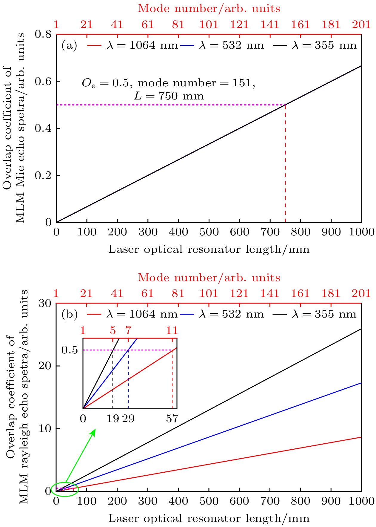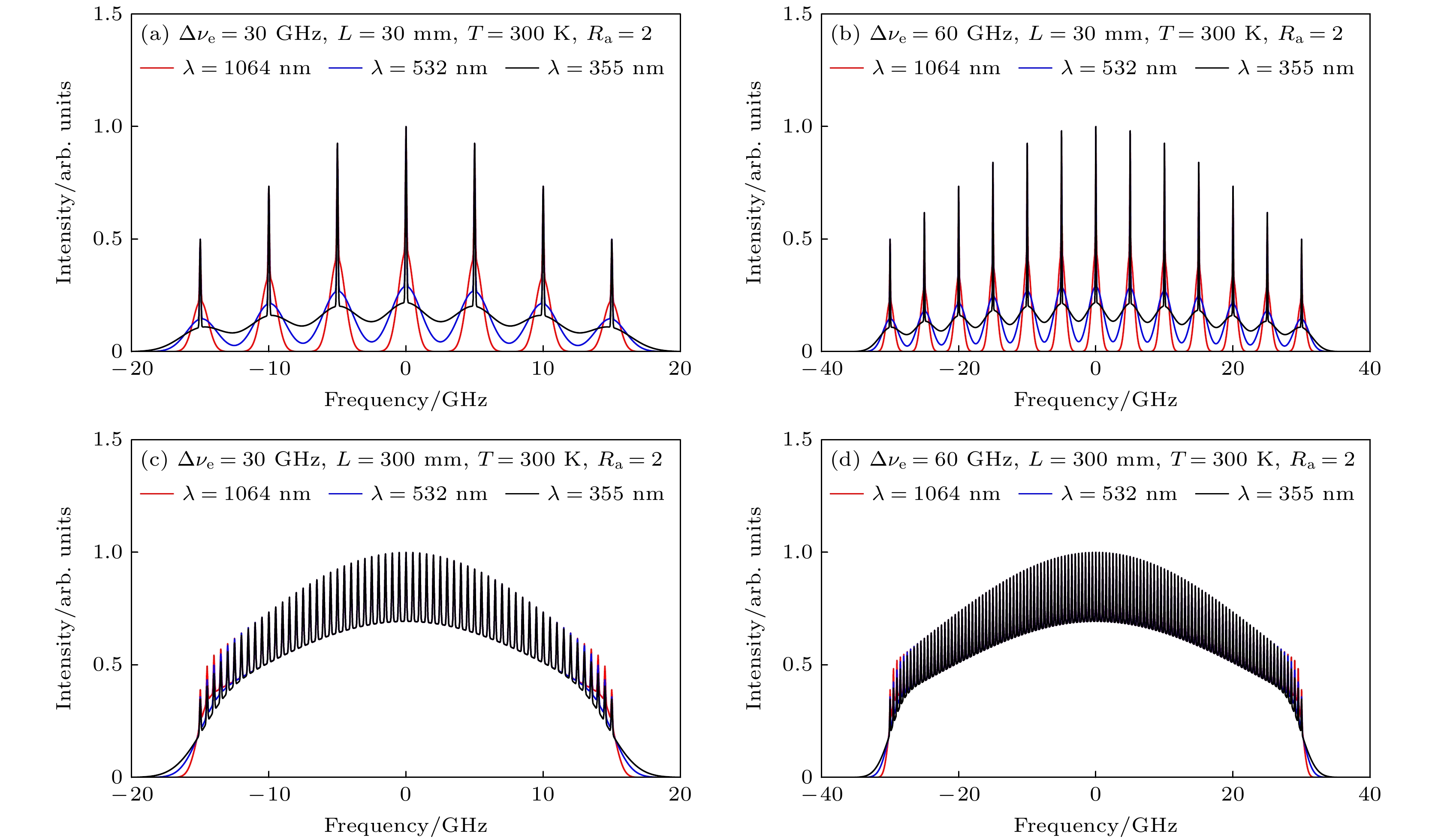 L= 30 mm and 300 mm), and laser center wavelengths (