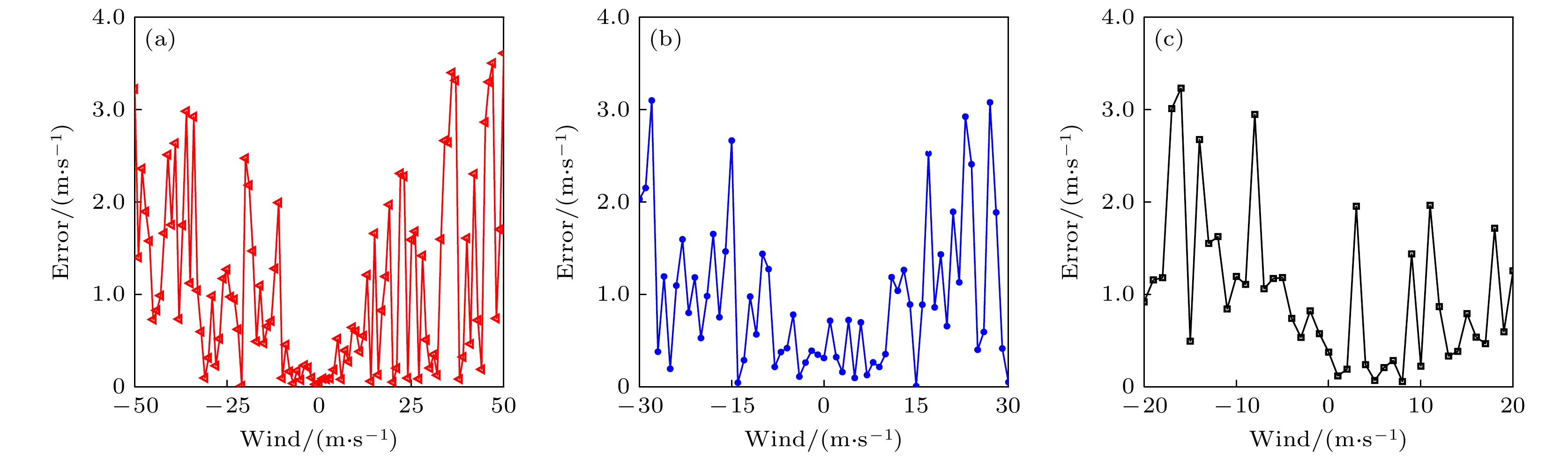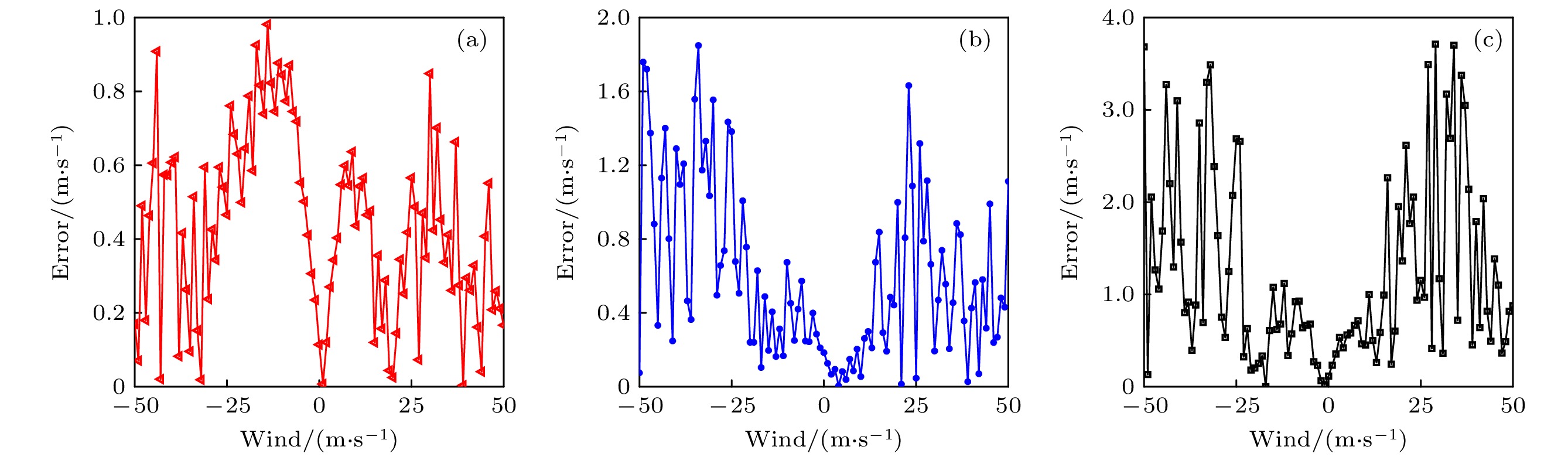 λ= 355 nm, the maximum detectable wind speeds of MLM DDWL are about 50, 30, and 20 m/s, and the wind measurement errors can be controlled within 2.5, 3.0, and 4.0 m/s, respectively. When the center wavelength of each laser is 532 nm, and the lengths of laser optical resonator are 30 mm and 300 mm, then the maximum detectable wind speeds of MLM DDWL are about 50 m/s and 30 m/s, and the wind measurement errors can be controlled within 2.0 m/s and 3.0 m/s, respectively. Therefore, the longer the laser center wavelength and the shorter the laser optical resonator length, the larger the wind measurement range will be and the smaller the wind measurement error.