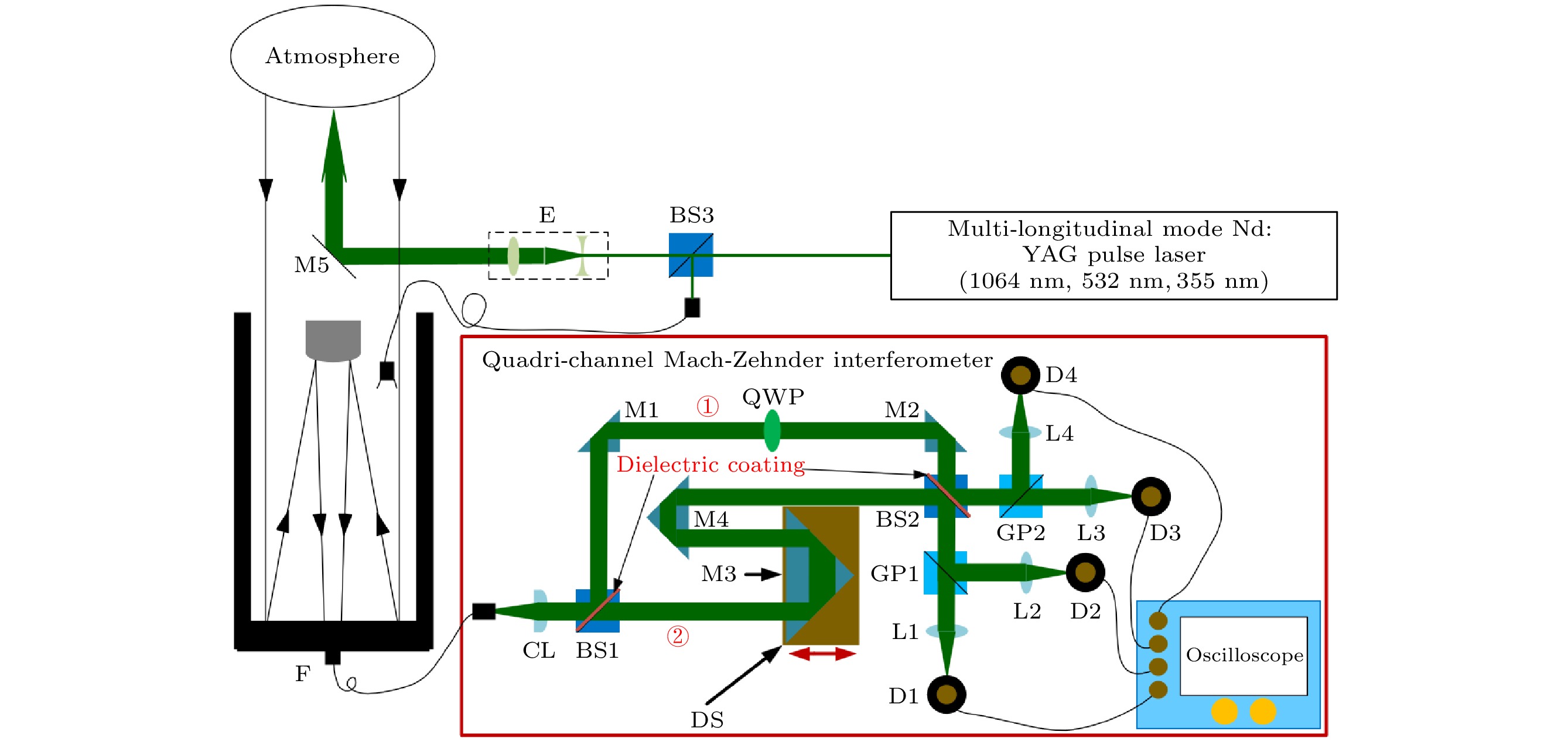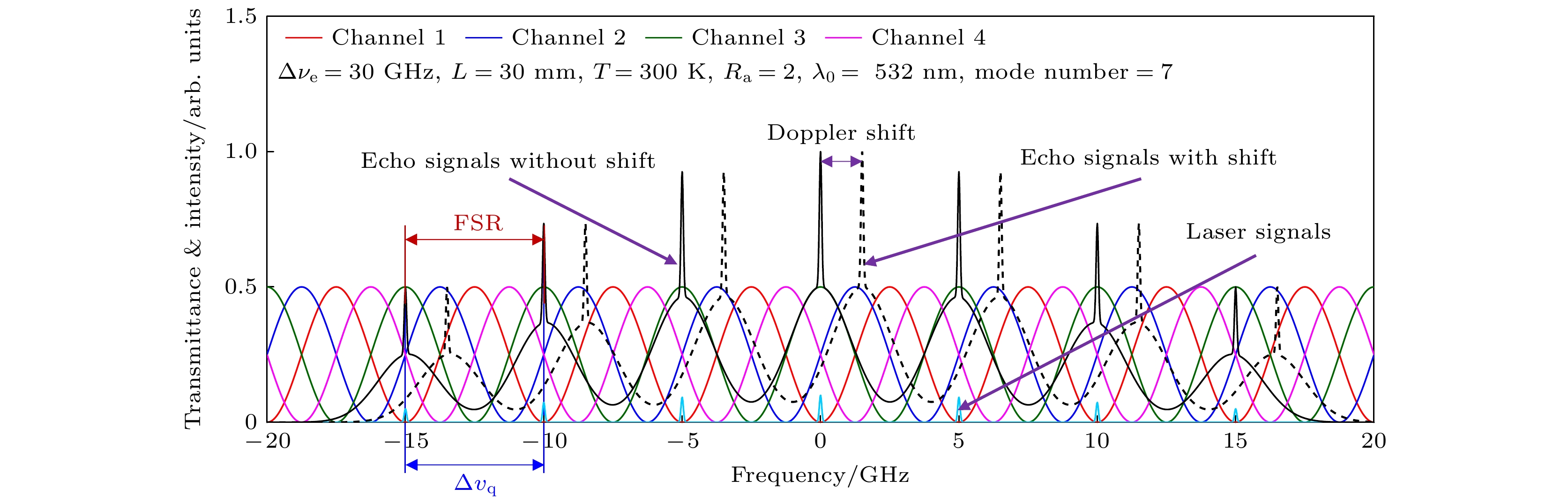Subsequently, a QMZI is designed as the spectral discriminator to achieve high-precision measurement for the Doppler frequency shift of scattering spectra of atmospheric elastic echo excited by the MLM laser. The designed QMZI has four periodic output channels and the phase difference between adjacent channels is π/2. The mathematical model of the transmittance function of the QMZI is established. The effective transmittance of the QMZI for atmospheric elastic echo scattering spectrum excited by the MLM laser is analyzed based on the partial coherence theory of quasi-monochromatic light interference and the polarization effect of light. On this basis, the data inversion algorithm of MLM DDWL is constructed.