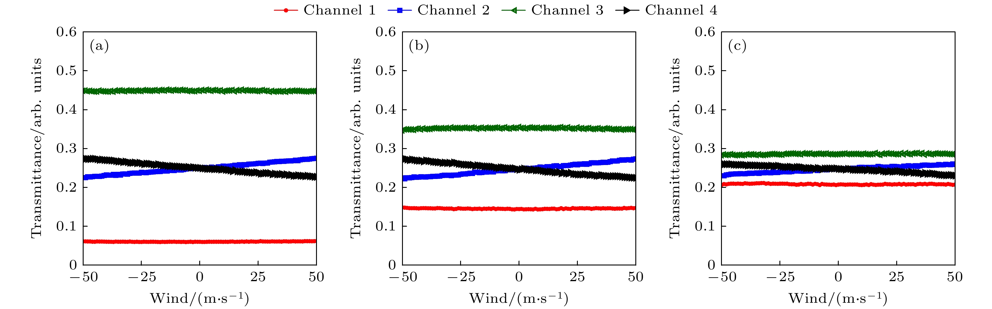 Finally, the simulation experiments of wind measurement are carried out. The QMZI simulation model is built by the non-sequential mode of Zemax optical simulation software. The atmospheric elastic echo scattering spectra excited by the MLM laser are configured by the SPCD files of Zemax optical simulation software under different theoretical wind speeds ranging from –50 to 50 m/s, laser optical resonator lengths (