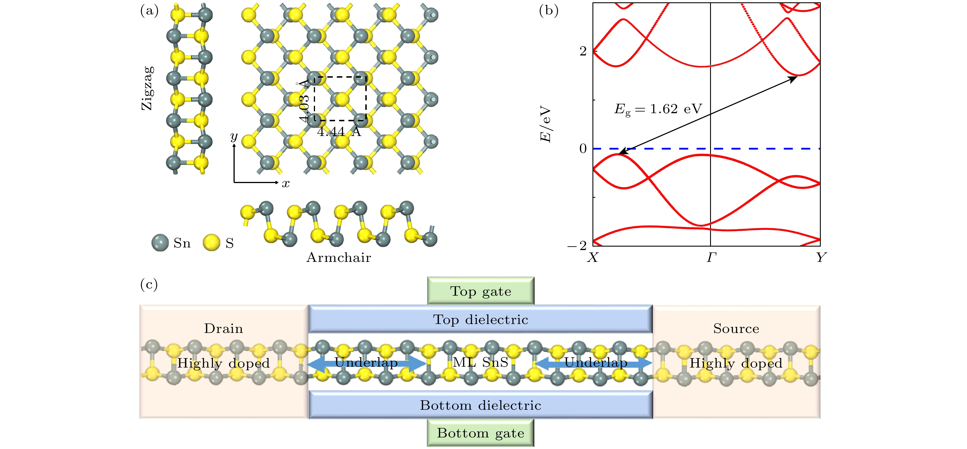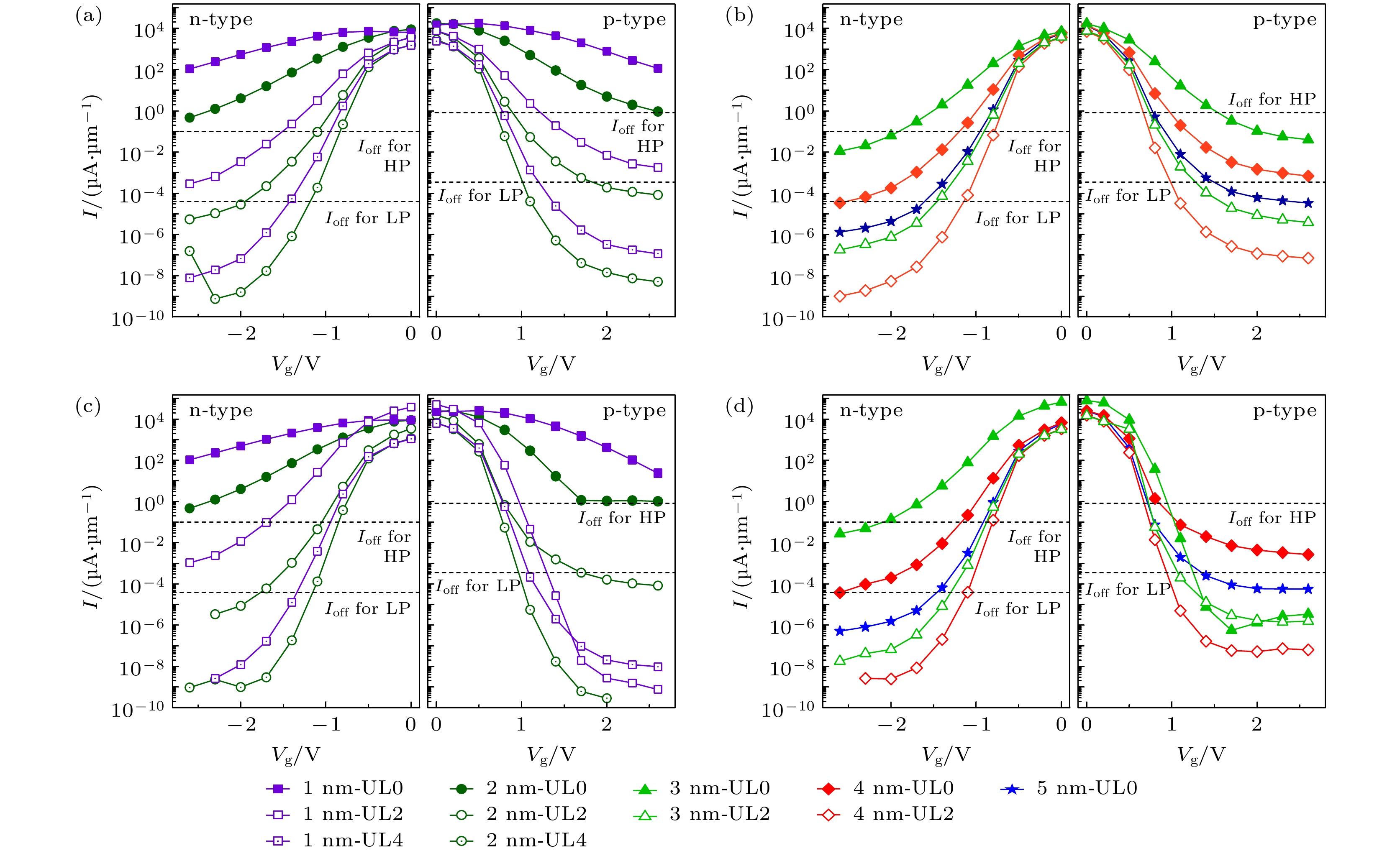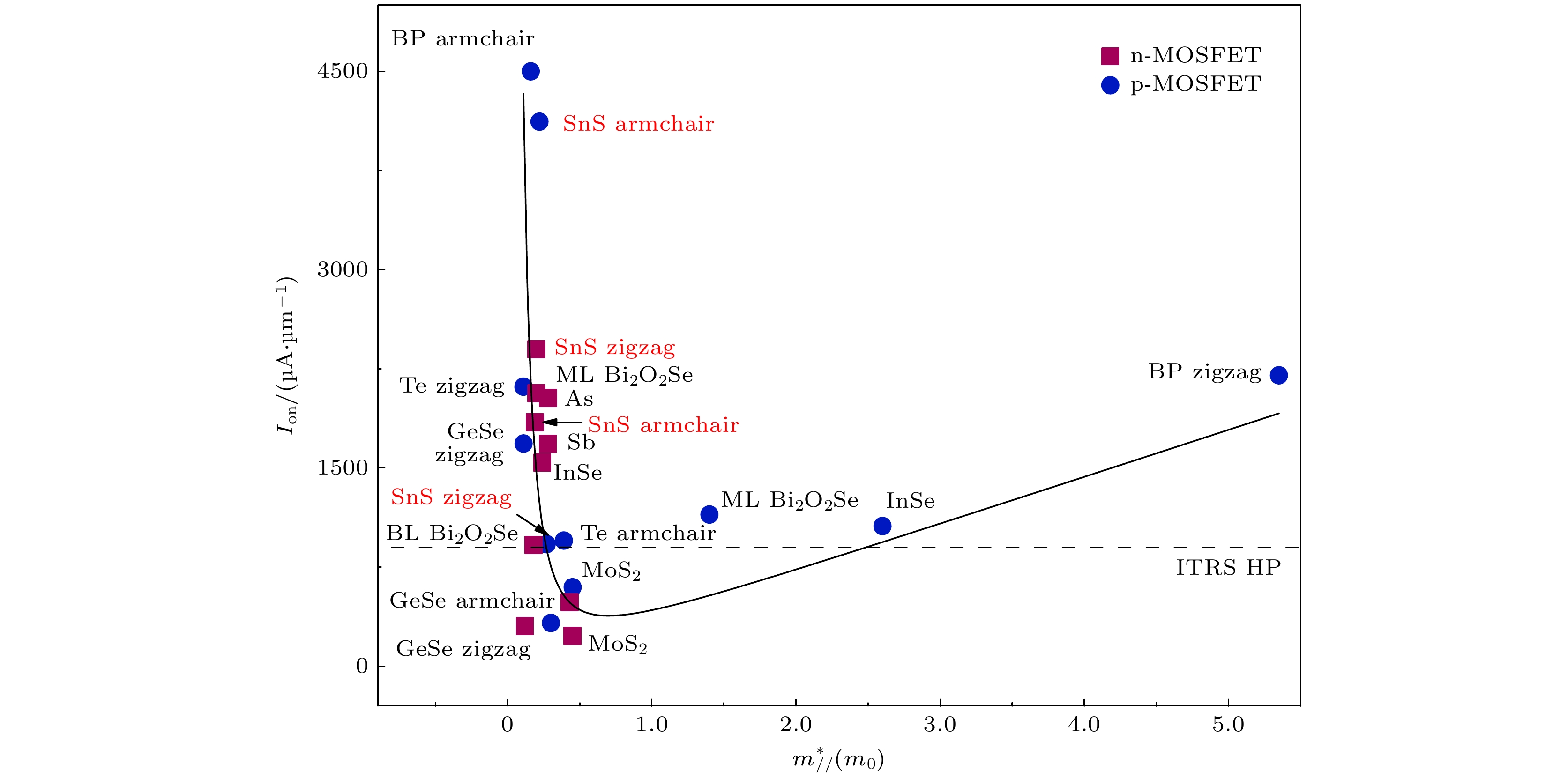 • 基于硅基材料的逻辑器件由于其短沟道效应, 使摩尔定律失效, 二维半导体材料被认为是继续缩小晶体管尺寸以生产更多摩尔电子器件的潜在沟道材料. 最近在实验上突破了技术瓶颈的限制, 实现了二维场效应晶体管突破亚1 nm沟道极限, 并且表现出优异的器件性能. 这极大地鼓舞了在理论上进一步探索二维器件的性能. 二维SnS具有较高的载流子迁移率和各向异性的电子性能, 且材料性能环境稳定. 本文应用第一性原理研究了亚5 nm SnS 场效应晶体管的量子输运特性, 鉴于SnS的各向异性, 本文将器件沿单层SnS的armchair和zigzag两个方向进行构造, 发现p型zigzag方向的器件性能优于其他类型(包括n型、p型的armchair方向和n型的zigzag方向). p型zigzag方向器件的开态电流在栅长缩短到1 nm也能满足国际半导体技术路线图的高性能(HP)器件要求, 其值高达1934 μA/μm. 这在目前报道的1 nm栅长上的器件材料性能方面处于领先.