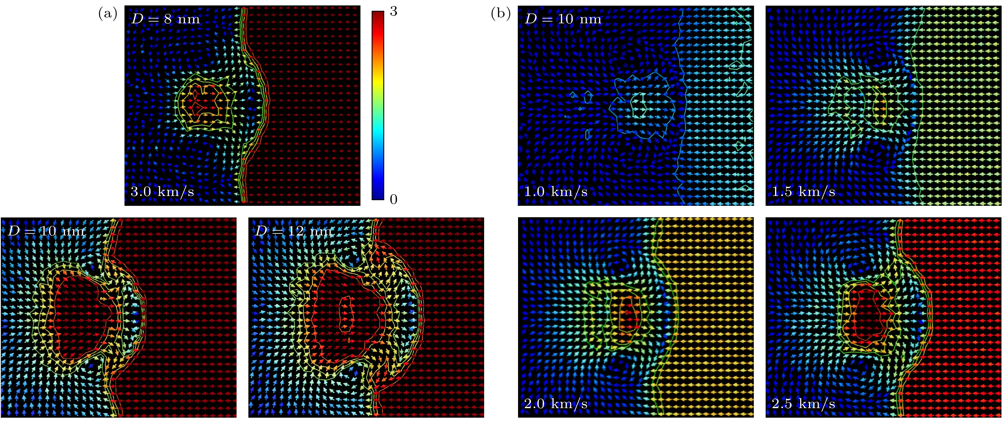 采用分子动力学模拟方法研究纳米气泡逐渐凹陷并发展至溃灭的过程, 本文主要研究冲击速度和气泡尺寸对纳米气泡溃灭的动力学特性影响机制. 结果表明: 纳米气泡溃灭大体上经历三个阶段. 首先是气泡外侧水分子压缩阶段, 然后是冲击波导致液膜稳定结构被破坏阶段, 最终发展至气泡完全溃灭阶段; 在冲击速度较大时, 较小尺寸气泡在更强的冲击效果作用下, 气泡溃灭时间更短; 纳米气泡溃灭后高速射流后在速度等高线右端形成凸起, 随着气泡尺寸和冲击速度增大, 凸起程度就越大, 水分子向气泡中心汇集, 在气泡上方和下方形成涡旋结构, 有效的增强了流体内部传质作用; 随着气泡尺寸和冲击速度的增大, 气泡周围密度也逐渐增大, 气泡完全时溃灭时局部密度可达1.5 g/cm 3附近; 当气泡体系衰减至一半时, 出现水锤冲击效应, 随着气泡尺寸和冲击速度的增大, 水锤冲击作用愈发明显, 对于 u p= 3.0 km/s, D= 10 nm的纳米气泡结构塌陷后射流水锤冲击所形成的局部压强可达30 GPa.This study employs molecular dynamics simulations to investigate the process of nanobubble gradual indentation and eventual collapse. The research primarily focuses on the mechanisms by which impact velocity and bubble size influence the dynamic characteristics of nanobubble collapse. The results indicate that nanobubble collapse generally proceeds through three stages. Initially, there is a compression phase of water molecules surrounding the bubble, followed by a phase where the shock wave disrupts the stable structure of the liquid film, and finally, the complete collapse of the bubble. At higher impact velocities, smaller bubbles collapse more rapidly due to stronger shock effects. Post-collapse, a high-speed jet forms a protrusion on the right end of the velocity contour. The degree of protrusion increases with bubble size and impact velocity. Water molecules converge towards the bubble center, forming vortex structures above and below the bubble, effectively enhancing internal mass transfer. As bubble size and impact velocity increase, the density around the bubble gradually rises, reaching approximately 1.5 g/cm³ in localized areas upon complete collapse. When the bubble system decays to half its original size, a water hammer effect occurs. This effect becomes more pronounced with increasing bubble size and impact velocity. For a nanobubble structure with u p= 3.0 km/s and D= 10 nm, the local pressure formed by the water hammer impact of the jet after collapse can reach 30 GPa.