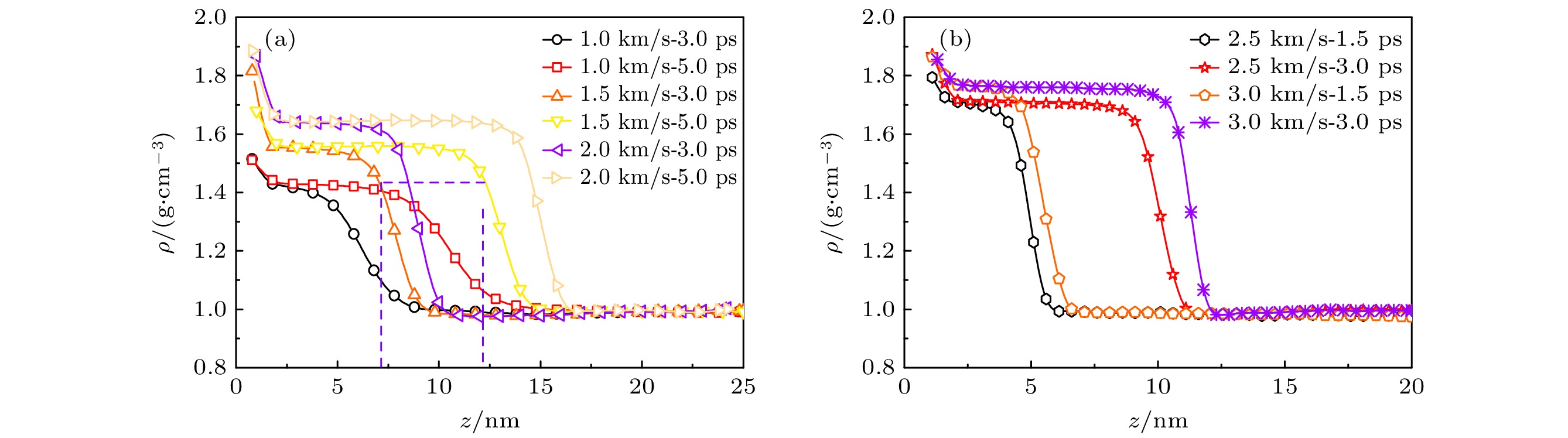 type ε/(kcal·mol–1) σ/Å q/e O 3.166 0.15535 –0.8476 H 0 0 0.4238 up/(km·s–1) us1 us2 us3 uexp usim ε/% 1.0 3.21 3.26 3.17 3.57 3.61 9.8 1.5 4.06 4.14 4.16 4.40 4.30 6.4 2.0 5.07 5.06 5.16 5.25 5.18 2.9 2.5 5.89 5.93 5.99 5.93 5.51 0.6 粒子速度