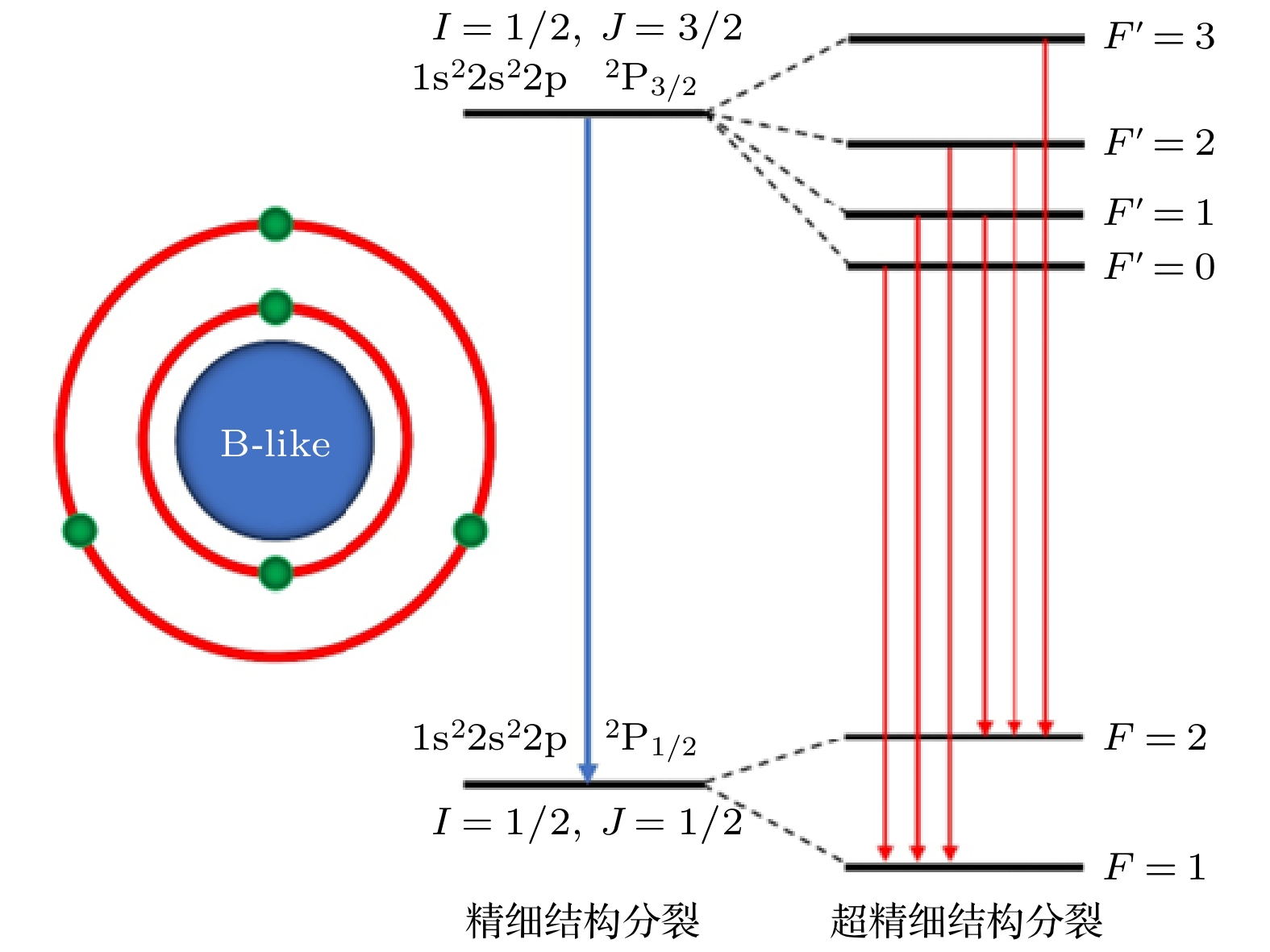 高电荷态离子(highly charged ion, HCI)的精细结构及辐射跃迁性质的精确测量不仅可以检验基本物理模型, 包括: 强场量子电动力学(quantum electrodynamics, QED)效应、电子关联效应、相对论效应、原子核效应等, 而且能够为天体物理和聚变等离子体物理提供关键原子物理参数. 相对于研究较多的类氢和类锂离子体系, 类硼离子的精细结构禁戒跃迁的相对论效应和QED效应的贡献很大, 高精度实验测量与理论计算为进一步检验多电子体系的基本物理模型提供了重要途径. 此外, 类硼离子也被认为是最佳的高电荷态离子光钟候选体系. 本文主要介绍了类硼离子基态 2P 3/2— 2P 1/2跃迁的实验和理论研究最新进展, 概述了其精细结构和超精细结构的研究现状, 并讨论了使用电子束离子阱结合高分辨光谱学实验技术开展类硼离子超精细分裂实验测量的方案, 为未来开展类硼离子超精细分裂实验研究并在更高精度上检验QED效应, 提取原子核磁化分布半径, 检验相关的核结构模型等研究提供了参考.The precise measurement of the fine structure and radiative transition properties of highly charged ions (HCI) is essential for testing fundamental physical models, including strong-field quantum electrodynamics (QED) effects, electron correlation effects, relativistic effects, and nuclear effects. These measurements also provide critical atomic physics parameters for astrophysics and fusion plasma physics. Compared with the extensively studied hydrogen-like and lithium-like ion systems, boron-like ions exhibit significant contributions in terms of relativistic and QED effects in their fine structure forbidden transitions. High-precision experimental measurements and theoretical calculations of these systems provide important avenues for further testing fundamental physical models in multi-electron systems. Additionally, boron-like ions are considered promising candidates for HCI optical clocks. This paper presents the latest advancements in experimental and theoretical research on the ground state 2 P 3/2— 2 P 1/2transition in boron-like ions, and summarizes the current understanding of their fine and hyperfine structures. It also discusses a proposed experimental setup for measuring the hyperfine splitting of boron-like ions by using an electron beam ion trap combined with high-resolution spectroscopy. This proposal aims to provide a reference for future experimental research on the hyperfine splitting of boron-like ions, to test the QED effects with higher precision, extract the radius of nuclear magnetization distribution, and validate relevant nuclear structure models.