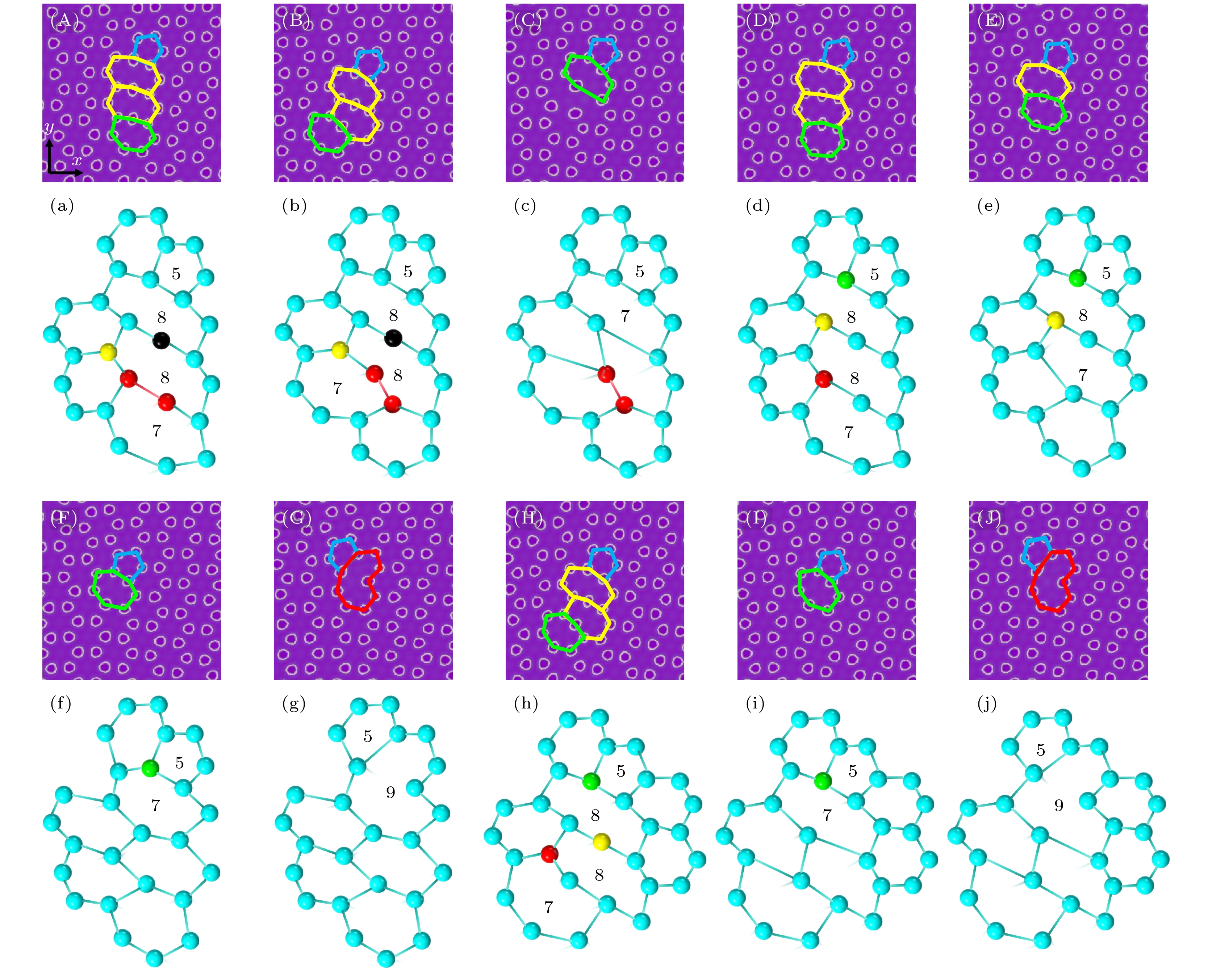 The evolution law and mechanism of grain boundary structure in the deformation process of graphene are of great significance for understanding the deformation behavior of graphene and optimizing its mechanical properties. In this work, single-layer graphene is taken as the research object and a double crystalline graphene model is established by using the three-mode phase-field crystal method, thereby in depth ascertaining the evolution mechanism of dislocations at small-angle symmetrical tilt grain boundaries in graphene under strain. In view of the relaxation and deformation process, the relationship between the number of multiple dislocations and the grain boundary angle of graphene is studied on an atomic scale, and the deformation and failure mechanism of double crystalline graphene under tensile load are revealed, and also discussed from the perspective of the free energy.It is found that, after relaxation, with the increase of grain boundary angle, the density of dislocations at the grain boundary decreases, and the number of specific types of dislocations (5|8|7 and 5|7 dislocations) increases. Under stress loading parallel to the grain boundary, the changes of free energy of the systems containing grain boundaries with different angles show the same trend: at first, they fall to the inflection point and then rise abnormally, and the dislocation behavior cannot effectively alleviate the stress concentration caused by continuous loading in the system, leading to failure finally.Under tensile load, the free energy changes of the systems are divided into four stages, they being stage (I), in which the dislocations at grain boundaries are slightly deformed but do not change their structure, stage (II), in which dislocations at the grain boundaries are transformed into 5|7 or 5|9 dislocation due to C—C bond fracture or rotation, and the dislocations that are “incompatible” have higher energy, making them more conducive to improving the tensile properties of graphene, stage (III), in which the 5|7 and 5|9 dislocations begin to fail, and the free energy shows a tendency to decrease significantly, and stage (IV), in which the double crystalline graphene systems are completely in failure. The system with a grain boundary angle of 10° exhibits the most substantial deduction in free energy in stages (I), (II), and (III), and possesses the highest overall tensile strength.This work contributes to understanding the micromechanical behavior of graphene on an atomic scale.