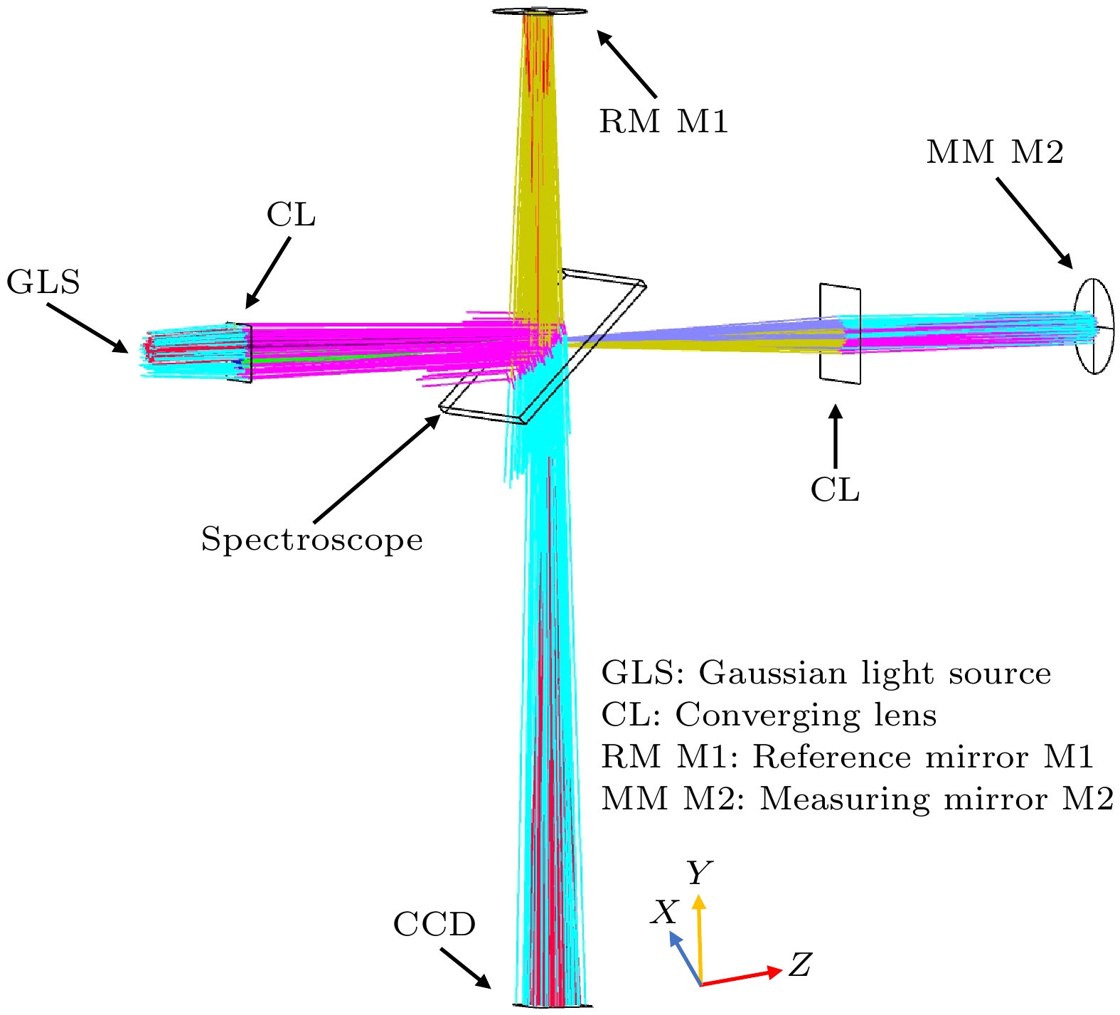 In order to solve the problem that the measurement arm length needs to be obtained in real time when calculating the measurement angle in the process of Tolansky interference small angle measurement, a dual-arm Tolansky interference autocollimation angle measurement scheme is proposed, which not only maintains the function of Tolansky interference, but also integrates the principle of optical leverage. In the simulation study, it is found that the splitter with thickness in the scheme will lead to the lateral offset of the optical axis of the emitted light, which will change the position of the virtual point light source, and finally change the position of the center of the interference circle on the detector. In this work, in order to reduce the influence of the thickness of the beam splitter on the angle measurement accuracy of the angle measurement scheme, the optical path structure of the angle measurement scheme is redrawn, and the relationship between the center offset of the interference ring and the deflection angle, which contains the thickness factor and can accurately describe the optical path, is deduced. Therefore, the corresponding method is adopted as follows. Firstly, the measurement optical path of the splitter with a thickness factor is redrawn, the splitter is partially enlarged, and the original beam is replaced with the center line of the laser beam to draw the optical path. Then, the position of the virtual point light source under the influence of the thickness of the splitter is analyzed by using the single refraction spherical formula and the transition formula of geometric optics, and the relationship between the offset of the interference center and the deflection angle with the thickness of the splitter is established. Secondly, the coordinate information of the center of the interference ring under different thickness parameters of the splitter is obtained by using the virtual simulation experiment, which proves the correctness of the theoretical analysis. Then, simulation experiments such as simulation measurement of multiple sets of setting angles and angle measurement under different splitter thickness conditions are carried out, and the accuracy of the relationship including the splitter thickness factor deduced above is cross-validated. Finally, combined with the actual experiment, measurements are taken on the guide rail and calibrated autocollimator, and the influence of beam splitter thickness on angle measurement accuracy is investigated in detail. The research results are obtained below. Experiments show that the thickness of the splitter will affect the position of the initial center of the circle; with the increase of the thickness of the splitter, the error between the simulation measurement results and the relationship including the thickness factor is within ± 0.5 % at different angles, and the experimental data and theoretical results are in good agreement. At the same angle, as the thickness of the beam splitter increases, the difference between the established relationship and the approximate relationship gradually increases. With 1-mm-thick beam splitter, the relative error between the established relationship and the calculated value of the approximate relationship is only 0.22 % based on the data of the guide rail measured by the calibrated autocollimator. From these results, a conclusion can be drawn below. The utilizing a thinner spectroscope can effectively reduce the calculation and measurement errors, providing an important guidance for carrying out the in-depth research and development of this new autocollimator.