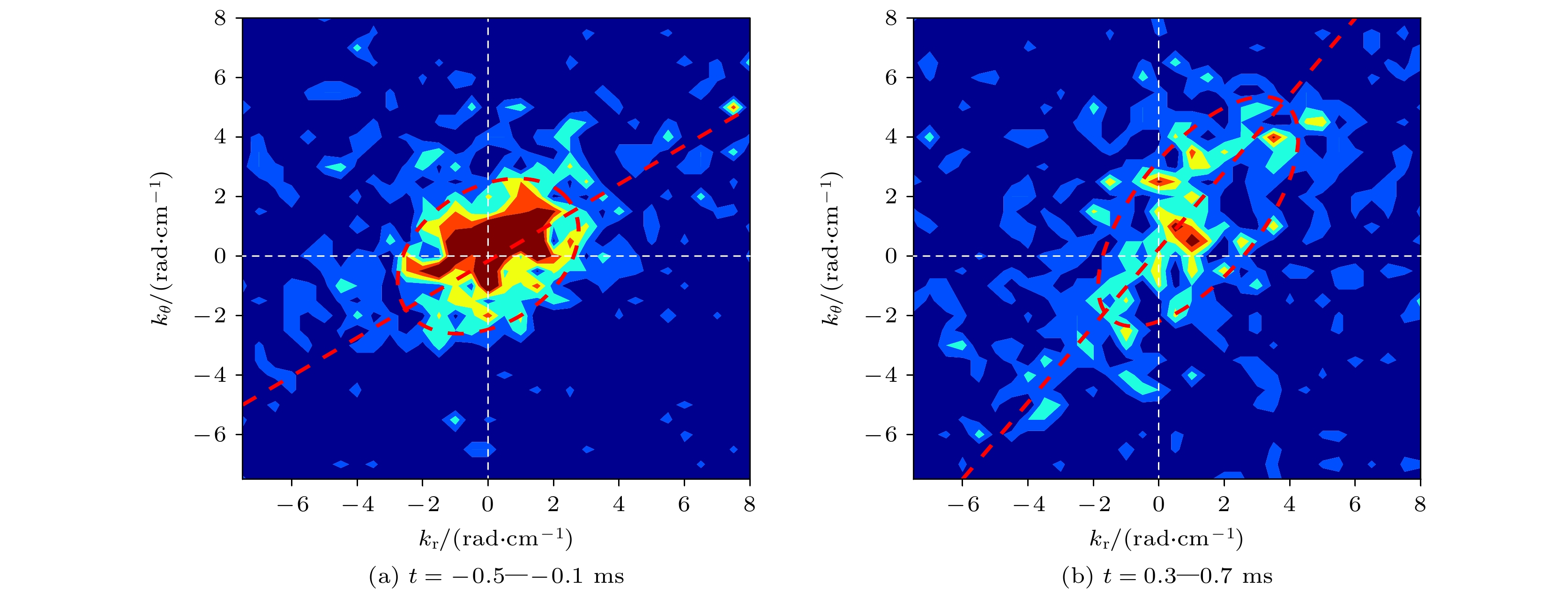 The effect of sawteeth on plasma performance and transport in the plasma of tokamak is an important problem in the fusion field. Sawtooth oscillations can trigger off heat and turbulence pulses that propagate into the edge plasma, and thus enhancing the edge shear flow and inducing a transition from low confinement mode to high confinement mode. The influences of turbulence spreading and symmetry breaking on edge shear flow with sawtooth crashes are observed in the J-TEXT tokamak. The edge plasma turbulence and shear flow are measured using a fast reciprocating electrostatic probe array. The experimental data are analyzed using some methods such as conditional average and probability distribution function. After sawtooth crashes, the heat and turbulence pulses in the core propagate to the edge, with the turbulence pulse being faster than the heat pulse. The attached figures (a)–(e) show the core electron temperature, and the edge electron temperature, turbulence intensity, turbulence drive and spreading rates, Reynolds stress and its gradient, and shearing rates, respectively. After sawtooth crashes, the edge electron temperature increases and the edge turbulence is enhanced, with turbulence preceding temperature. The enhanced edge turbulence is mainly composed of two parts: the turbulence driven by local gradient and the turbulence spreading from core to edge. The development of the estimated turbulence spreading rate is prior to that of the turbulence driving rate. The increase in the turbulence intensity can cause the turbulent Reynold stress and its gradient to increase, thereby enhancing shear flows and radial electric fields. Turbulence spreading leads the edge Reynolds stresses to develop and the shear flow to be faster than edge electron temperature. The Reynolds stress arises from the symmetry breaking of the turbulence wave number spectrum. After sawtooth collapses, the joint probability density function of radial wave number and poloidal wave number of turbulence intensity becomes highly skewed and anisotropic, exhibiting strong asymmetry, which can be seen in attached figures (f) and (g). The development of turbulence spreading flux at the edge is also prior to the particle flux driven by turbulence, indicating that turbulent energy transport is not simply accompanied by turbulent particle transport. These results show that the turbulence spreading and symmetry breaking can enhance turbulent Reynolds stress, thereby driving shear flows, after sawtooth has crashed.