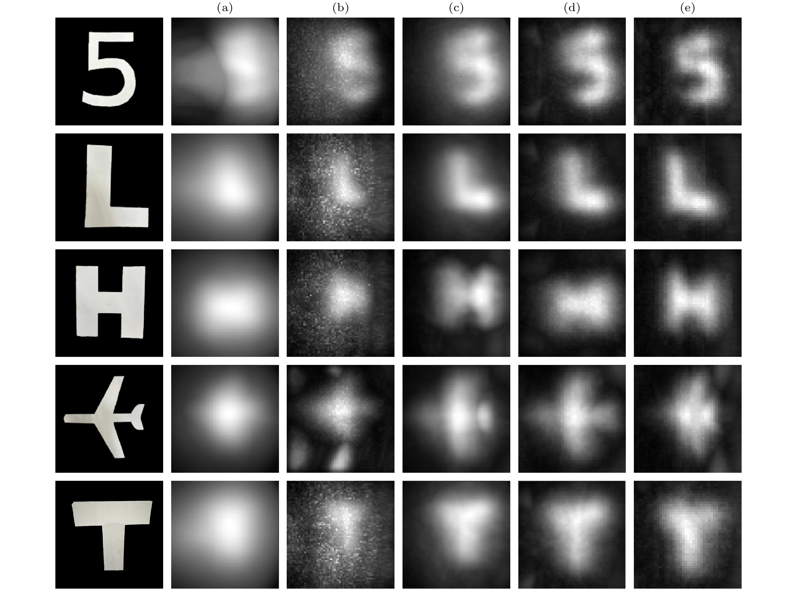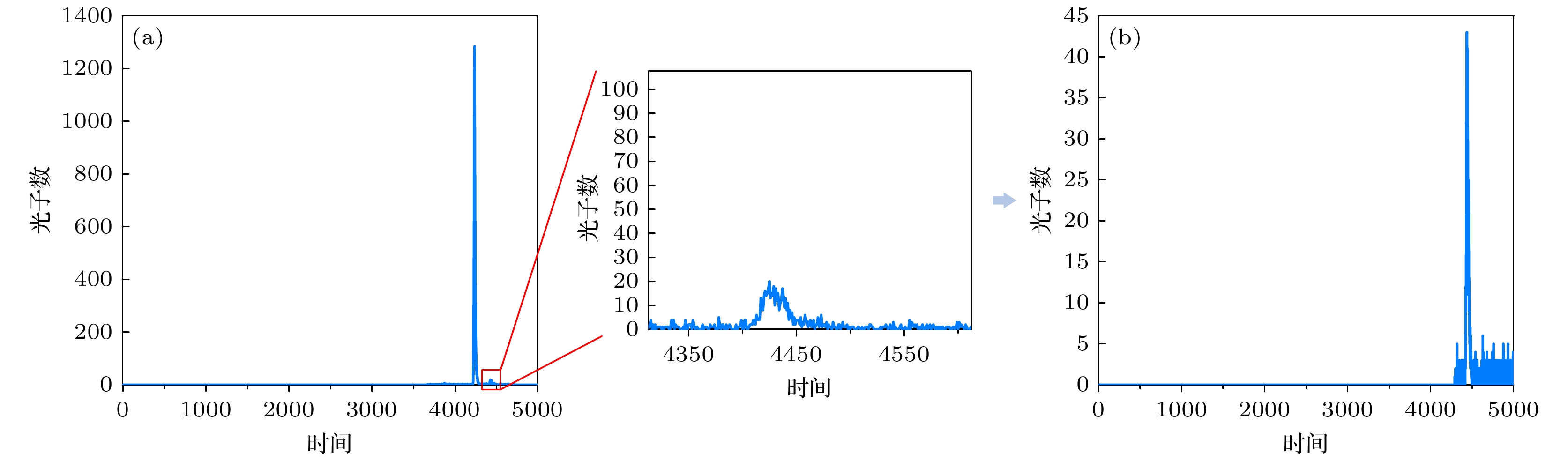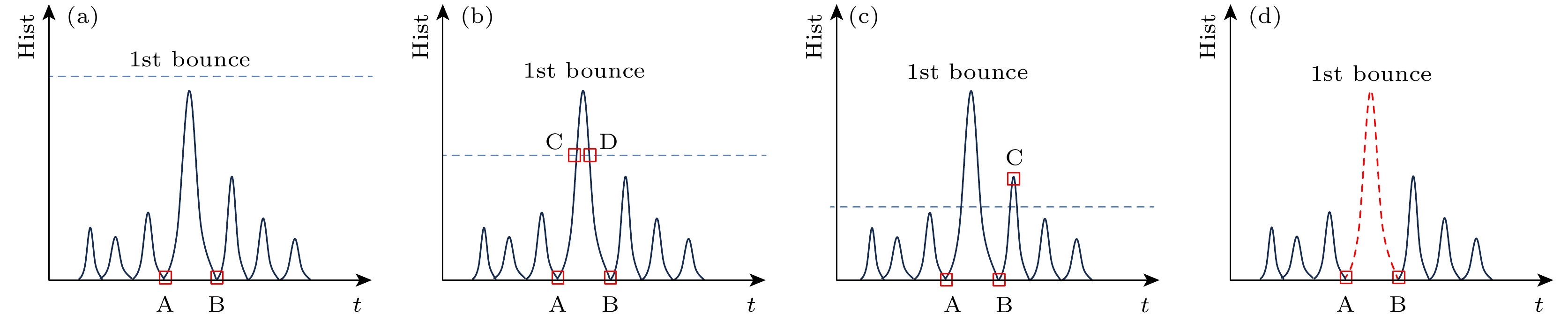 非视域成像技术是对视域外隐藏目标进行光学成像的新兴技术. 由于历经多次漫反射, 信号回波微弱, 门控单光子雪崩二极管(single-photon avalanche diode, SPAD)在低信噪比环境中探测信号发挥了重要作用. 然而, 实际使用门控SPAD进行目标信号探测时, 现有方法多需要借助先验信息进行门宽位置预设, 无法完全避免非目标信号干扰和信号丢失, 并且存在数据采集量大、耗时长等问题. 针对上述问题, 本文利用三角定位原理和少量特征点信息, 提出一种自适应门控算法, 该算法可自动识别回波信号并计算其宽度, 无需额外先验信息或人工干预, 降低数据采集量, 提高处理效率等功能. 同时, 搭建了基于门控SPAD的共焦非视域成像系统, 对提出的算法进行验证. 此外, 本文就门控SPAD对目标信号提升效果和目标成像质量进行了定量评估, 并对比了主流的非视域图像重构算法成像质量. 实验结果表明, 自适应门控算法可以有效识别回波信号, 实现门控参数的自动调节, 并在减少数据采集量、提升处理效率的同时, 提高目标成像质量.Non-line-of-sight (NLOS) imaging is an emerging optical imaging technique used for detecting hidden targets outside the line of sight. Due to multiple diffuse reflections, the signal echoes are weak, and gated single-photon avalanche diode (SPAD) plays a pivotal role in signal detection under low signal-to-noise ratio (SNR) conditions. However, when gated SPAD is used for detecting a target signal, existing methods often depend on prior information to preset the gate width, which cannot fully mitigate non-target signal interference or signal loss. Additionally, these methods encountered some problems such as large data acquisition volumes and lengthy processing times. To address these challenges, an adaptive gating algorithm is proposed in this work based on the principle of maximizing the distance from the vertex of a triangle to its base. The algorithm possesses advantages of the linear variation in scan point positions and the echo information from specific feature points. It can automatically identify echo signals and compute their widths without additional prior information or manual intervention. This method reduces the amount of data collected, improves processing efficiency, and has other benefits. Moreover, a confocal NLOS imaging system based on gated SPAD is developed to validate the proposed algorithm. The work further quantitatively evaluates the enhancement of target signal detection and image quality achieved by gated SPAD, and compares its imaging performance with leading NLOS image reconstruction algorithms. Experimental results demonstrate that the adaptive gating algorithm can effectively identify echo signals, facilitate automatic adjustment of gating parameters, and significantly improve target imaging quality while reducing data acquisition volume and enhancing processing efficiency.