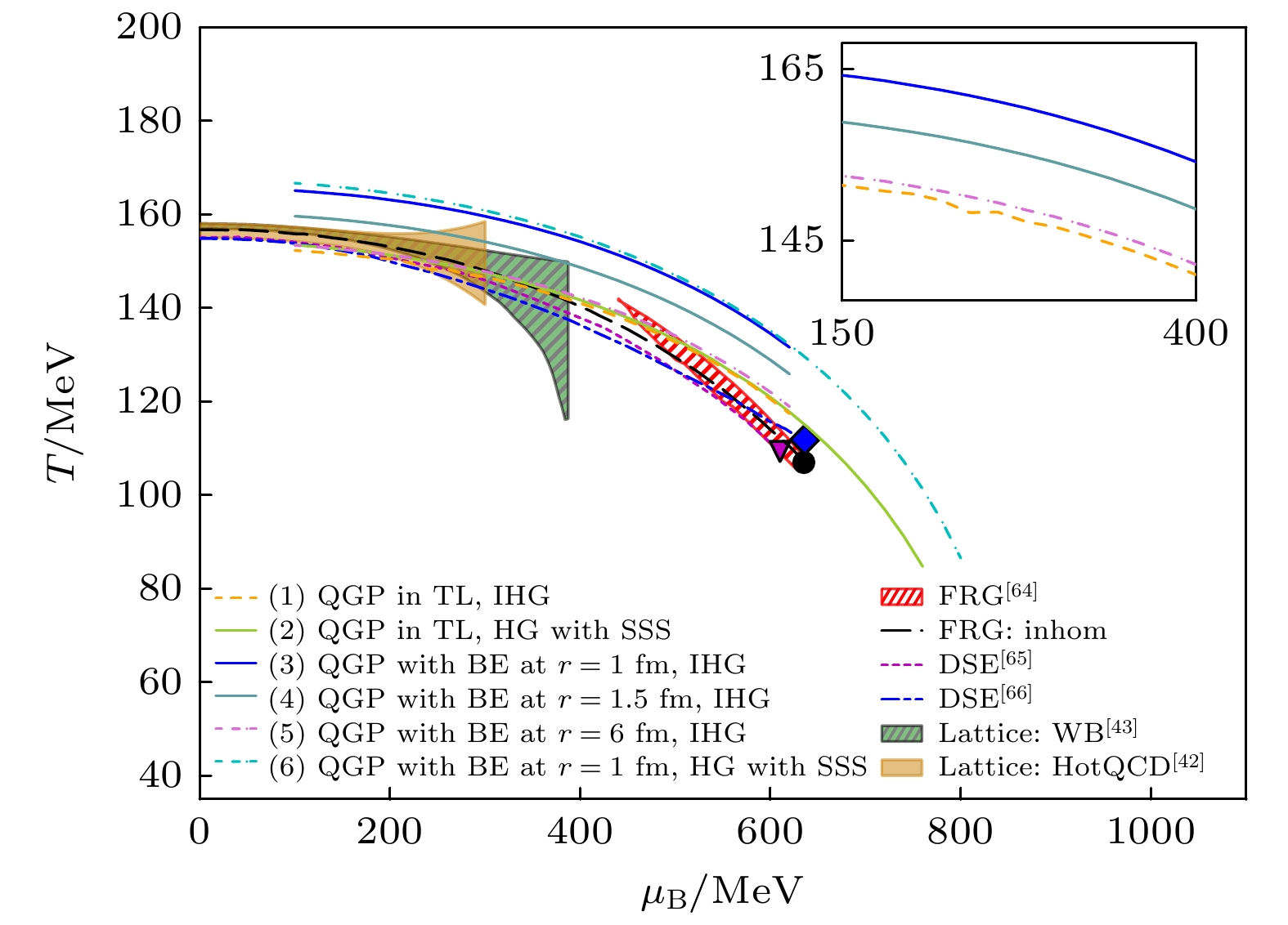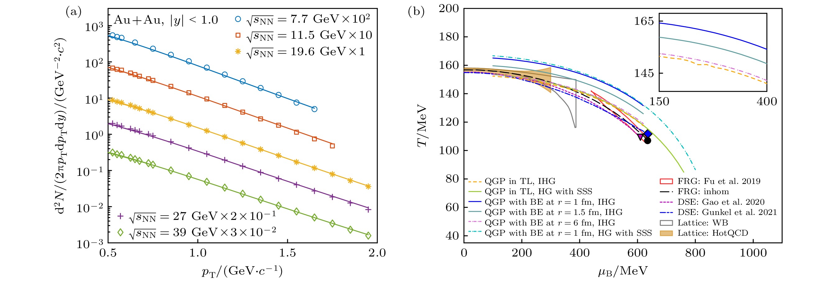 聚焦于小尺度$ \text{s} $夸克物质的边界效应和强子气体中强子的自相似结构对夸克胶子等离子体 (QGP)-强子相变的影响, 采用多级反射展开方法研究了包含$ \text{s} $夸克的QGP热滴的边界效应. 通过计算发现在边界效应的影响下, 小尺度$ \text{s} $夸克物质相较于热力学极限条件下具有更低的能量密度、熵密度和压强. 在强子相中, $ \text{K} $介子在集体流、量子关联和强相互作用的影响下, 与相邻π介子形成两体自相似结构. 通过两体分形模型对$ \text{K} $介子的自相似结构影响计算得出, $ \text{K} $介子的自相似结构存在于碰撞系统中, 导致$ \text{K} $介子的能量密度、熵密度和压强增大. 本研究预测在低能碰撞HIAF能区, $ \text{K} $介子的自相似结构影响因子 $ q_{1} = 1.042 $. 考虑边界效应和$ \text{K} $, π介子的自相似结构对相变的影响, 计算发现$ \text{s} $夸克物质在边界效应与自相似结构的影响下相变温度均有所升高. 若$ \text{s} $夸克物质的边界弯曲程度较大, 则相变温度的升幅相较于自相似结构的影响更明显.We investigate the boundary effect of small-scale s quark matter and the self-similarity structure influence of strange hadrons in the hadron gas on quark-gluon plasma (QGP)-hadron phase transition. In this study, the multiple reflection expansion method is used to investigate the boundary effect of QGP droplets containing s quarks. The calculation reveals that under the influence of boundary effect, small-scale s quark matter exhibits that energy density, entropy density, and pressure are all lower. In the hadron phase, there exists a two-body self-similarity structure between K mesons and neighboring π mesons, subjected to collective flow, quantum correlations, and strong interactions. By using two-body fractal model to study the self-similarity structure of the K meson in meson and quark aspects, it is found that the self-similarity structure of the K meson exists in hadron phase, resluting in an increase in the energy density, entropy density, and pressure of the K meson. Furthermore, under the influence of self-similarity structure, the derived transverse momentum spectrum of K meson shows excellent agreement with experimental data (