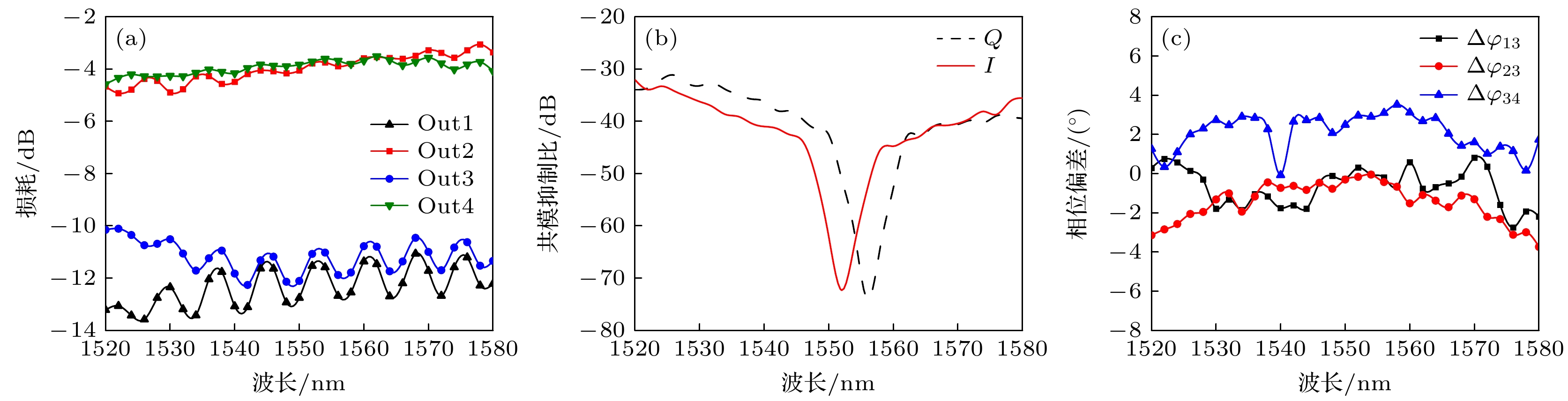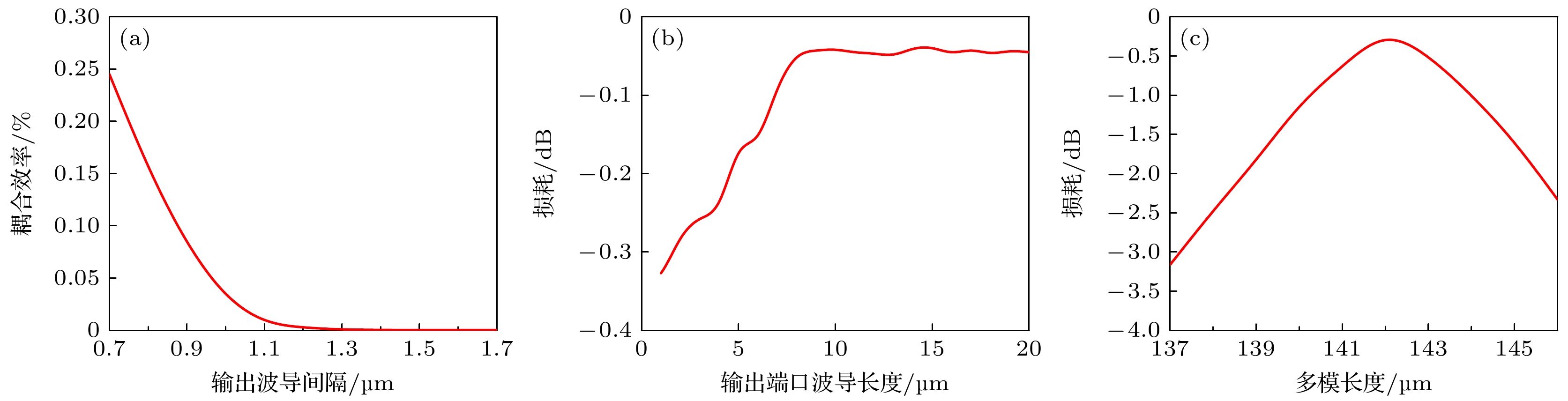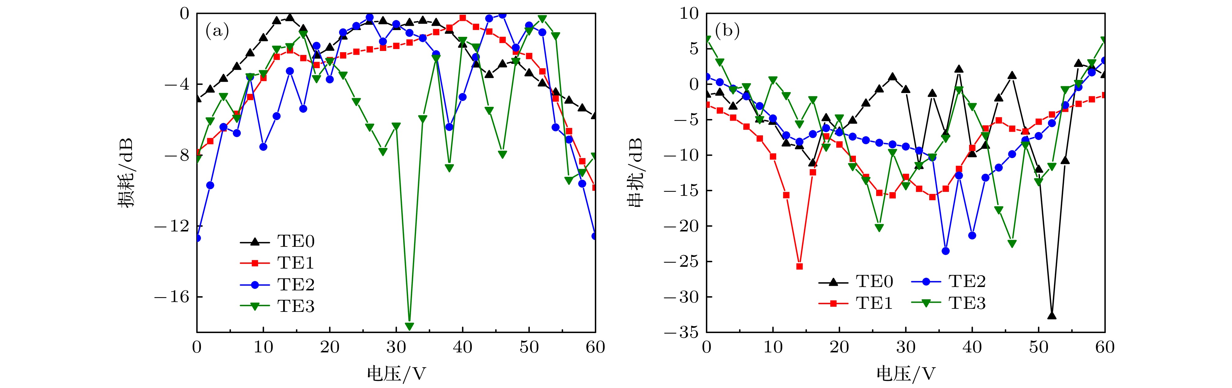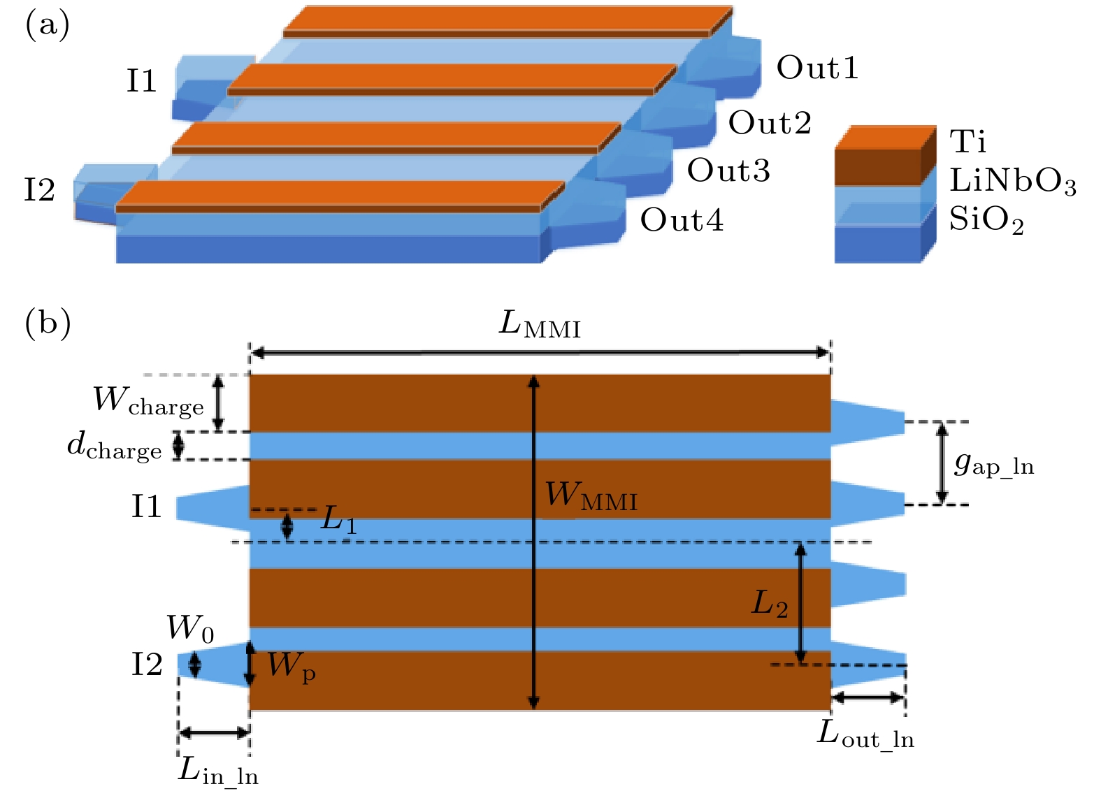 90°optical mixer, as an essential part of coherent optical communication and heterodyne detection, improves polarization discrimination and anti-interference capabilities, increases receiver sensitivity, and permits demodulation of higher-order modulation forms. The disadvantages of traditional 90° optical mixers, however, include their high precision needs, size, mode mismatch restrictions, polarization sensitivity, and single functionality. Utilizing a lithium niobate platform, a multimode interference (MMI) structure, and a micro-thermoelectric electrode array, and with the help of the finite difference time domain (FDTD) method, a multipurpose device that combines 90° optical mixing and mode separation capabilities is designed in this work. According to the results, when no voltage is applied across the micro-thermoelectric electrodes, the multipurpose device acts as a 90° optical mixer. The common-mode rejection ratios of all four outputs are all above –30 dB, phase errors are below 4°, and the losses in the wavelength range of 1520–1580 nm exceed –13.862 dB. When a voltage is applied across the micro-thermoelectric electrodes, TE0, TE1, TE2, and TE3 modes are separated by the multipurpose device acting as a mode splitter. In addition to controlling crosstalk fluctuation within 8.8 dB, the minimum loss divergence between modes is less than 0.024 dB. Research findings indicate that the physical characteristics of optical field interference within the MMI structure enable perfect phase matching and energy distribution across a wide spectrum range, even when no voltage is supplied across the micro-thermoelectric electrode terminals. By controlling the interference superposition process inside the multi-mode region and improving broadband 90° optical mixing parameters, the stable phase-matching conditions are maintained across the wide spectrum. The lithium niobate-based linear electro-optic effect (Pockels effect) modifies the waveguide refractive index distribution through an external electric field when a voltage is applied across the micro-thermoelectrodes. By changing the light field’s coupling path and propagation mode inside the MMI structure, the mode-separating integrator can precisely achieve mode separation, thereby confirming the efficiency of the electro-optic effect in optical functional control, which meets the isolation requirements for various mode optical signals. Furthermore, a systematical tolerance analysis of the device’s width and length is carried out, demonstrating how structural dimensional deviations affect the mode coupling efficiency and optical field interference circumstances. The integrated broadband 90° optical mixer and mode splitter device described in this paper has excellent process tolerance properties.